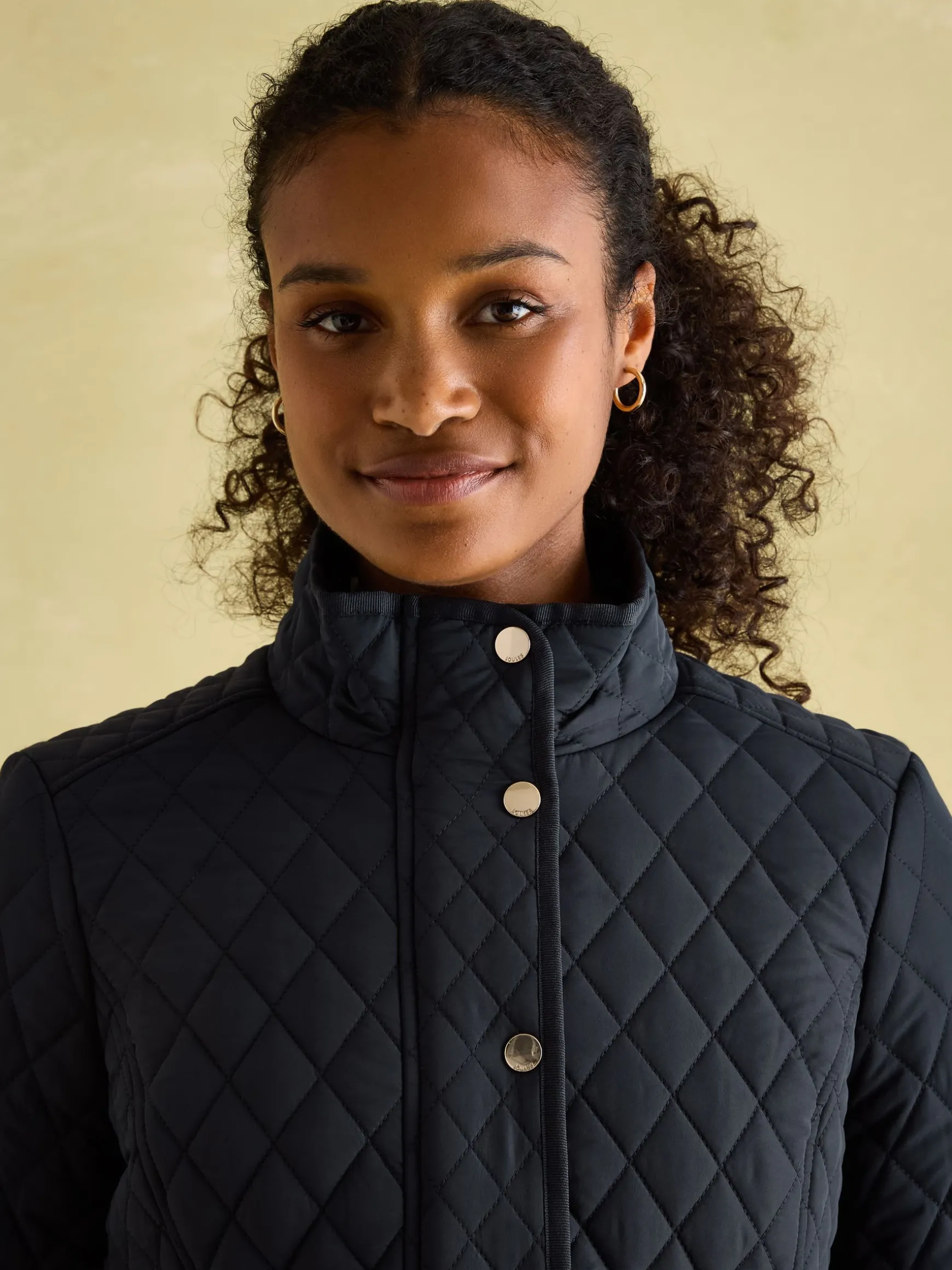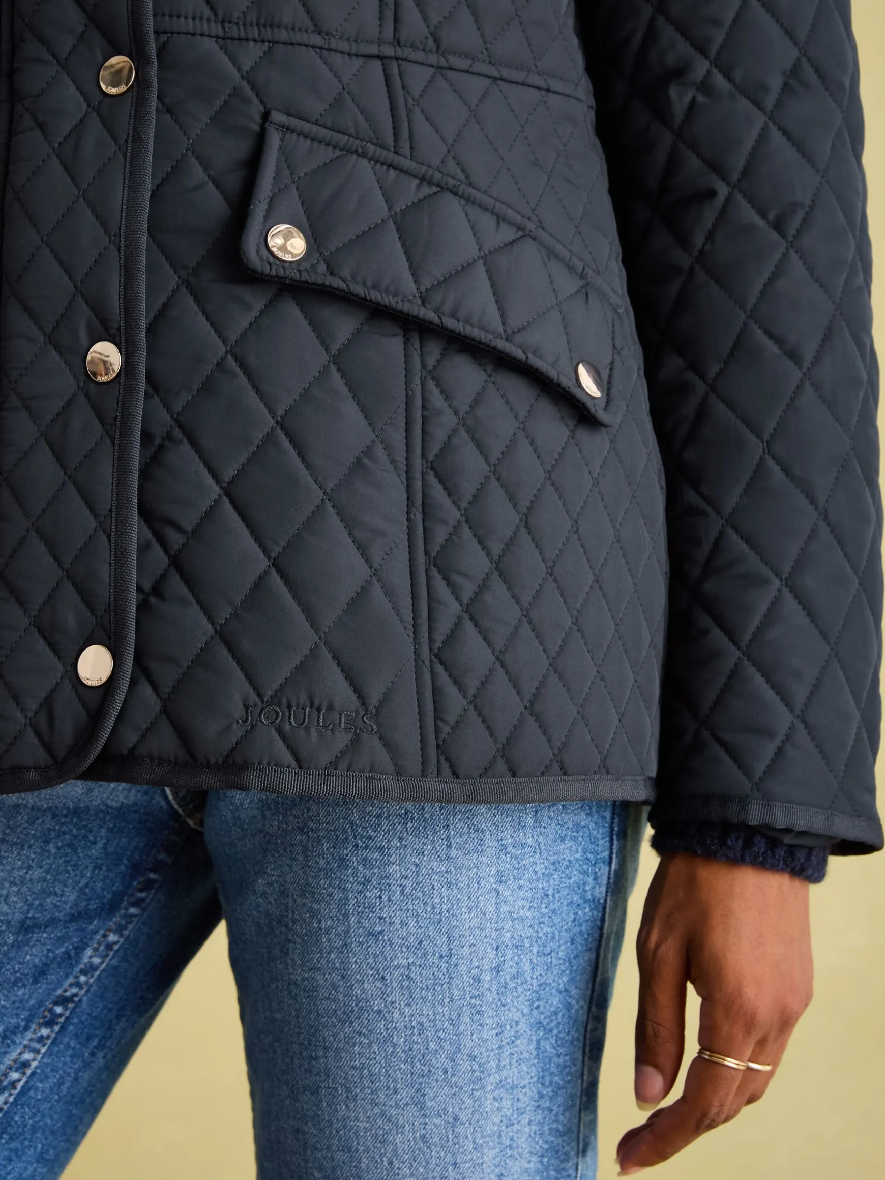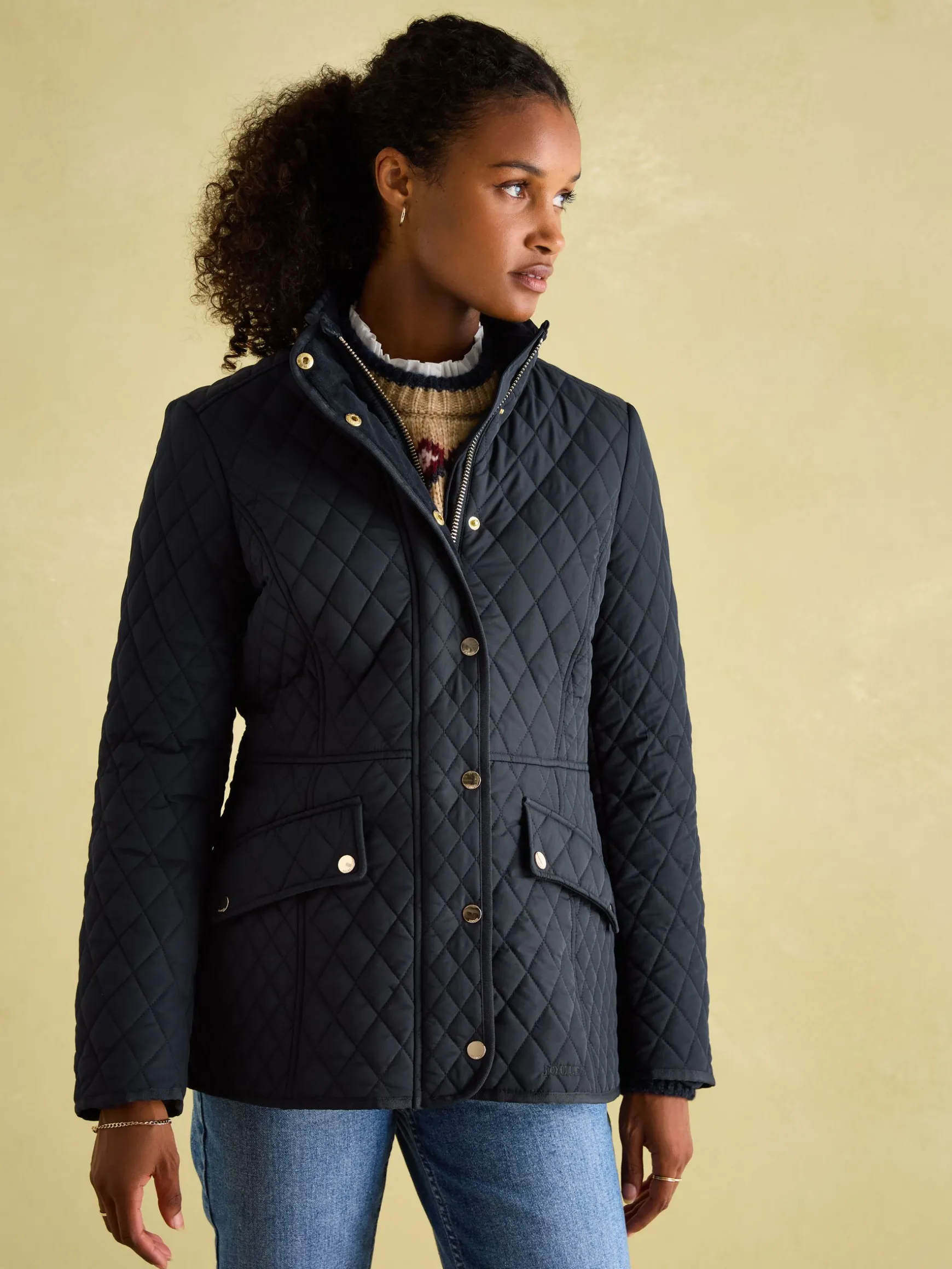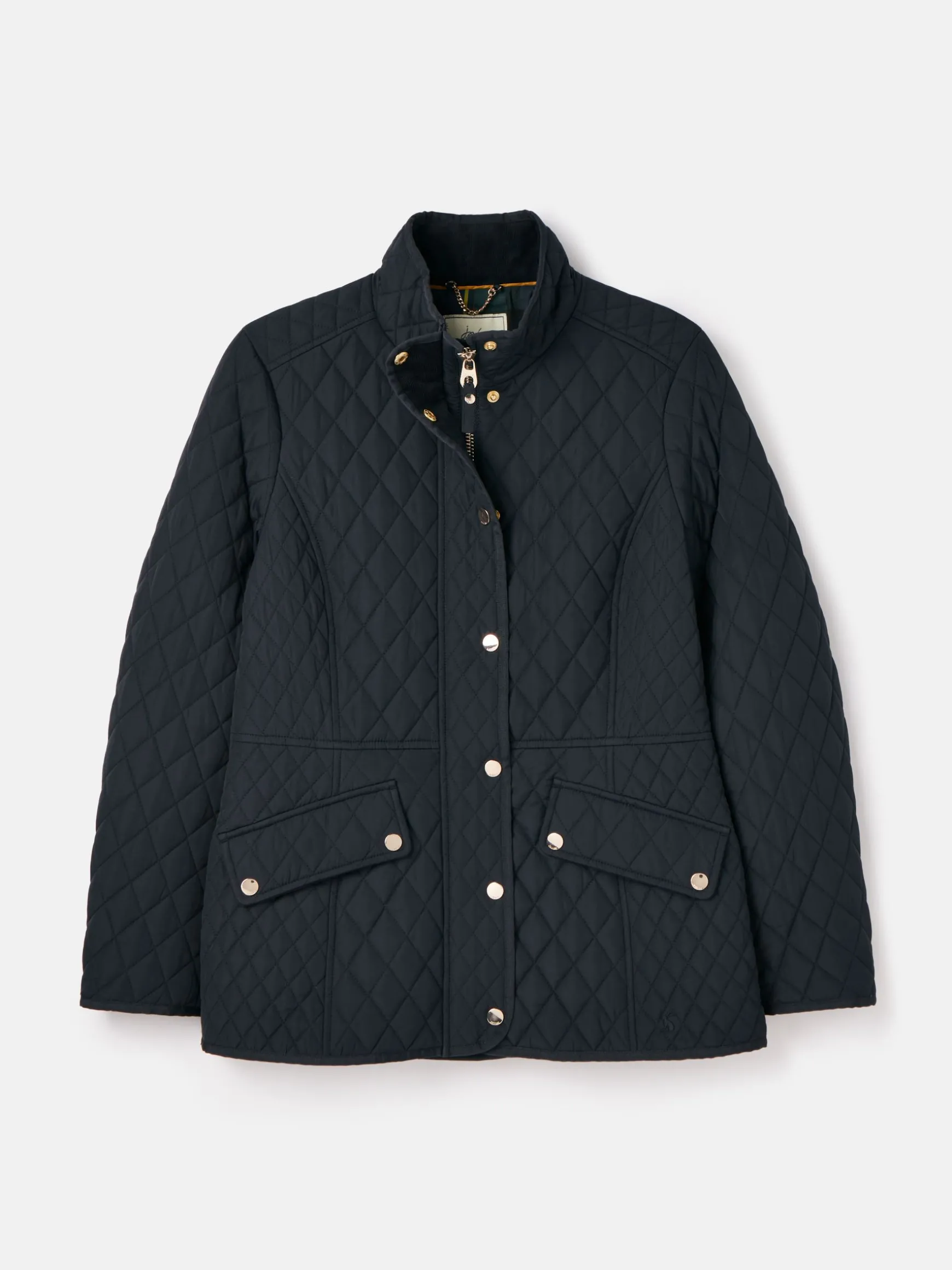 If you’re looking for a jacket that’s as much a statement style piece as it is a practical piece of outerwear, look no further than our Allendale quilted jacket. Crafted from hardwearing showerproof fabric that makes it perfect for light bursts of rain, our designers have added heaps of details that make this coat iconic. There’s a corduroy insert to the funnel neck, cleverly cut seams to flatter the waist and high shine popper details to the hips, cuffs, waist and back for movement and breathability. Inside, there’s a half-check lining for an extra touch of eye-catching charm, even when you’re not wearing it. Diamond quilting. Showerproof. Zip and popper fastening. Funnel neck with a cord insert. Half check lining. High shine trims. Back vents with poppers. Two angled front pockets with cord trims. Hare embroidery to front and Joules script to arm. Length: 72cm (based on a UK size 12).