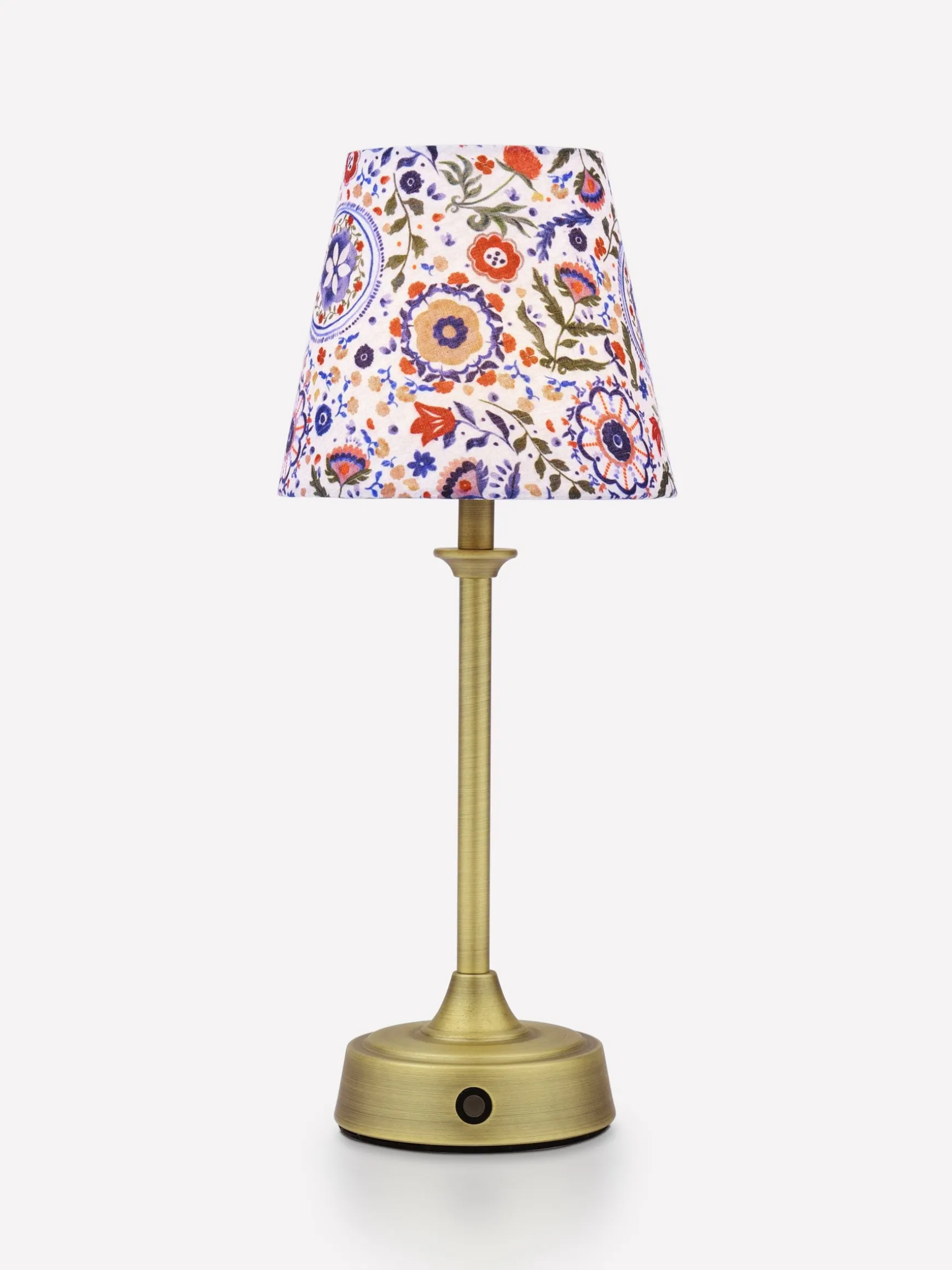 With a print that immediately draws attention, the Apsley lamp is a bold and beautiful interior choice. Its re-chargeable LED design means it is wire-free offering you the opportunity to quite literally light up any space in the home, giving you full creative freedom. The stand and base are made from a chic matte antique brass that suits all homes and has a classic tapered lamp shade adorned with a hand-drawn floral print. Picture it on your desk providing the light while you work on that novel you always said you’d write.nnRe-chargeable with a plug-in adaptor nMatte antique brassnPrinted tapered lamp shadenDi: 120mm x H.245mm