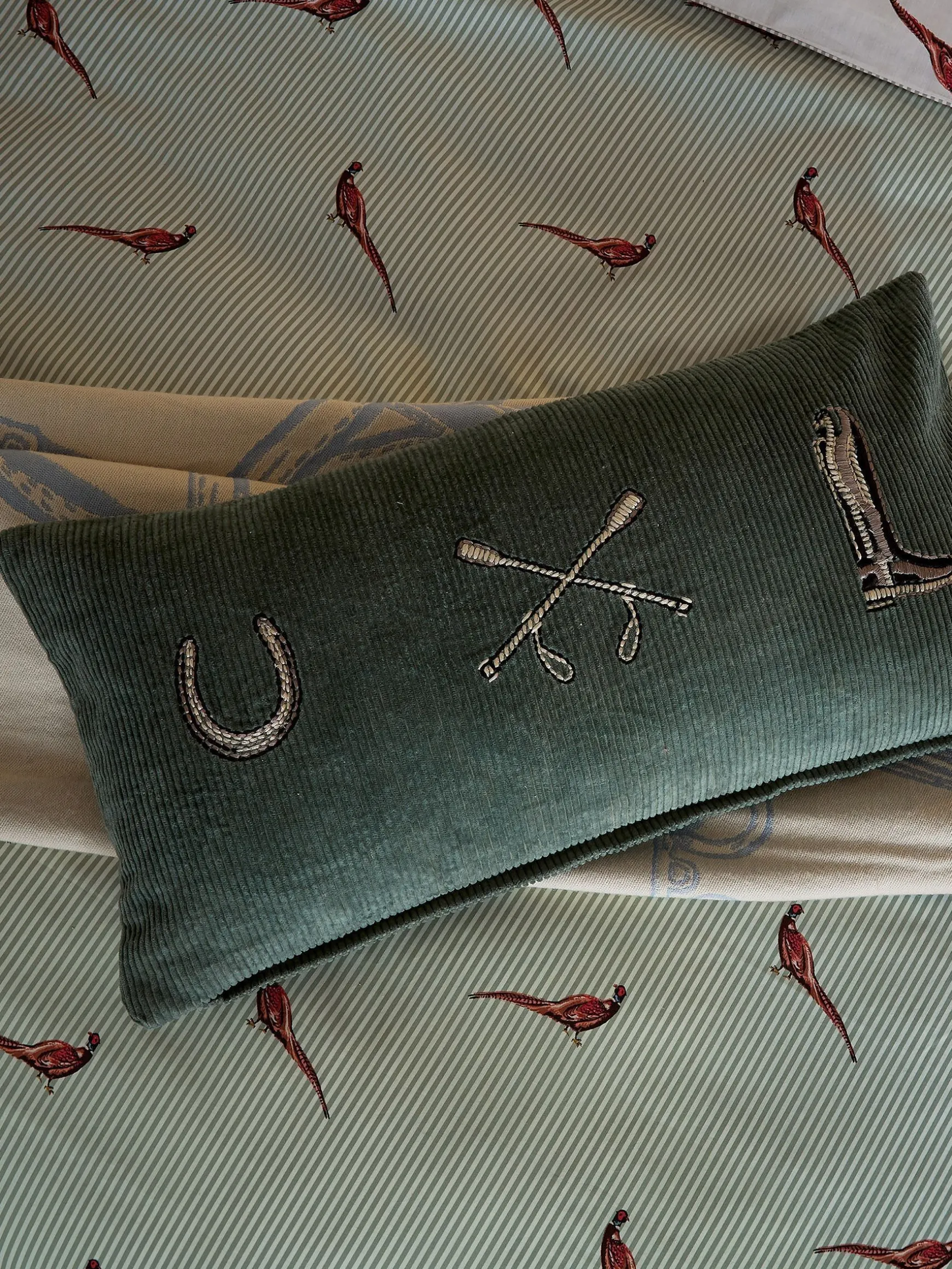 The Back to the Country cushion is a fitting home accessory for any equestrian enthusiast. It’s made from 100% cotton corduroy in a heritage green colour creating an authentic country feel. As a nod to the equine world, it features beautiful embroidery of a horseshoe, crop and riding boot for an opulent touch and has a plain dye reverse. Its long, rectangle shape makes it a versatile piece that can be used as a focal point on your sofa, bed, armchair or windowseat. 100% cotton corduroy. Equestrian embroidery to the front. Plain dye reverse. Dimensions: 30 x 60cm. Cushions come un-filled.