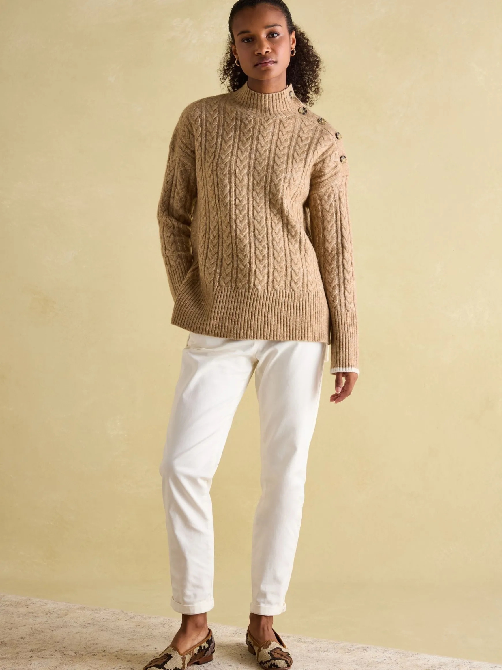 Be the first to review “Betsy Camel Button Shoulder Cable Jumper” Cancel reply