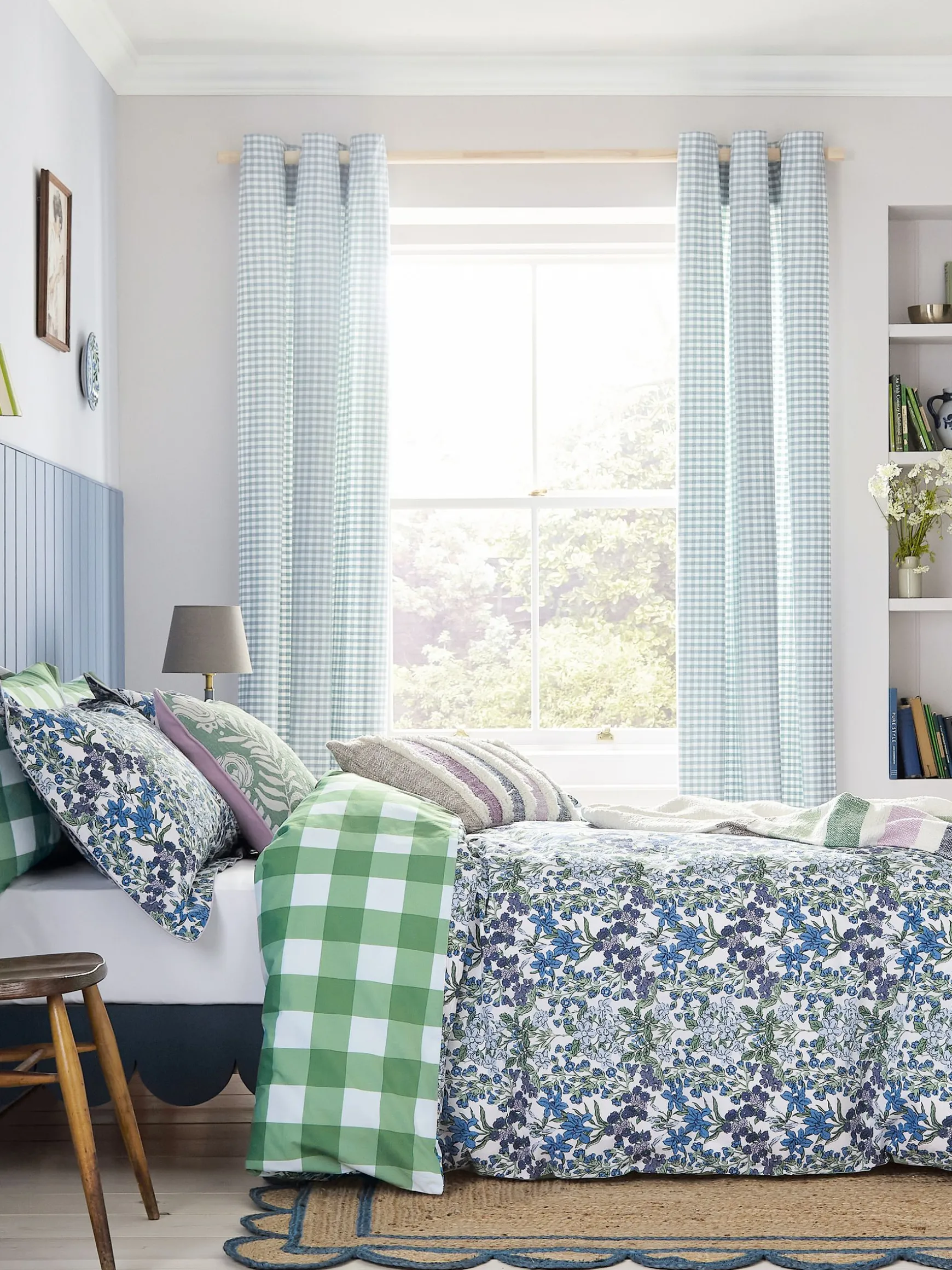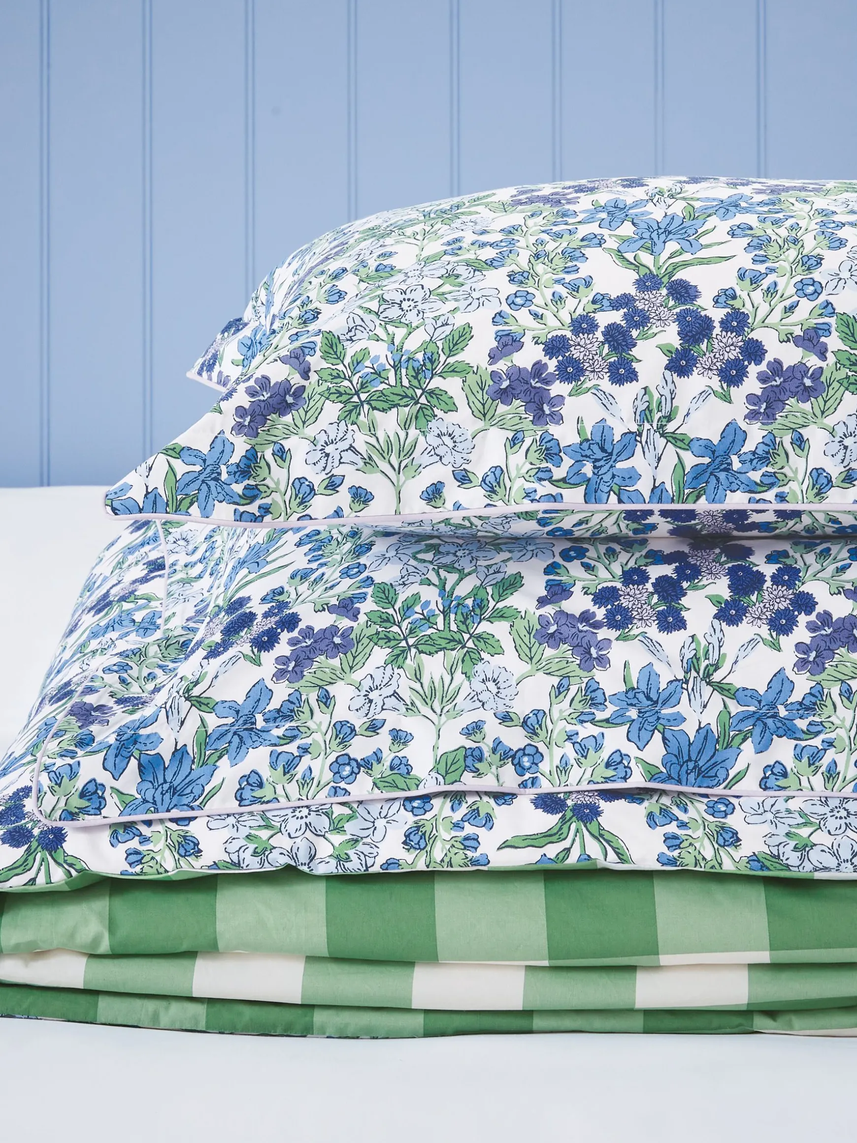 For our Arts & Crafts Bedding Set, our designers were inspired by sunny afternoons spent whiling the day away in an English country garden. The ditsy vintage-style floral print has been hand-painted in varying hues of cobalt blues and vibrant greens, and the reverse is a jumbo green gingham, reminiscent of picnic blankets spread out on the freshly-cut lawn. This set comes with two matching Oxford pillowcases (single beds come with one) and can be complemented by additional standard pillowcases sold separately.