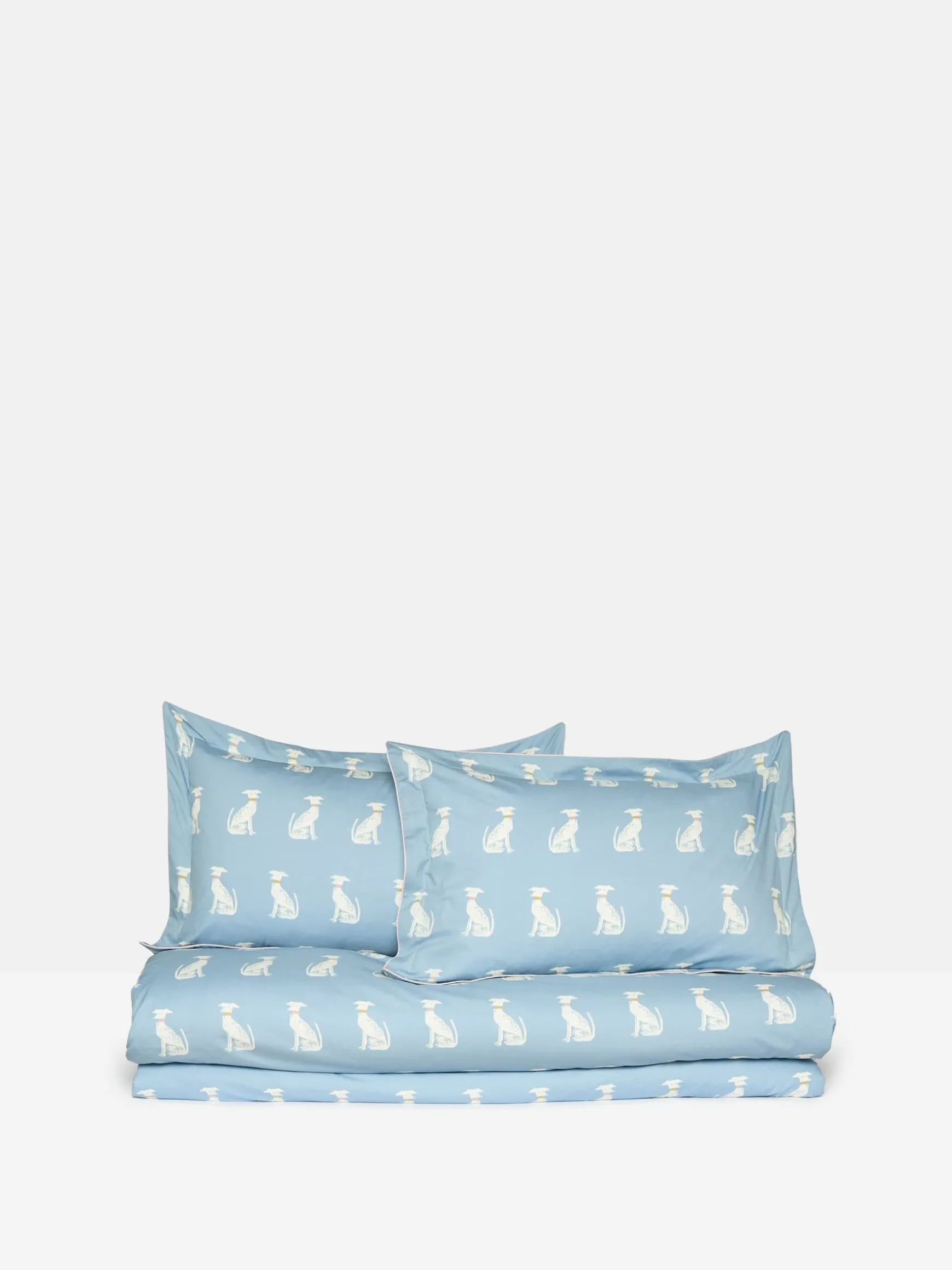 If you don’t already sleep with your four-legged friend at the end of the bed, this bedding set is the perfect way to add a little canine charm to your bedroom (without the risk of muddy paws). This playful print features an all-over block print of a curious white hound on a fresh, sky blue background. As an extra touch of charm, we’ve added a subtle pop of colour with alternating pink and gold collars on each dog. The reverse is a classic ticking stripe in crème and taupe. This set comes with two matching Oxford pillowcases with antique gold piping (single beds come with one) and can be complemented by additional standard pillowcases sold separately.