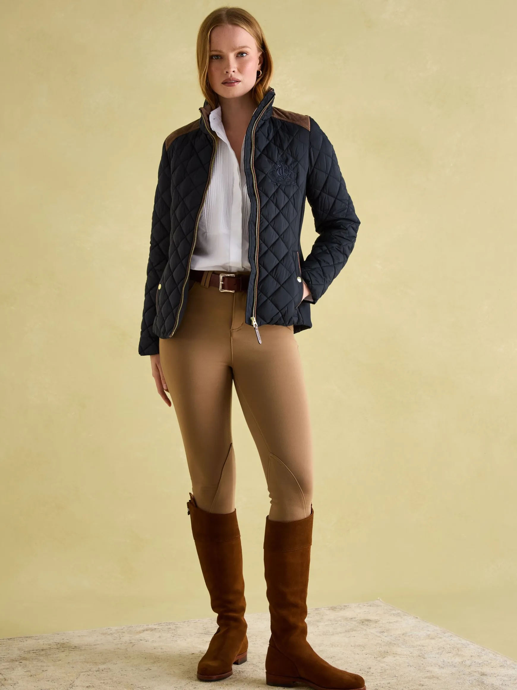 A true celebration of our rural heritage and style, this coat really does go the extra country mile. Showerproof (meaning a little rain won’t stop play) and in a traditional diamond quilt pattern, it comes in a flattering silhouette and is home to well-considered detail and functional features. Suedette details offer a little change in texture, the intricate crest embroidery is a reminder of the quality and craft and the quilted back belt is further proof that this coat is more than just a coat – it’s an expression of true countryside style. Showerproof. Diamond quilted. Funnel neck with suedette lining. Zip fastening. Suedette on shoulders. Crest embroidery. Adjustable back belt. Front pockets with popper fastenings. Curved hem with lower back