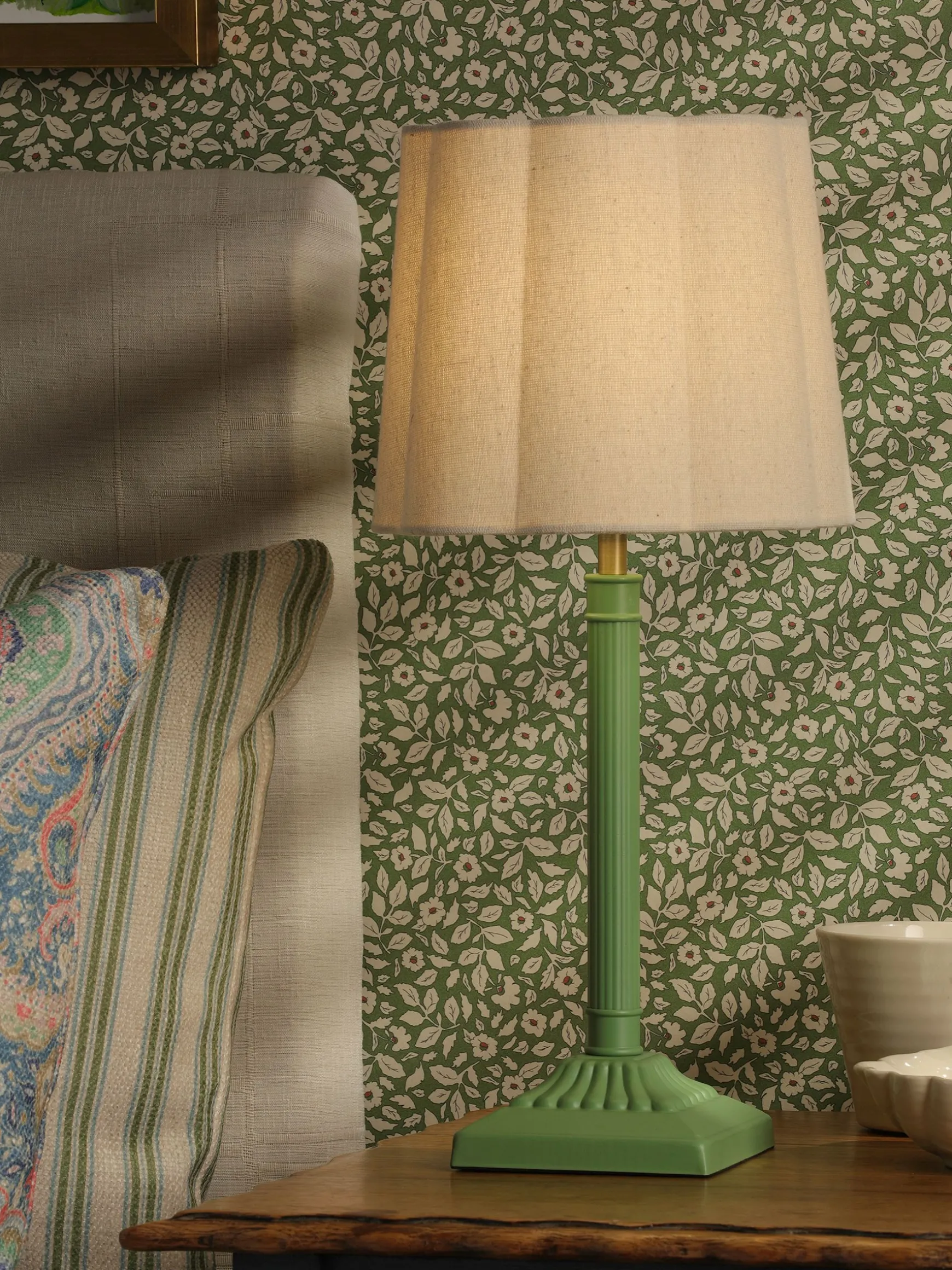 From bedside to bookcase, the Buscot table lamp will enhance any space in your home. Combining timeless style and functionality, it’s a piece that will look just as good in years to come as it does today. A decorated long column stand and square base with a green matte painted finish creates stand-out appeal. The neutral coloured linen lamp shade is scalloped for a nod to the art deco era and creates a cosy glow against the wall. Just add an early night and the latest romance bestseller. nnColumn stand with square basenDecorated matte painted basenLinen scalloped lamp shade nDi: 200mm x H.430mm