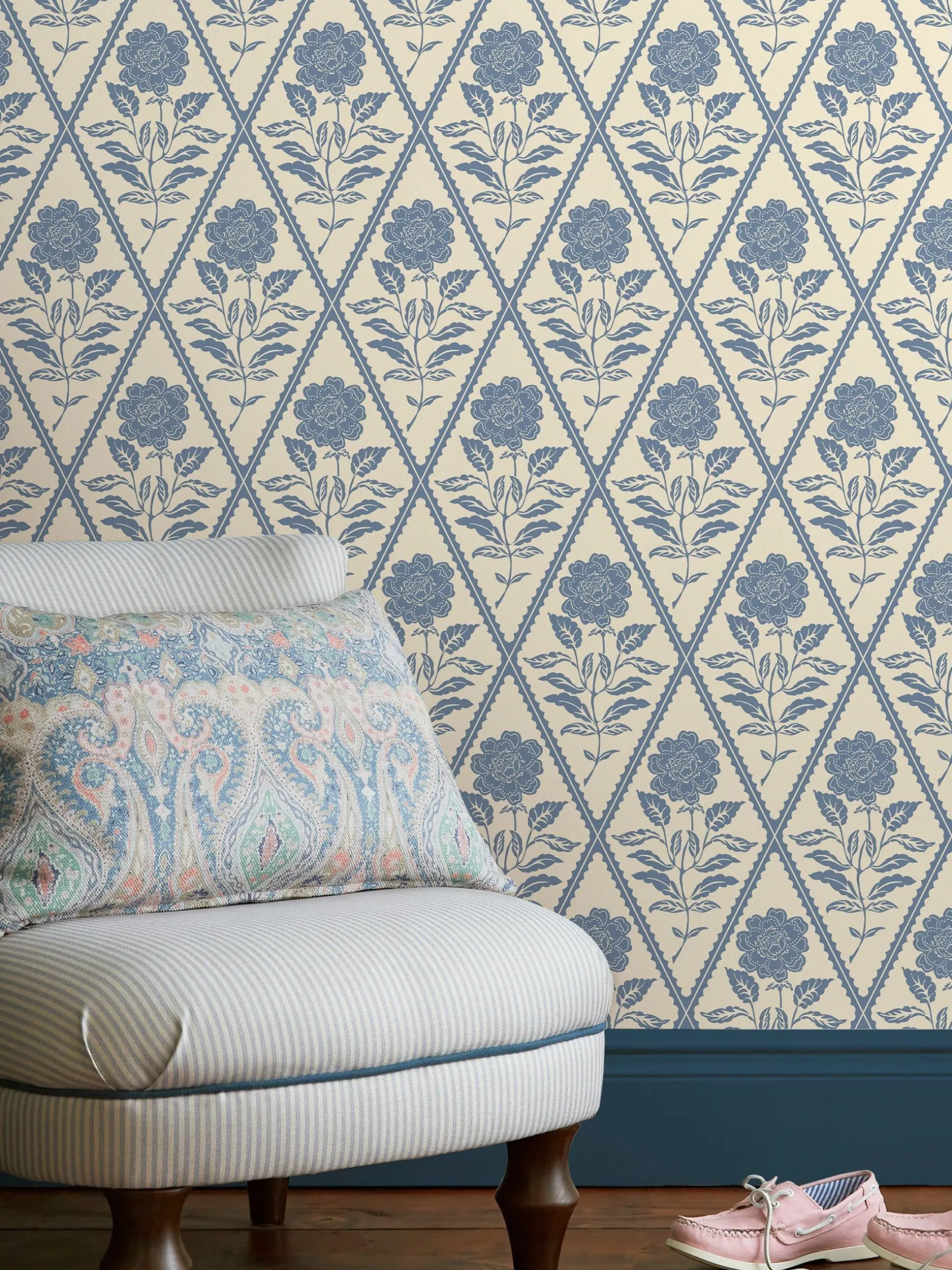 Created with a traditional block print method and using a two-tone colour palette, this wallpaper will add a bold touch to your home. The block print blooms are housed within diamond trellis and repeated to create a large-scale print, reminiscent of Mediterranean home decor. The ocean-blue colour set against a fresh cream background ensures a versatile look that will suit homes both new and old, big and small. Designed to make refreshing your walls a breeze, this is an easy-hang, paste the wall wallpaper, so you can elevate your space quickly and simply. This is a romantic design that is just calling to be hung in the master bedroom.