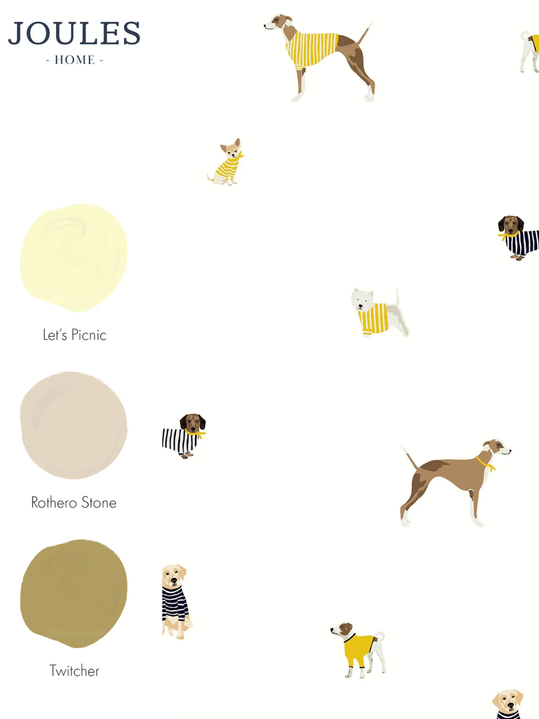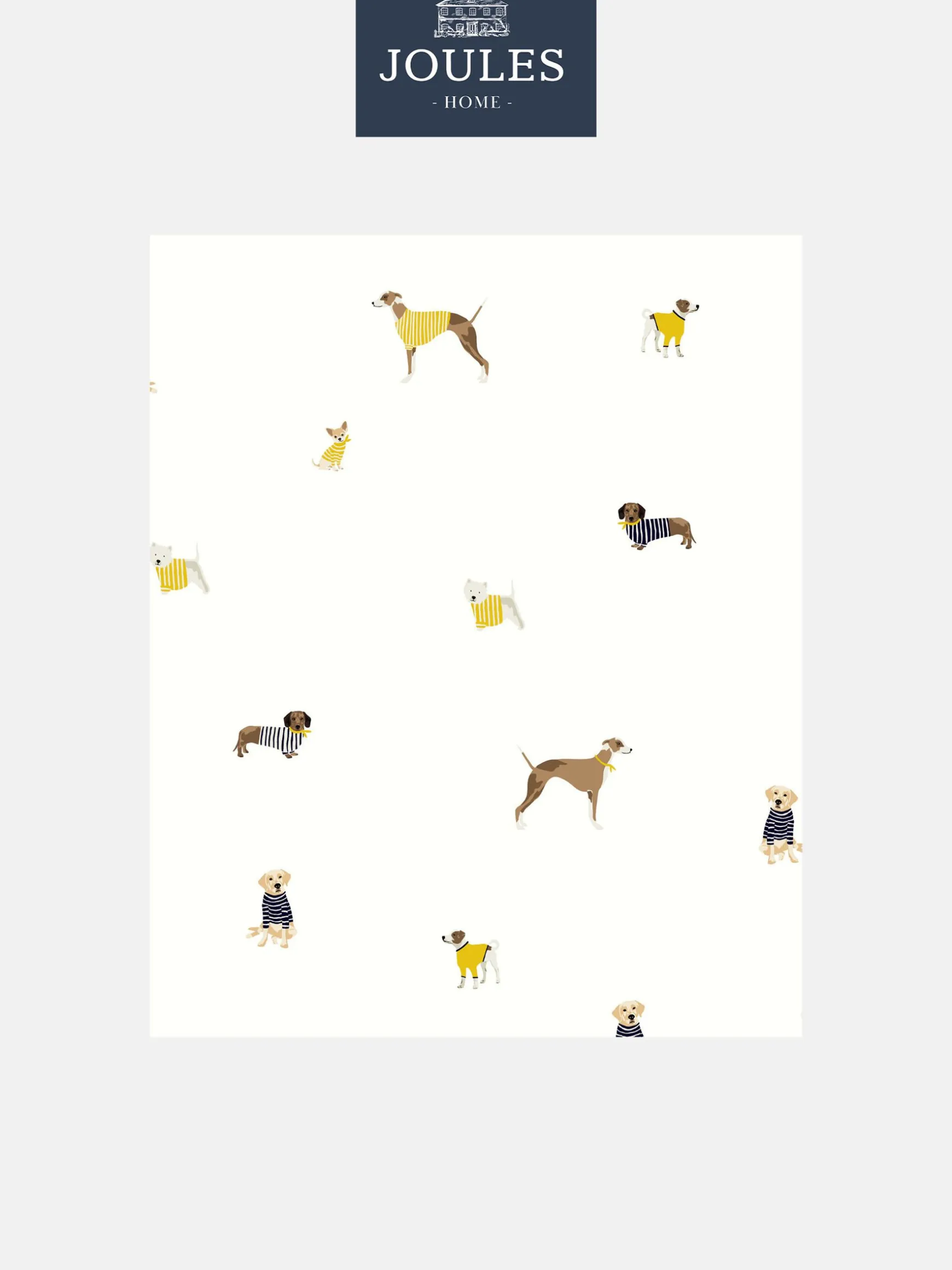 Whats not to love about a mixture of four legged friends in Joules iconic Harbour Tops? Add this wallpaper to any room in the home for a homely and warm welcome, with tones of blue and yellow sat upon a creme background this charming wallpaper is bound to brighten your day. Printed on a matt substrate for a contemporary look and feel. This wallpaper is also pastethewall, making it easy to hang. Pattern Repeat: 73.5cm, Drop Type: Offset.