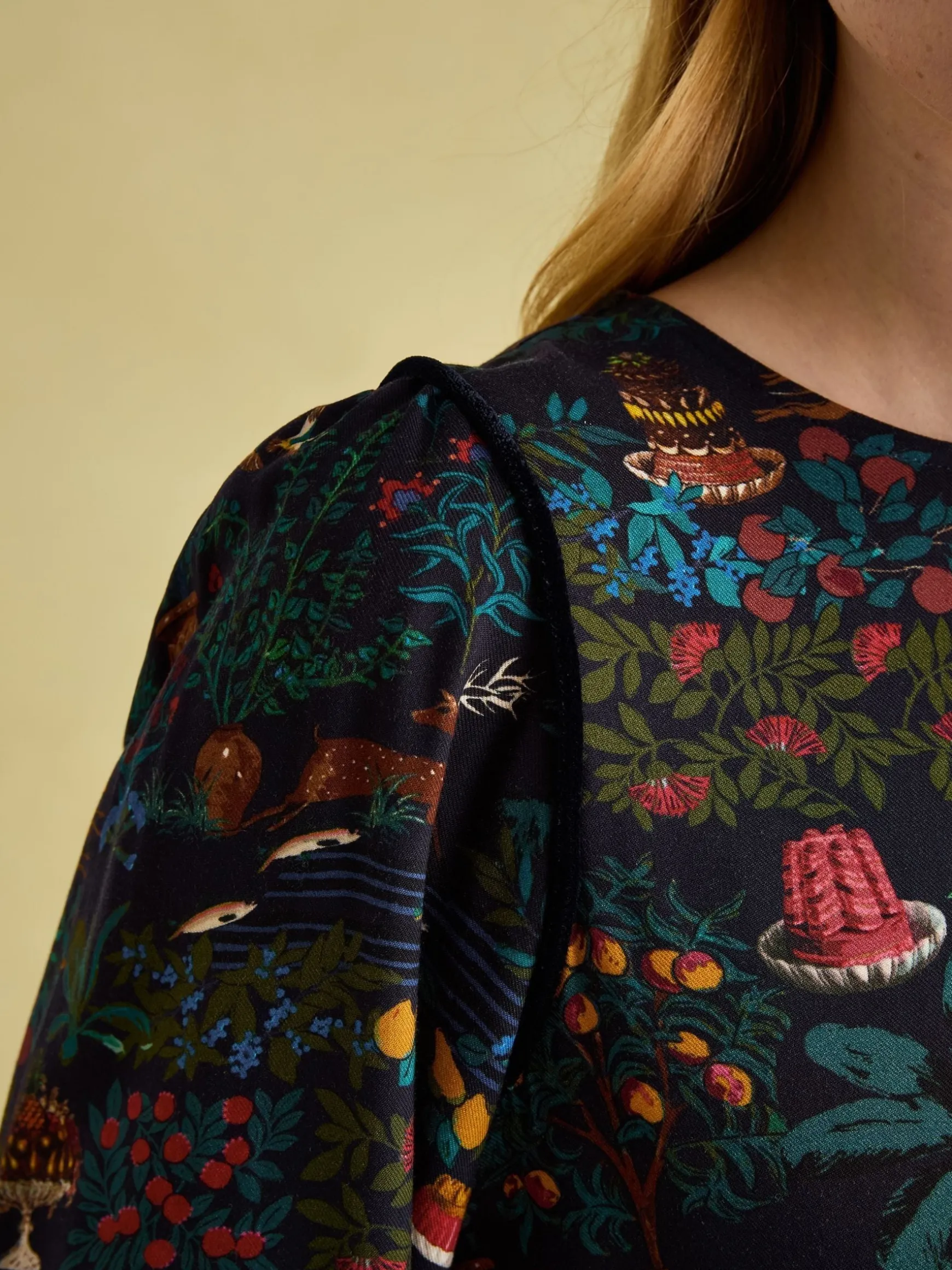 Pull out all the stops this season with the Georgina dress. Easy to dress up for parties and occasions, or dress down for the day-to-day, it’s the versatile piece your wardrobe needs. A round high neck, long sleeves with gathered shoulders and a maxi length work together to create a truly elegant silhouette you’ll never tire of wearing. Other elevating details include buttons to the bodice, shirred cuffs and waist for a flattering cinch and pockets in the side seams. An elaborate hand-drawn print adorns it which has been designed by our in-house print team, which means you won’t find it anywhere else. Maxi length. Long sleeves with gathered shoulders. Shirred cuffs. Shirred waistband. Round neck. Four fabric-covered buttons. Pockets in the side seams. Hand-drawn print.