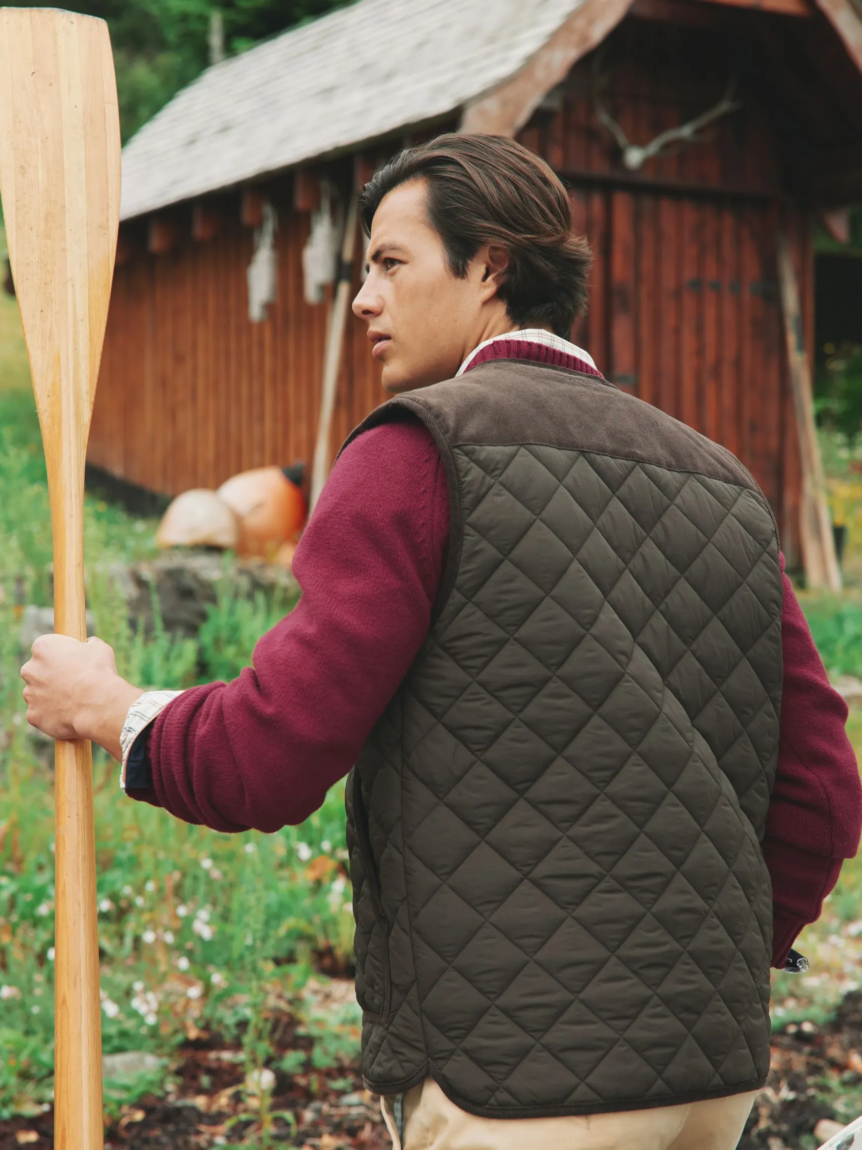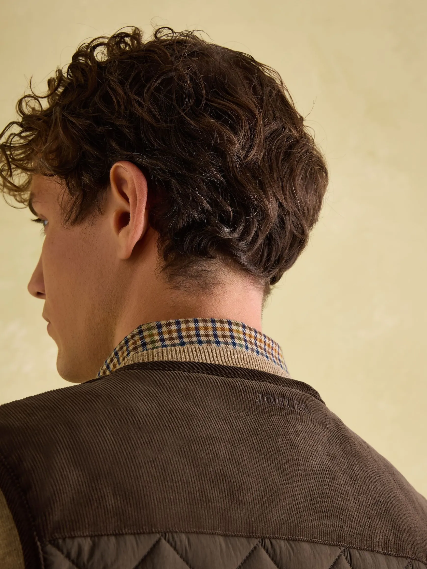 Cut a gentlemanly look with this lightweight gilet, designed to remain in your wardrobe all year round. Featuring classic diamond quilting (inside and out) and filled with flat wadding for warmth, it’s a style synonymous with the British countryside. On the outside it has a popper fastening, corduroy trims and two front pockets, while inside boasts a cotton checked lining. Its collarless design makes it great for layering over your most-worn checked shirt. Diamond quilting (inside and out). Cotton checked lining. Flat wadding. Collarless. Popper fastening. Front pockets with corduroy binding. Corduroy shoulders and back yoke.