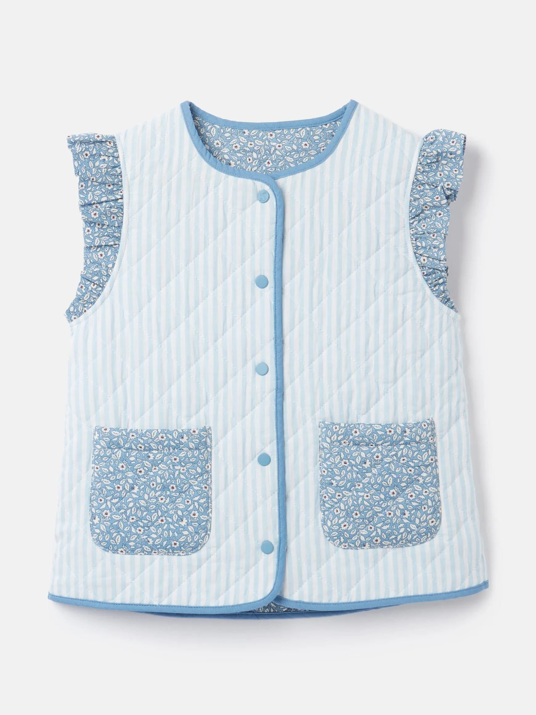 Positively perfect in every way, the Raye gilet will be your little one’s favourite thing to wear. Its reversible function means you get two styles in one, and gives your mini fashionista the choice of flowers or stripes. Both sides are quilted and filled with flat wadding, fasten via a popper placket and feature elegant frilled capped sleeves. Two patch pockets allow room for stashing their very important items and it’s finished with binding to the neck, placket and hem. Cotton. Reversible. Quilted and filled with flat wadding. Popper fastening. Capped frilled sleeves. Two front patch pockets. Binding to the hem, placket and neck. Stripe and floral hotch potch design.