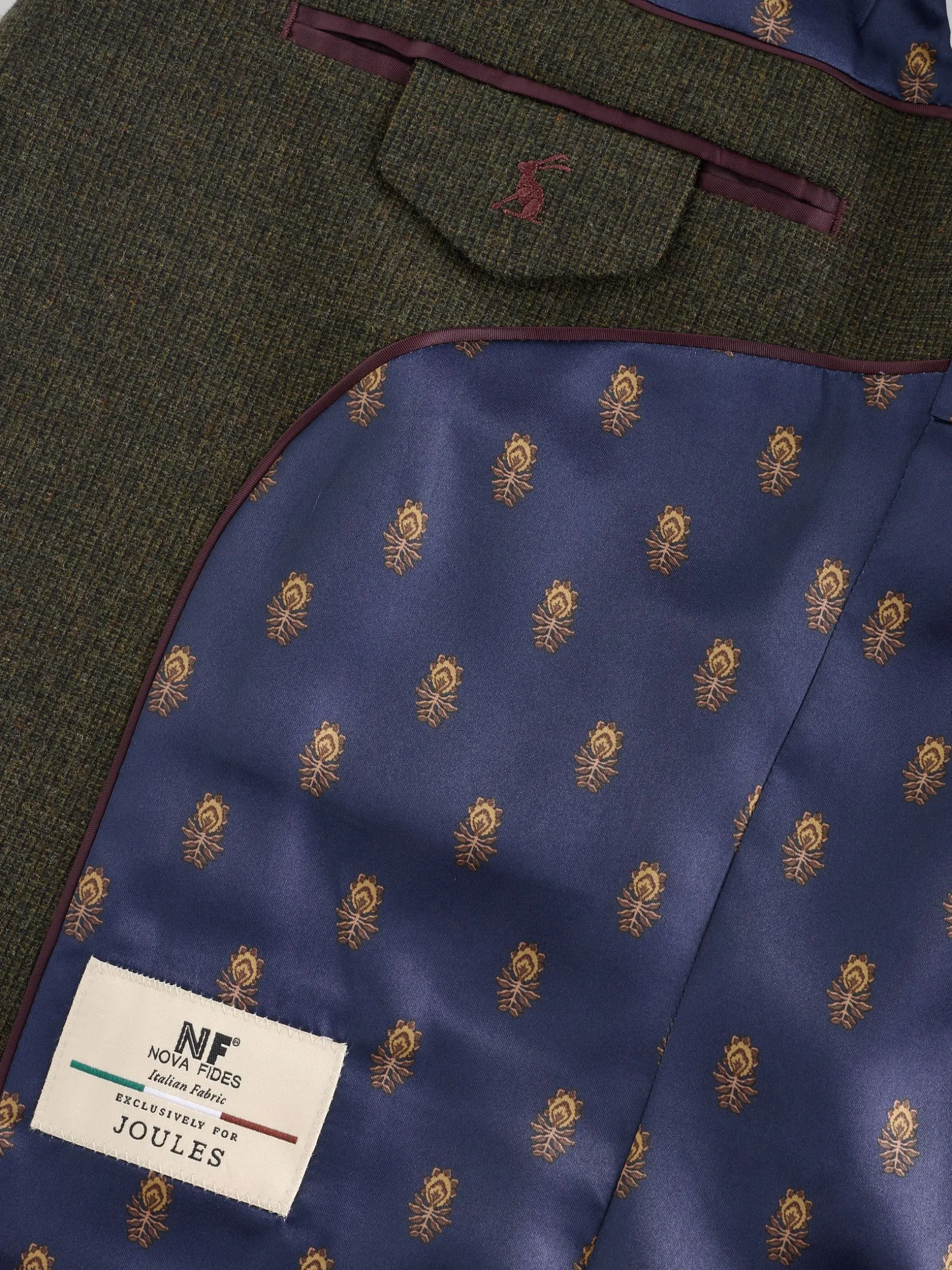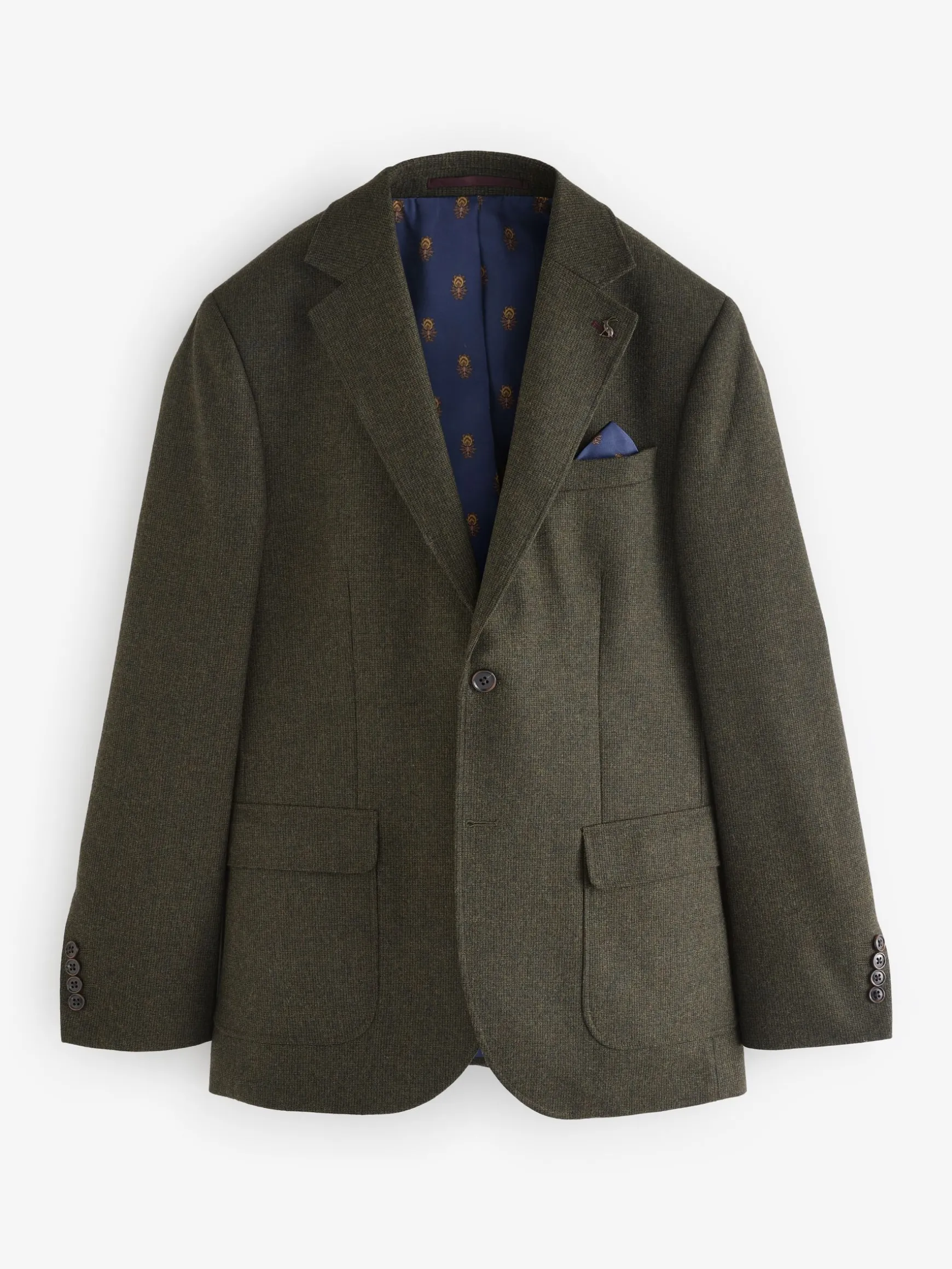 Arrive at any event looking dapper and exuding confidence with this timeless suit jacket. One part of a three-piece ensemble, it’s tailored to an unfussy slim fit and cut from soft Italian pinhead fabric. It has a simple yet stylish look with a single breasted design, a two button fastening and notch lapel collar complete with a detachable Joules hare pin. Two flap pockets to the front are a practical touch, while a single pocket to the chest with a stitched-in satin pocket square adds flair. Inside there’s a printed satin lining and plenty more pockets. Wear it with a classic white shirt and chinos or invest in the full three-piece suit with the matching waistcoat and trousers.nn- Slim fitn- Italian pinhead fabricn- Single breastedn- Notch lapel collar with detachable Joules hare pinn- Printed satin liningn- Two faux horn buttons to the frontn- Kissing buttons to the cuffsn- Single chest pocket with pull-out pocket squaren- Hidden branded detailing under the collar n- Two flap pockets to the front