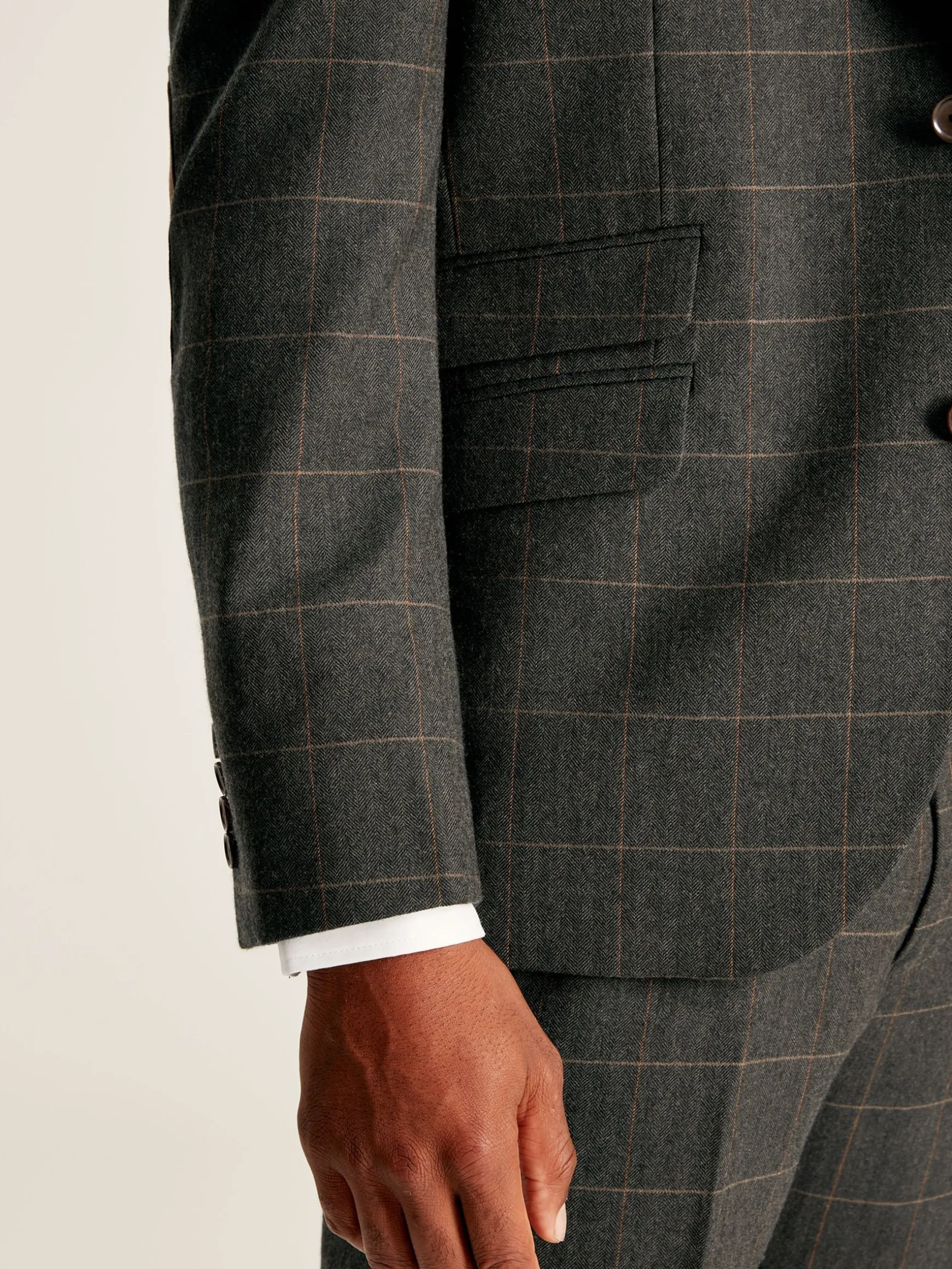Stand out from the crowd in our heritage inspired windowpane check suit jacket. A timeless addition to your wardrobe, this smart jacket is crafted from 100% wool woven in Britain and boasts a classic two button fastening, notch lapel and flap front pockets. The jacket is finished with delightful added details, including elbow patches and a printed lining to elevate your look. Woven at Alfred Brown mill in Yorkshire, Great Britain.