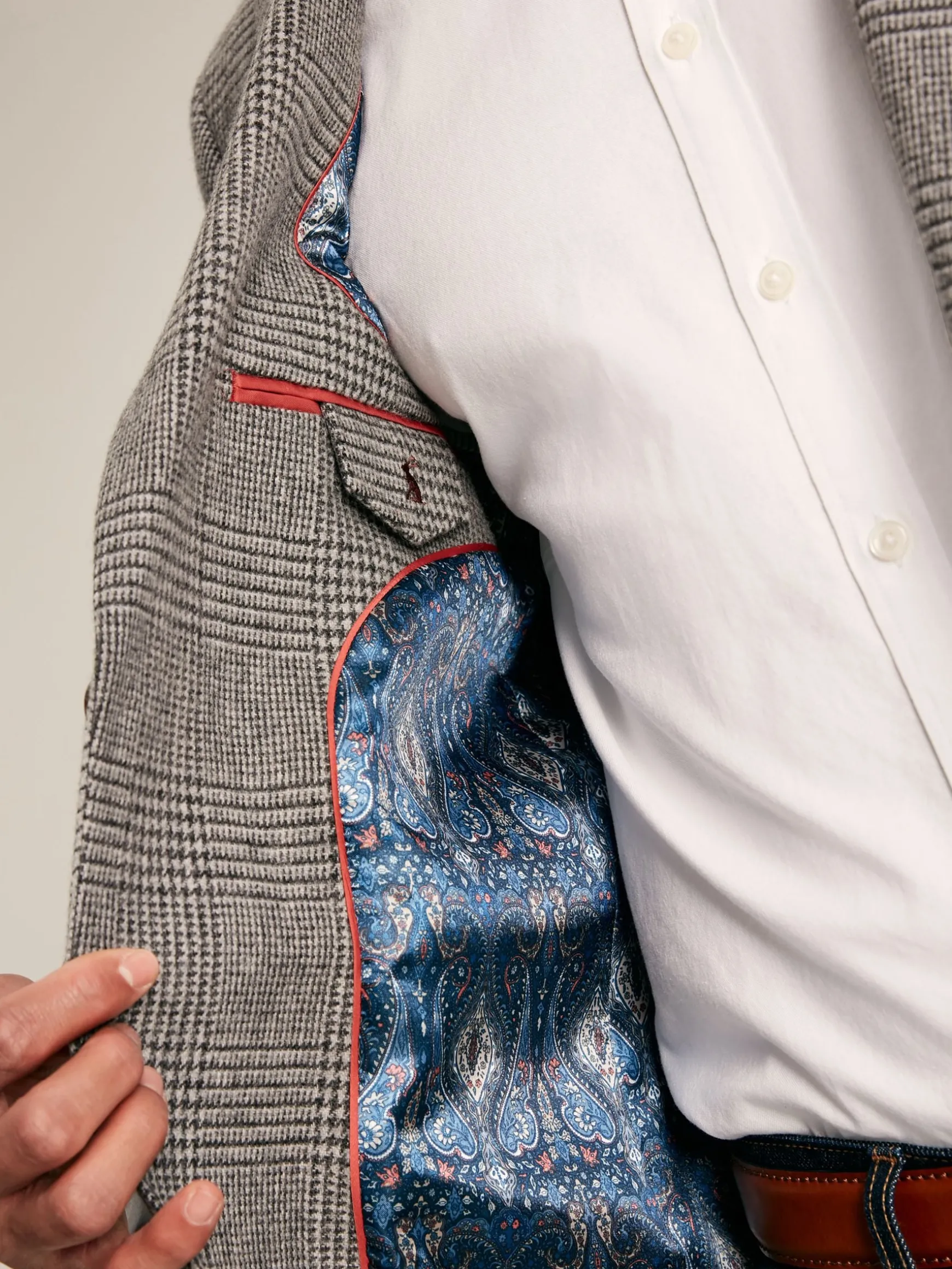 A nod to preppy style, this windowpane check blazer is a style for the gent that is unafraid to make a statement. It has a cool and collected slim fit and is made using a fine Italian wool blend fabric woven at the Nova Fides Mill in Prato, Italy. While this single breasted piece gives off a laid-back look, much attention has been paid to the details. It has a notched lapel collar with a detachable Joules hare pin badge, kissing buttons to the cuffs and two large bucket pockets to the front. Inside is certainly not without its craftsmanship with a full paisley printed lining which matches the removable printed pocket square in the chest pocket. To continue the preppy-inspired look, pair with chinos (coloured ones for the bold) and boat shoes or loafers.