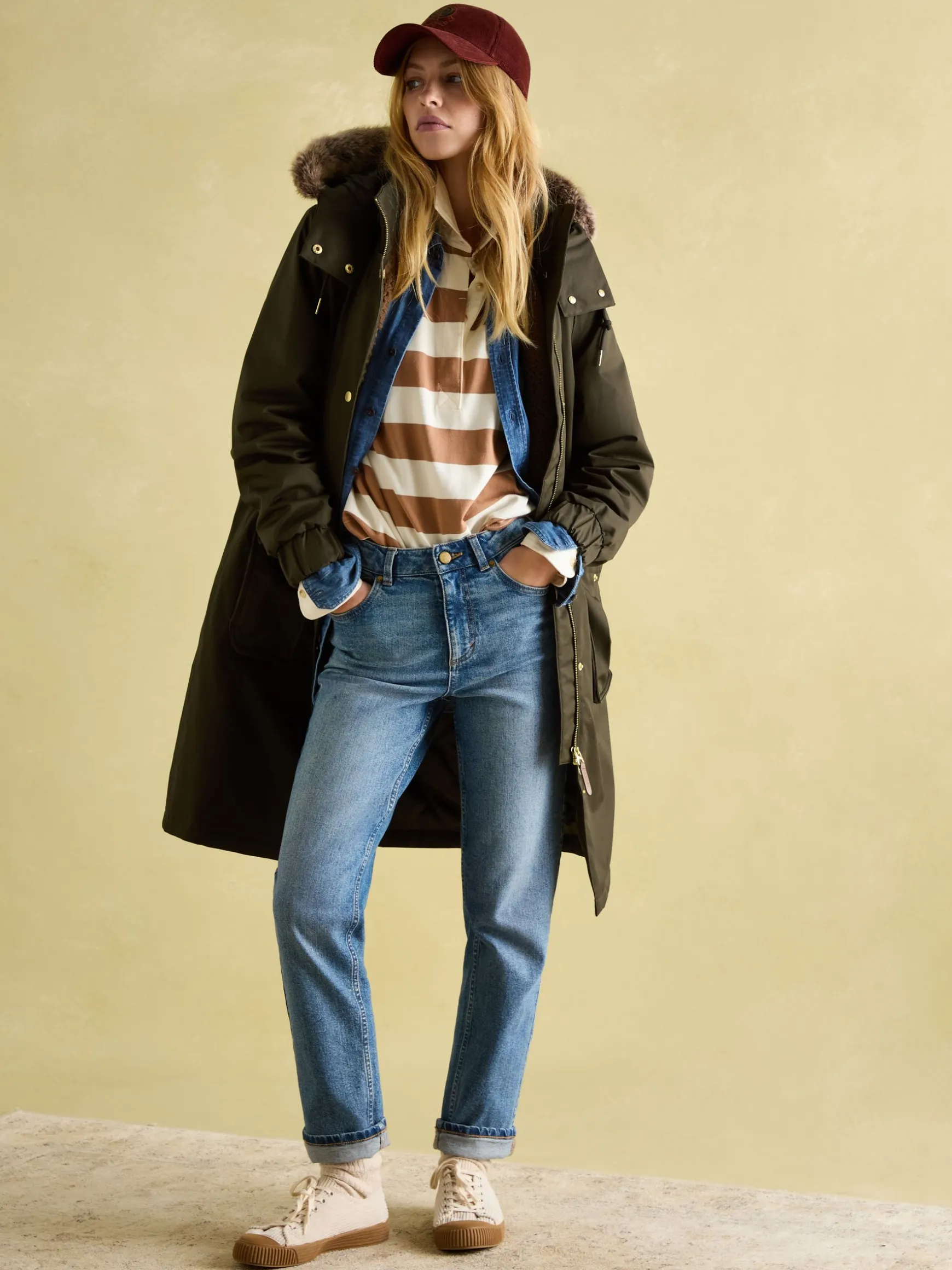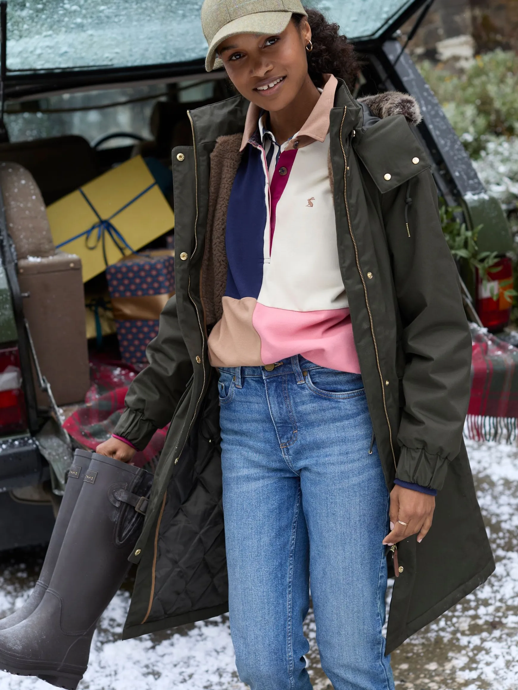 Harpsden Cosy Khaki Green Waterproof Fleece Lined Raincoat with Faux Fur Hood