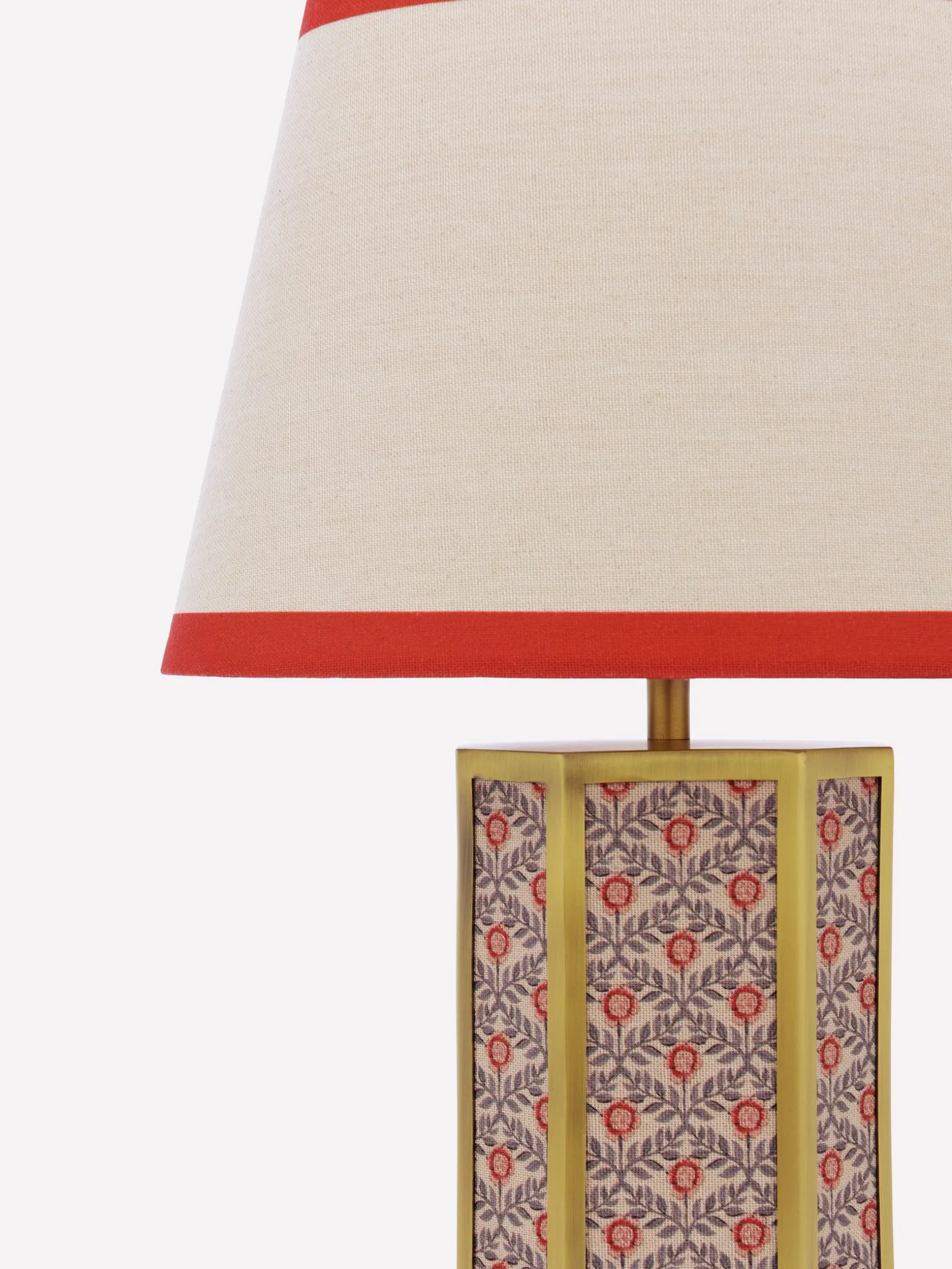 With the Helmingham table lamp creating a welcoming glow to the corners of your home, you’ll never want to turn the ‘big’ lights on again. This ornate piece combines a hexagonal matte antique brass base with printed fabric panelling and a claw foot for an opulent look that commands attention. The lamp shade has a classic tapered shape in a neutral colour and is finished with a coloured border that complements its base. Picture it nestled within a reading corner surrounded by your well-loved book collection.nnTable lampnHexagonal matte antique brass base with printed fabric panellingnClaw foot nTapered lamp shade with border nDi: 280mm x H.440mm