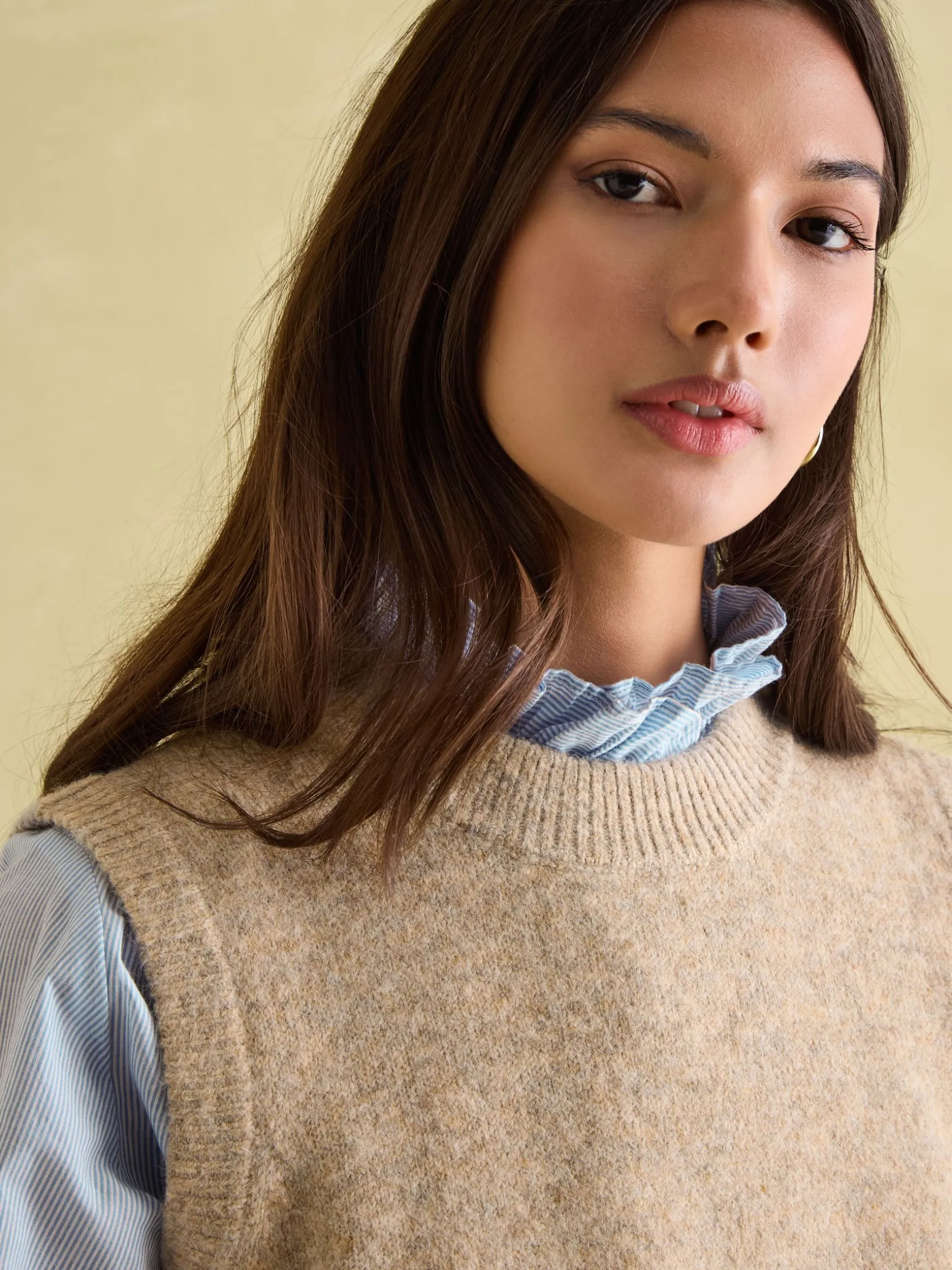 A knit you can wear now and later, the Holly vest is a versatile style to own. In milder weather style alone with chino or denim shorts and when temperatures drop, layer over a ruffle neck blouse of slim-fit top. It comes in an array of colours to choose from and is finished with a ribbed neck, hem and armholes. Knitted. Sleeveless. Longline. Ribbed neck. Ribbed hem. Ribbed armholes.