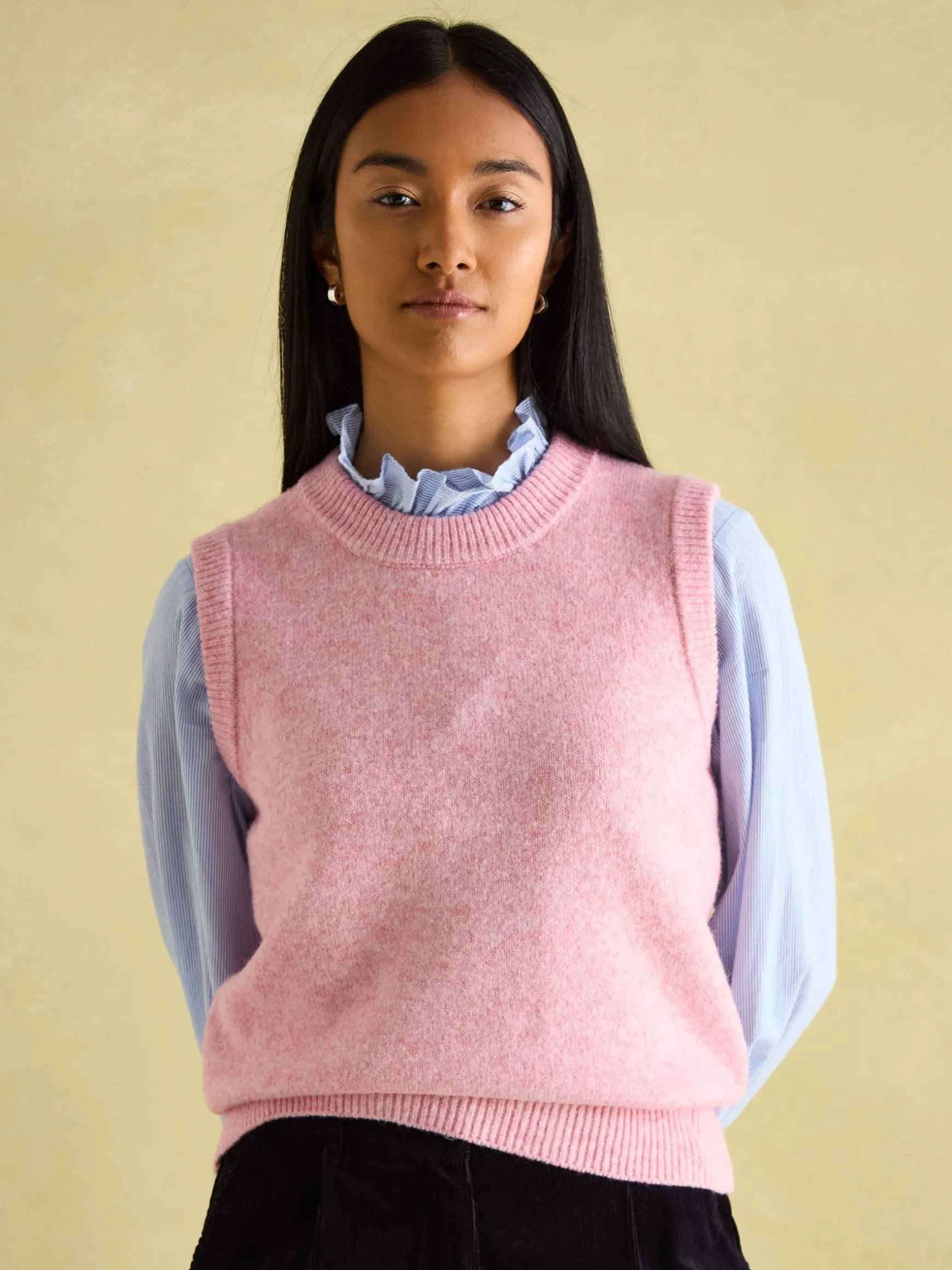 A knit you can wear now and later, the Holly vest is a versatile style to own. In milder weather style alone with chino or denim shorts and when temperatures drop, layer over a ruffle neck blouse of slim-fit top. It comes in an array of colours to choose from and is finished with a ribbed neck, hem and armholes. Knitted. Sleeveless. Regular fit. Ribbed neck. Ribbed hem. Ribbed armholes.