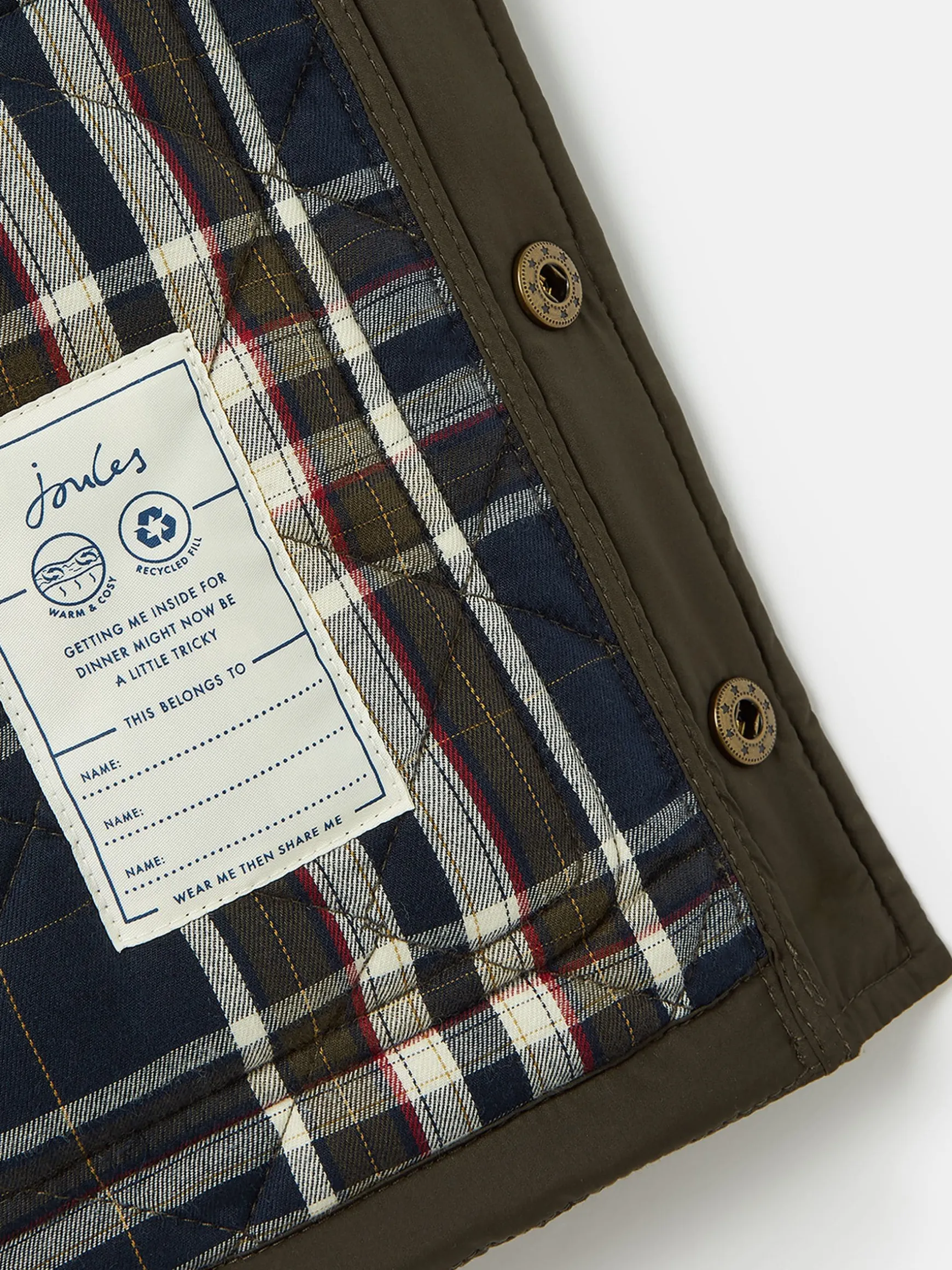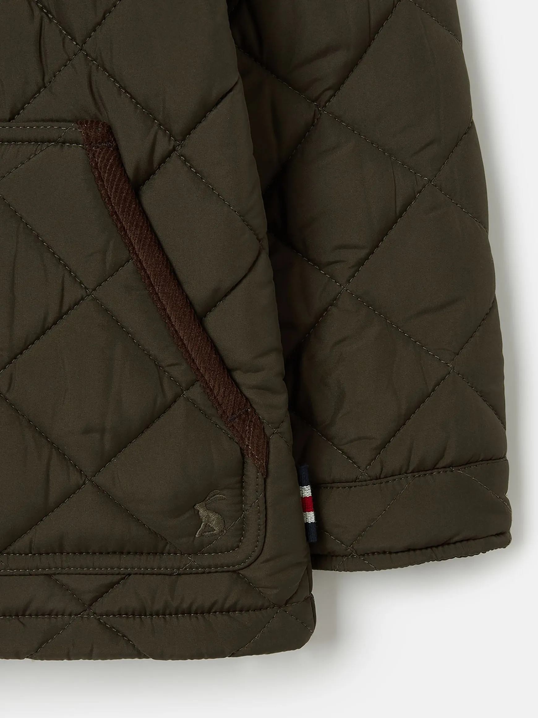 This countryside-inspired jacket is one for dapper little lads that love the outdoors. It has diamond quilting for a lovely layer of warmth, a contrasting quilted lining and two patch pockets to the front for stashing trinkets, treasures and cold hands. For an oh-so-grown-up look, we’ve finished it with antique-style brass poppers and corduroy details to the collar and pocket openings. Looking for the matching gilet style for this jacket? Just search for Hugo. Diamond quilting. Contrast quilted lining filled with wadding. Antique-style brass popper fastenings. Two front patch pockets. Corduroy trims to collar and pocket openings. Joules hare embroidery. Hanger loop to inside neck. Branded badge to sleeve. Striped tape to left cuff. Matching gilet available.