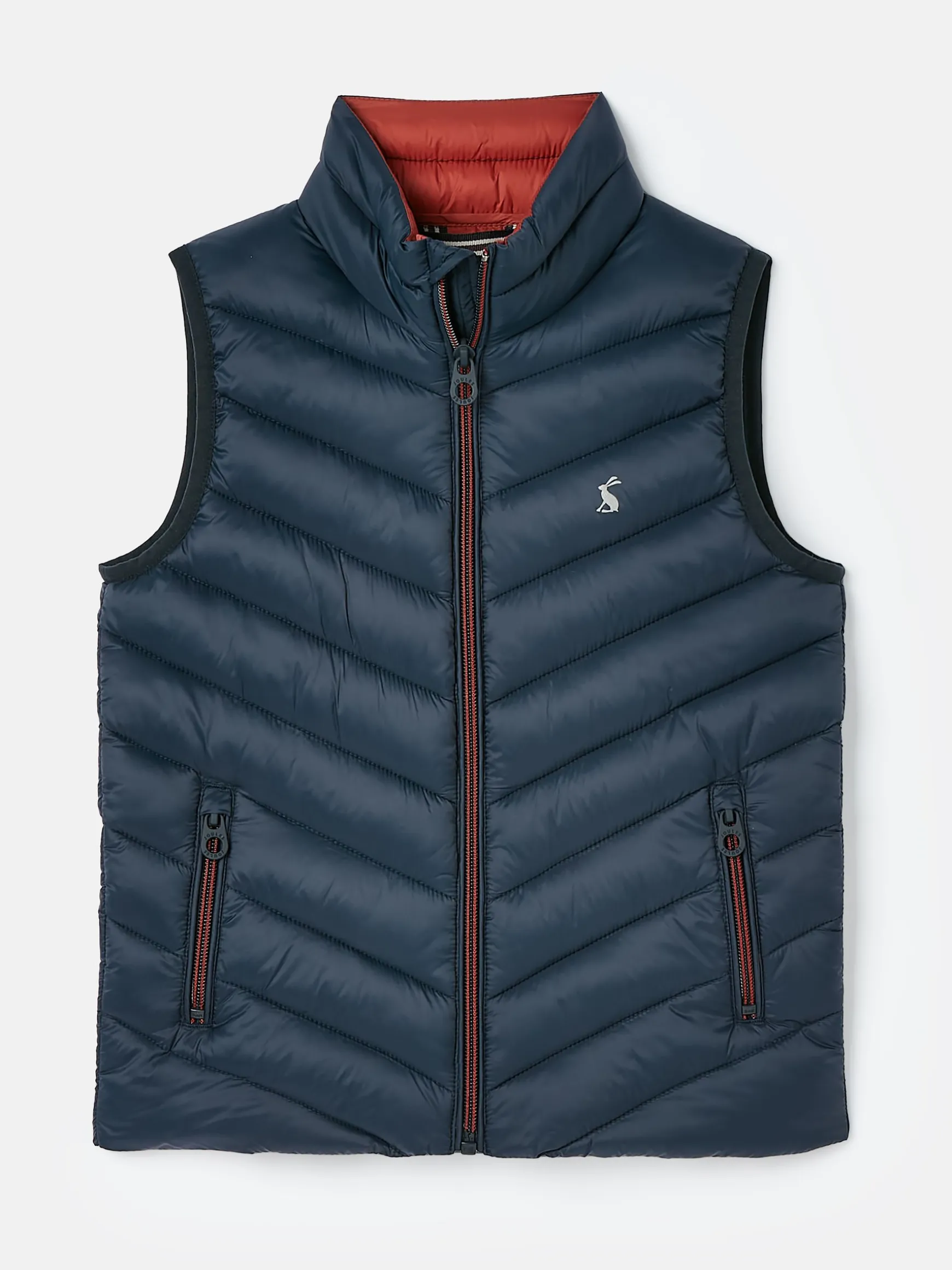 Our Crofton gilet is a wonder for your little one to have. The chevron quilting is padded with wadding inside and out adding a touch of warmth, while the showerproof fabric finish means even a spot of rain can’t stop a day outside. Other details include a zip fastening, zipped side pockets and a hand-me-down label inside for when they inevitably grow too big for it. Showerproof. Chevron quilting inside and out. Padded with wadding. Zip fastening with chin guard. Two zipped side pockets. Joules screen print hare to the chest. Matching coat available.