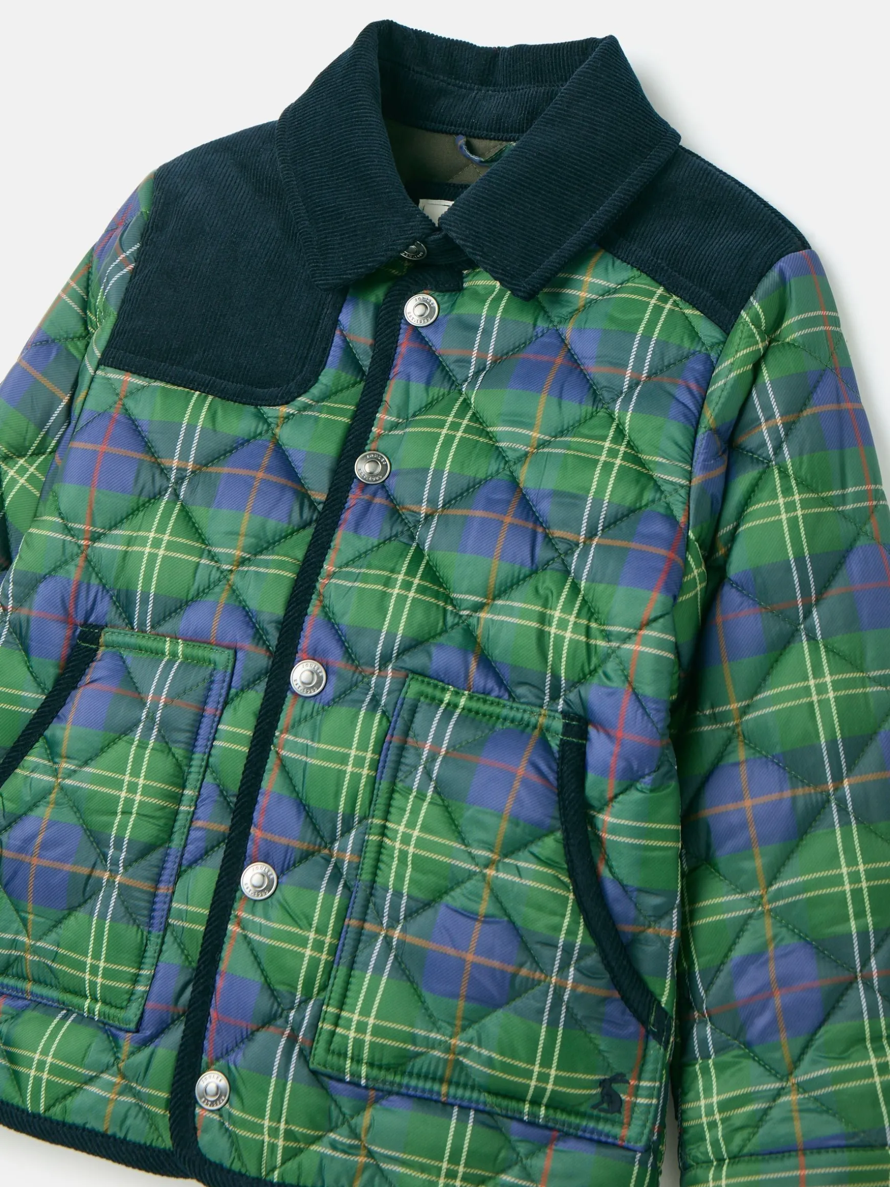 The Freddie jacket is a cool country style your little one won’t argue about putting on this winter. Sure to be a favourite, it has an all over checked pattern in a blend of green, blue and red colours and draws on country style through its corduroy details and throat latch. Its popper fastening makes it easy to throw on, while the diamond quilting both inside and out will add a layer of warmth. The adjustable popper fastenings on the cuffs not only aids the fit of the jacket, but means the sleeves can be rolled up to reveal the corduroy facing. It’s finished with cord binding to the pockets, hem and placket and a hanging loop on the inside. Diamond quilting inside and out. Flat wadding. Corduroy collar, front and back yoke. Country-inspired details including a throat latch. Two front pockets to the front and single welt pocket to the chest. Popper fastening. Popper cuffs. Corduroy binding to the placket and pocket trims. Checked.