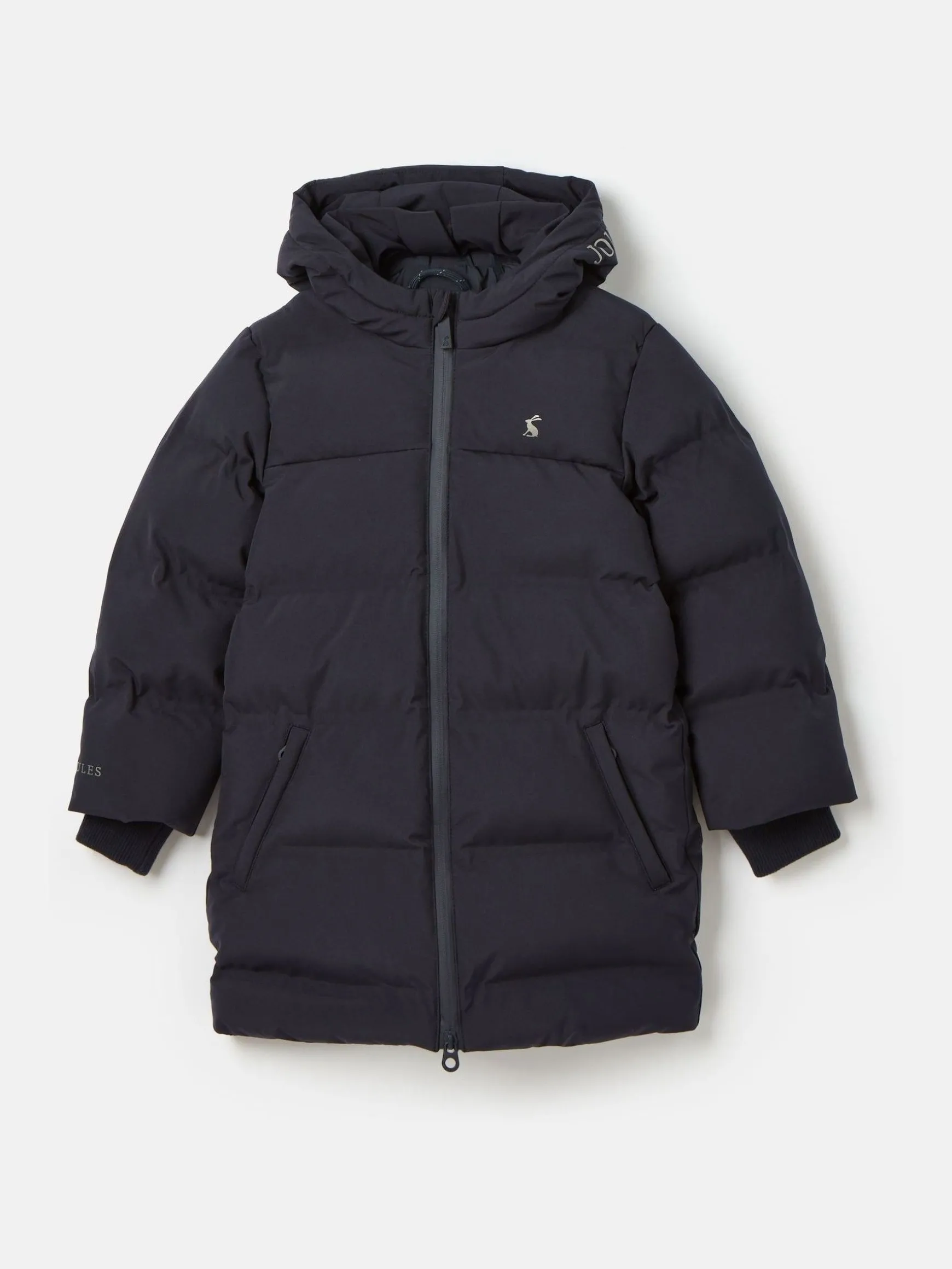 Meet our Padwell coat – a piece that will keep your little one feeling warm, but looking oh-so-cool. For a contemporary look the baffles on the coat (the small pockets of space between the wadding) have been held together using ultrasonic welding to make the coat fully waterproof while keeping a sleek look. There’s a full zip fastening with chin guard, a hood with reflective fixed cord detailing, slanted side pockets and ribbed storm cuffs. We’ve finished it off with a Joules hare screen print to the chest and a reflective ‘Adventure Awaits’ screen print to the back. Padded coat. Fully waterproof with ultrasonic welded baffles. Heat sealed seams. Hood with fixed cord detailing. Full zip fastening with chin and zip guard. Ribbed storm cuffs. Two front zipped pockets. Internal name label. Reflective ‘Adventure Awaits’ print to the back. Reflective Joules hare print to the chest