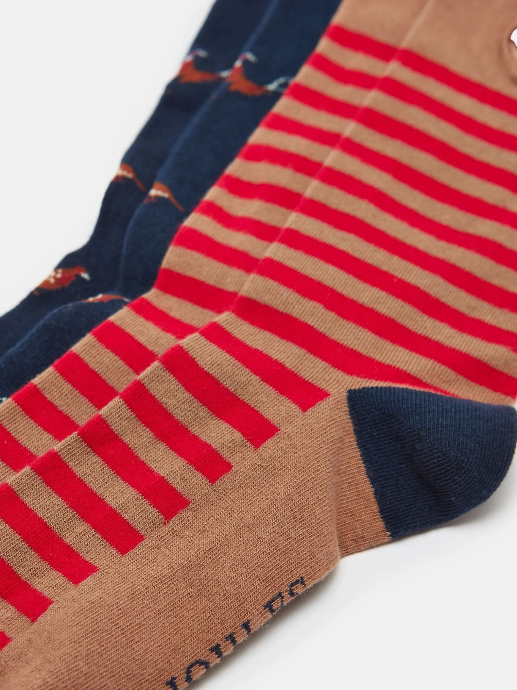 There’s no such thing as too many socks. Especially when they look this good. The men’s Kingsbury socks come in a pack of two and will give his top drawer a much-needed boost. They’re made from a soft, breathable cotton blend that feels as good as it looks and feature two different designs in each pack. The ribbed cuffs increase the comfort and stops them from falling down. With a whole line-up of designs to stock up on, odd socks will never be seen again. Cotton blend. Pack of two. Ribbed cuffs. Two different designs in a pack. Joules branding to the bottom.