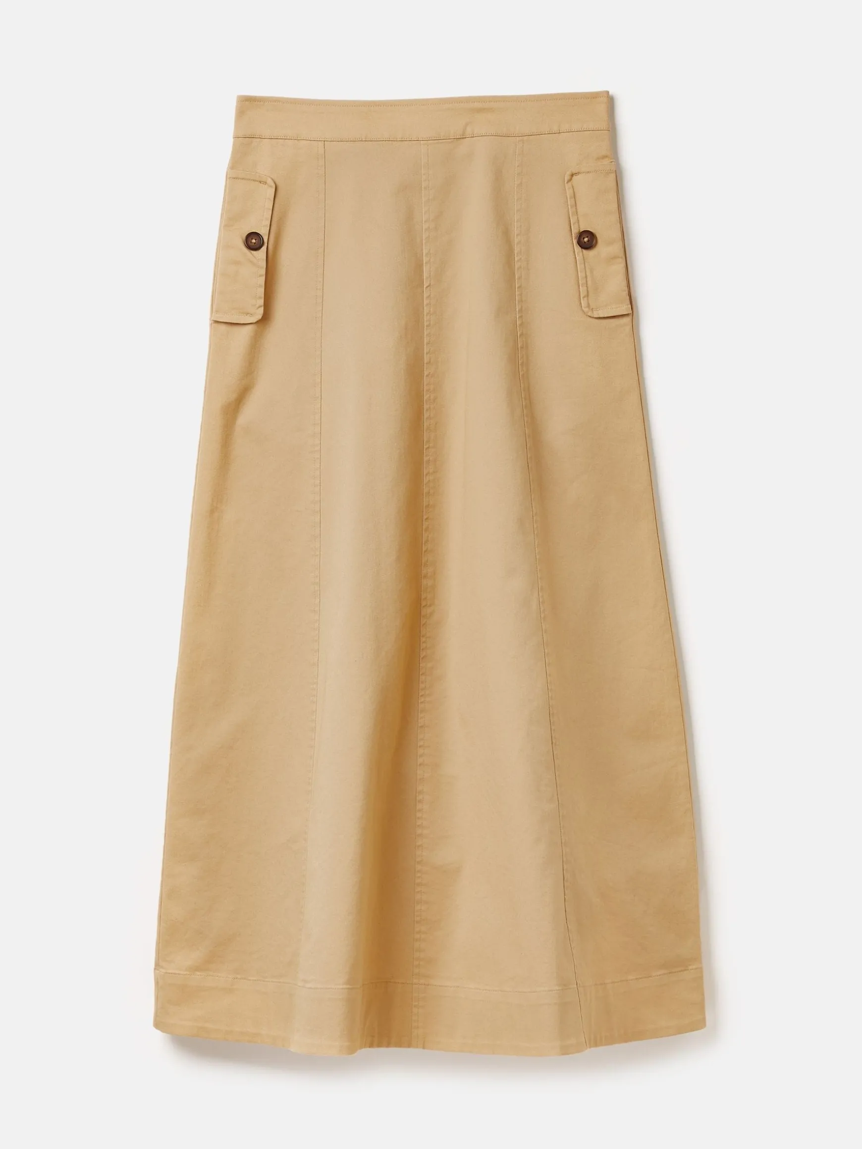 A truly transitional piece, the Meredith skirt will see you move stylishly into autumn and beyond. It falls to a midi length which makes it easy to wear with anything from pumps to leather boots. Our take on utilitarian style, it has a structured a-line shape, wide panels with top stitch detailing, two side pockets with button fastenings and comes in a neutral tan colour. The scalloped trim gives it a feminine feel that will have you reaching for it on any occasion. Cotton blend. Mid rise waist. A-line shape. Midi length. All over panelling. Top stitch detailing. Scalloped hem. Side pockets with button fastenings.
