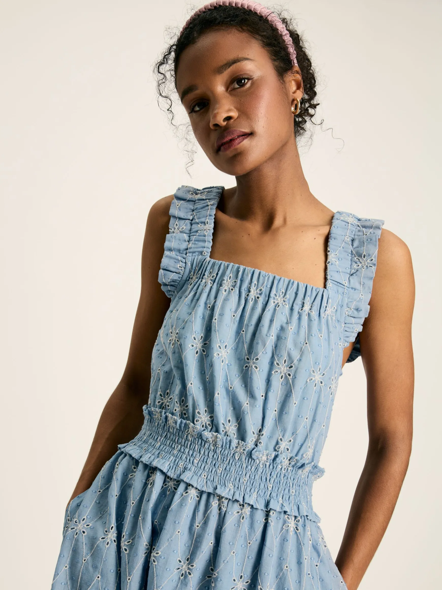 As its name might suggest, this dress was made for sunny days and holidays. Fantastically flattering and with an abundance of detail, from the broderie detail to the top and skirt, and frill detail to the shoulders and cinched waist. Perfect to wear at the beach and then at the bar, or simply strolling in the park feeling carefree and soaking up the sunshine in style.