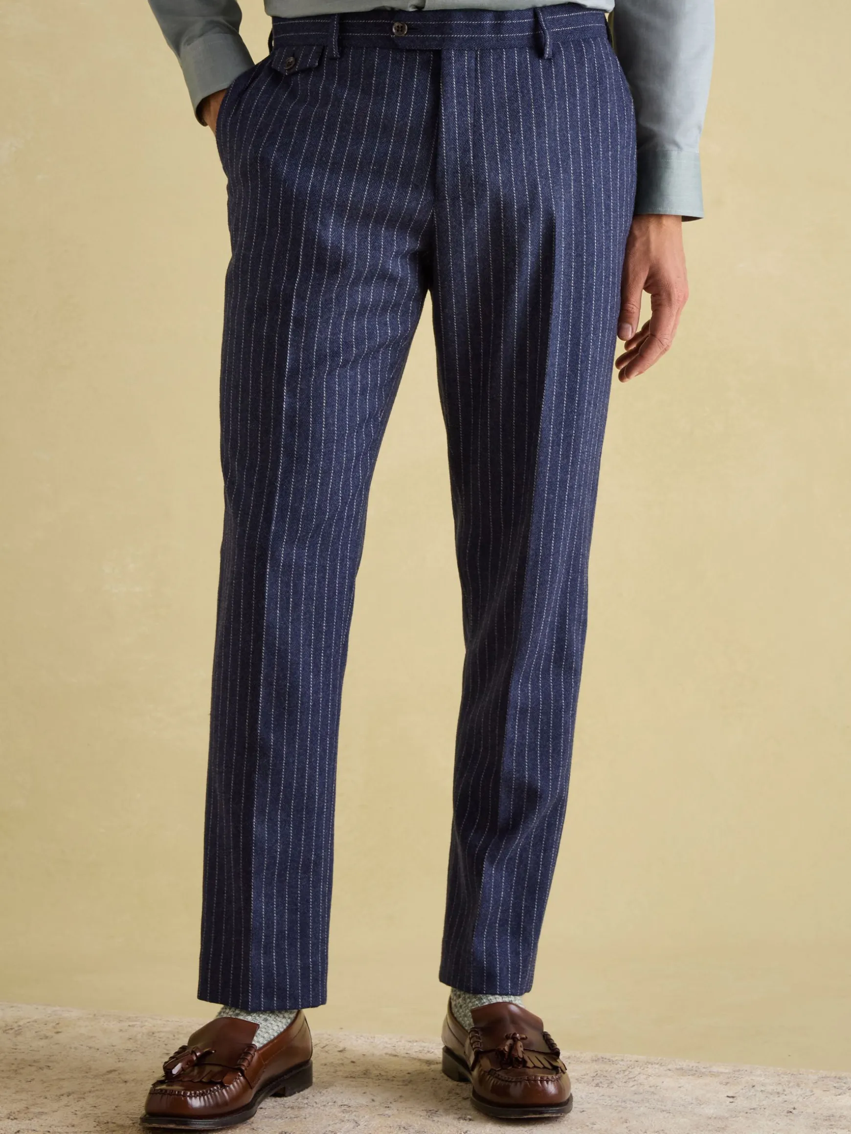 Take inspiration from the notable style of the roaring 20s with this pair of striped trousers. A popular choice for men’s formalwear, these trousers feature a vertical stripe for a slimline look, a slim fit through the leg and are crafted from fine Italian fabric with an enduring quality you can rely on. They feature a hook and bar fastening, belt loops, side pockets and welt pockets to the back with button fastenings. Tick the smart/casual box by simply adding a tucked in t-shirt and pairing with loafers, or achieve the full look with the matching suit jacket. nnn- Slim fitn- Italian striped fabricn- Hook and bar fasteningn- Belt loopsn- Side pocketsn- Two welt pockets to the back with button fastening