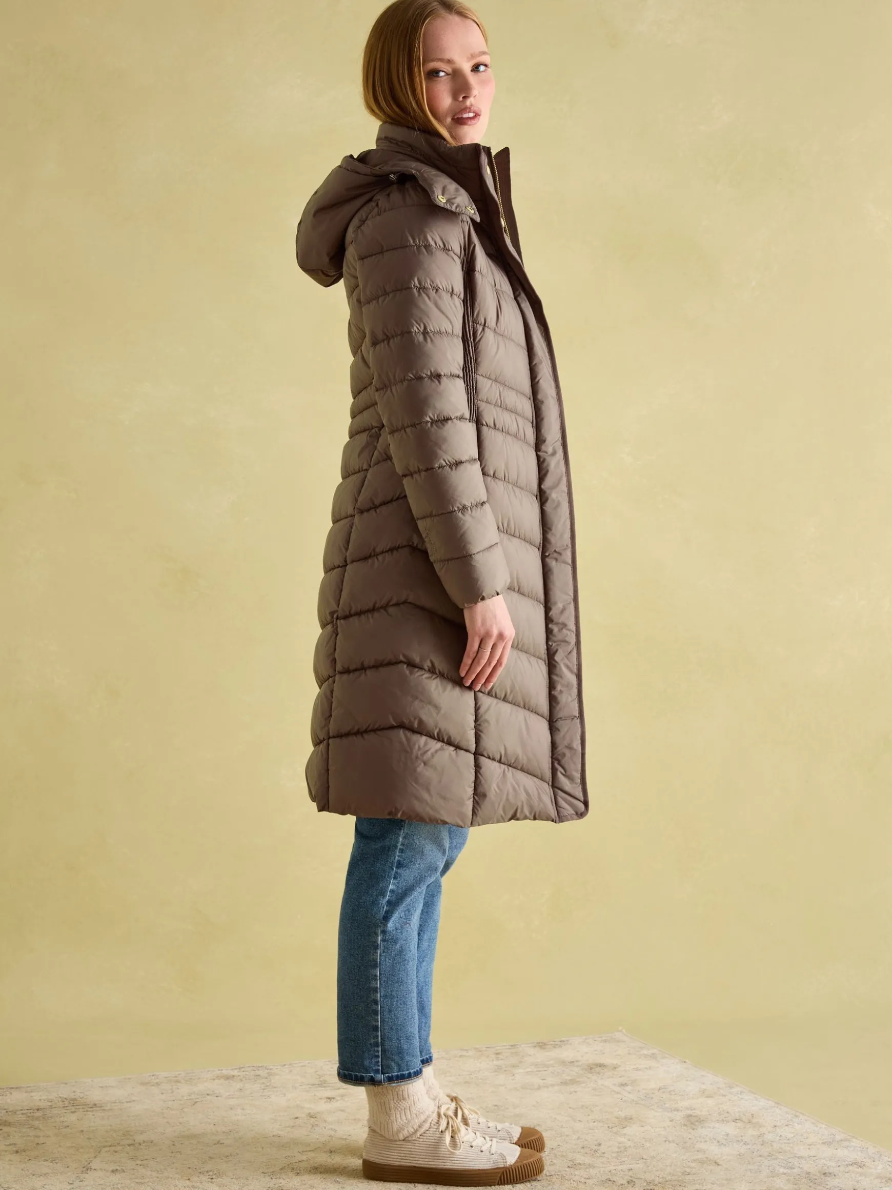 It’s just not winter without our Pembury coat – so it’s back to warm up your outdoor attire. Cut to a longline length for all-over warmth, it’s a true cold-weather wonder. Our designers have cleverly added shirred side panels, slimmer chevron baffles to the waist and curved seams to the centre to balance out its shape for a more flattering fit. The fabric has a soft-to-touch pearlised finish that’s also showerproof, making it perfect for light bursts of rain, and the hood is detachable so you can decide your level of protection before you head out. The high neck and chin guard with popper fastenings also add an additional touch of coverage to hide behind when the wind starts to whistle on through. You’ll find two invisible zip pockets to each side too. Longline. Showerproof. Padded with chevron quilting and variegated baffles to the waist. Shirred side panels. Detachable hood with zip and internal waist adjusters. Pearlised fabric finish. Printed lining. Zip and popper fastening. Two hidden zip side pockets. Length: 103cm (based on UK size 12)