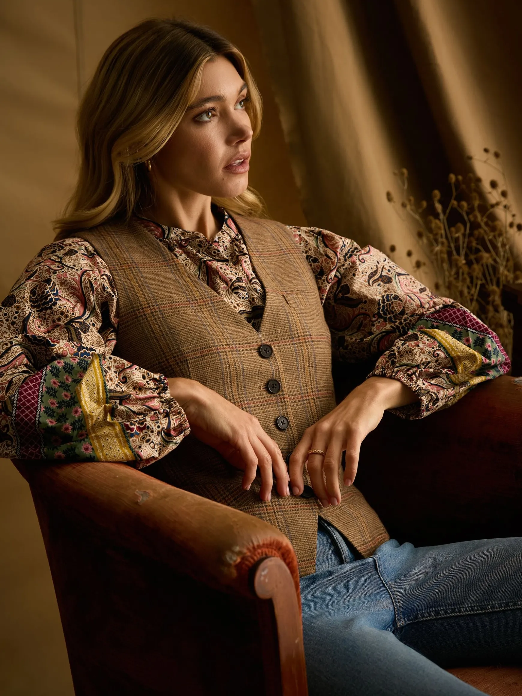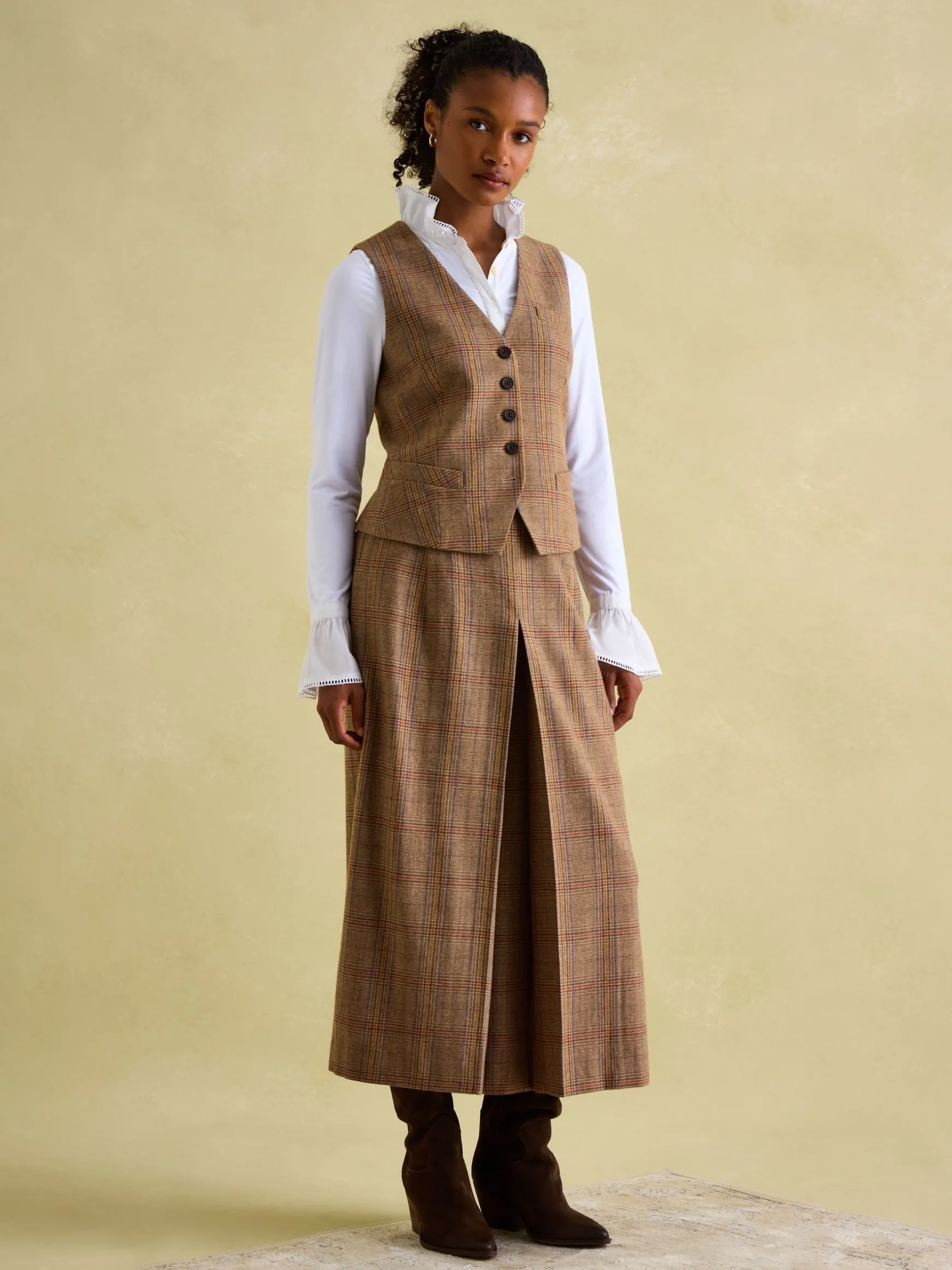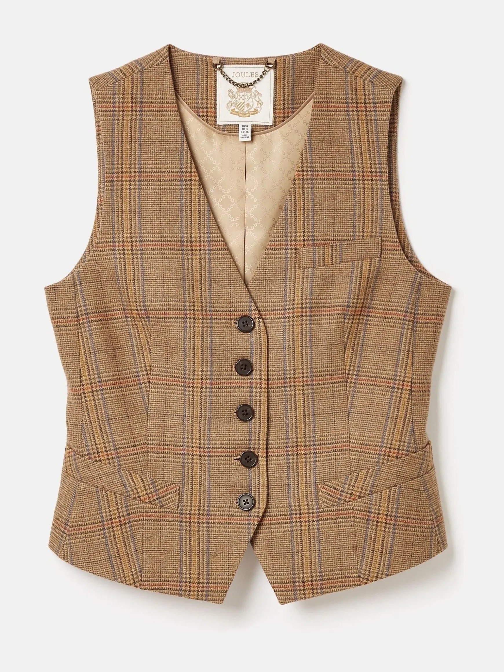 With the Penrose waistcoat, well-dressed style is easy to achieve. Made from a wool blend and using a unique-to-Joules tweed you won’t find anywhere else, this is a piece of enduring quality and distinctive style. Darts to the front of the waistcoat and a row of five faux horn buttons gives it a structured fit, while three welt pockets are a classic touch. On the inside a printed satin lining elevates it further and stands as a nod to our heritage. Wear it over a ruffle blouse or team it back with the matching suit trousers and blazer. Wool blend. Unique-to-Joules tweed. Single breasted. Five faux horn button fastenings to the front. Darts to the front for a structured shape. Three welt pockets to the front. Printed satin lining.