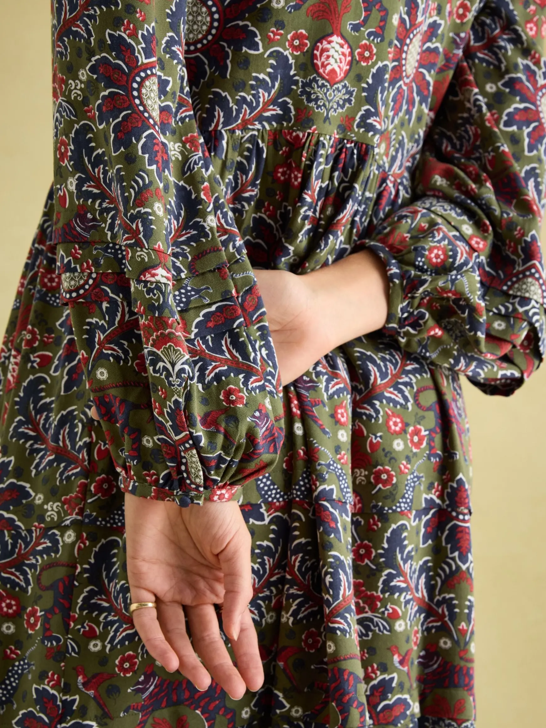 If you’re refreshing your wardrobe for the autumn season, then you’ll want to make space for the Petunia dress. A statement style you’ll always turn to, it falls to a knee length, is crafted from viscose and has long sleeves with button cuffs. The high frilled neckline and keyhole opening to the front is oh-so-flattering and adds just the right amount of detail. Pockets in the side seams are an always-handy addition, while the print which adorns it uses a colour palette that will carry you through the season and beyond. Viscose. Knee length. Long sleeves with keyhole button cuffs. Frilled neck. Keyhole button opening at the front. Gathered waistband.