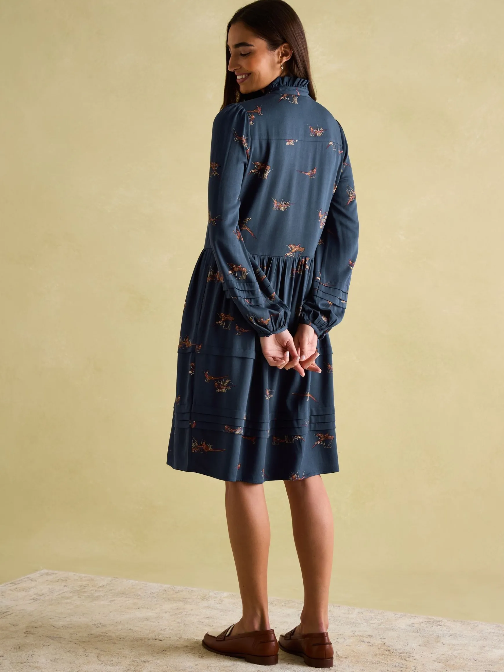 If you’re refreshing your wardrobe for the autumn season, then you’ll want to make space for the Petunia dress. A statement style you’ll always turn to, it falls to a knee length, is crafted from viscose and has long sleeves with button cuffs. The high frilled neckline and keyhole opening to the front is oh-so-flattering and adds just the right amount of detail. Pockets in the side seams are an always-handy addition, while the print which adorns it uses a colour palette that will carry you through the season and beyond. Viscose. Knee length. Long sleeves with keyhole button cuffs. Frilled neck. Keyhole button opening at the front. Gathered waistband.