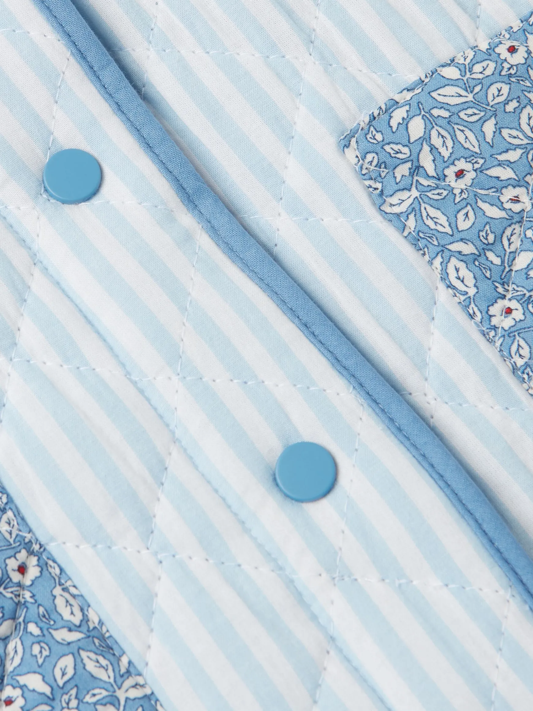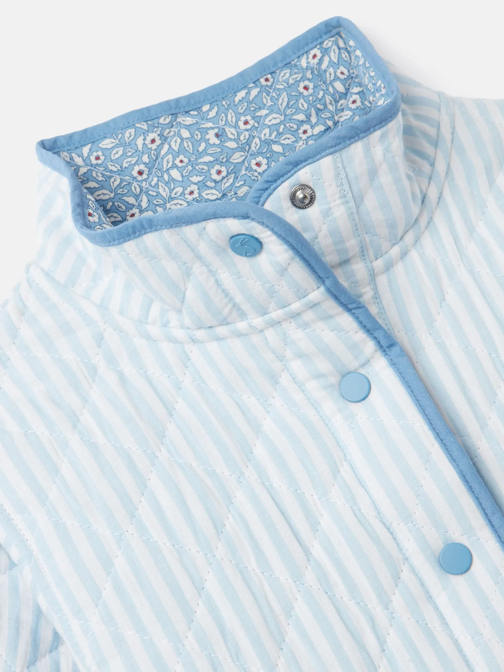 Just when you thought this jacket couldn’t get any better – you discover it’s reversible! Giving you two styles in one, it’s as practical as it is cute. Choose between a ditsy floral print or a classic pin stripe all in a sea of blues. Both sides feature diamond quilting filled with flat wadding for a light layer of warmth, a funnel neck, binding trims and popper fastening. The striped side benefits from the addition of pockets for stashing all their important adventure finds. Style it with the sleeves rolled up to reveal the opposing print. 100% cotton. Reversible. One floral, one striped side. Boxy fit through the body. Funnel neck. Diamond quilting filled with flat wadding. Popper fastenings. Binding to the hem, cuffs and neck. Front pockets to one side only.