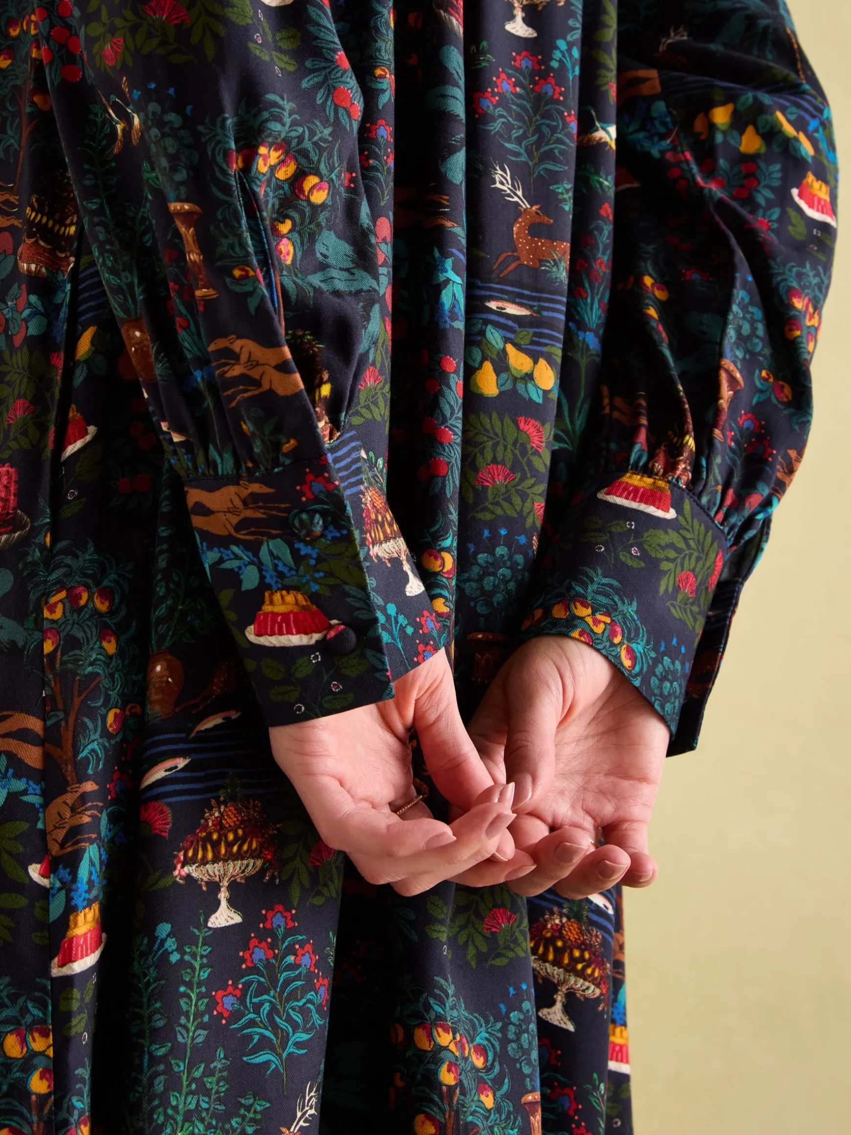 The Rosette dress is an elegant style to add to your wardrobe as it combines a flattering shape with a hand-drawn print you won’t find anywhere else. While it’s designed as part of our autumn collection, it can just as easily move into the warmer months of the year too, making it a truly versatile piece. It sits above the knee, has long sleeves with gathered shoulders and button cuffs and features a bib detail to the front with a velvet piped trim. Its pie crust neckline is a delicate detail that will look elegant when layered under a knit in the cooler weather. Viscose. Above-the-knee length. Long sleeves with gathered shoulders. Keyhole button cuffs. Pie crust neck with button fastening. Bib detailing to the front with velvet piping. Hand-drawn print