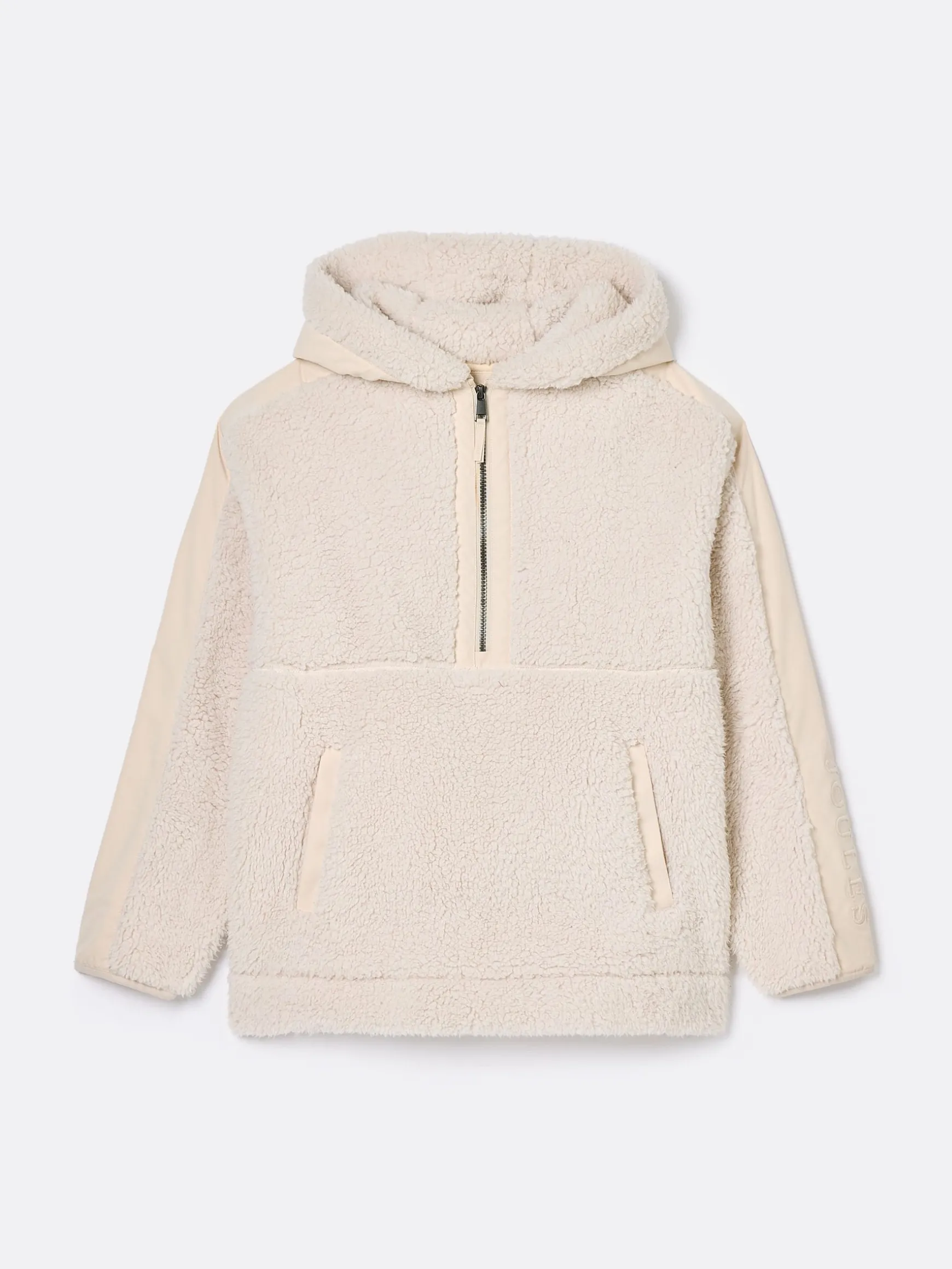 The Tilly fleece is back and this time it’s been given a hood lined with more fleece for an extra element of cosiness. If you’ve been a wearer of our Tillys for a while, you’ll be happy to see returning features too such as the cloud-like borg fleece fabric, dropped shoulders, relaxed fit and contrasting woven panels to the sleeves and hood. Zipped vents to each side allow for freer movement, while a quarter zip fastening contributes to its casual feel. It’s finished with side pockets and tonal Joules branded embroidery to the sleeve. In the fairer months of autumn, this makes a great last layer but can just as easily be worn under gilets or coats too.nnBorg fleecenRelaxed fitnHood with borg fleece liningnDropped shouldersnQuarter zip fasteningnWoven panels to the sleeves, pockets and hoodnZipped side ventsnSide pocketsnTonal Joules woven detail under the collar