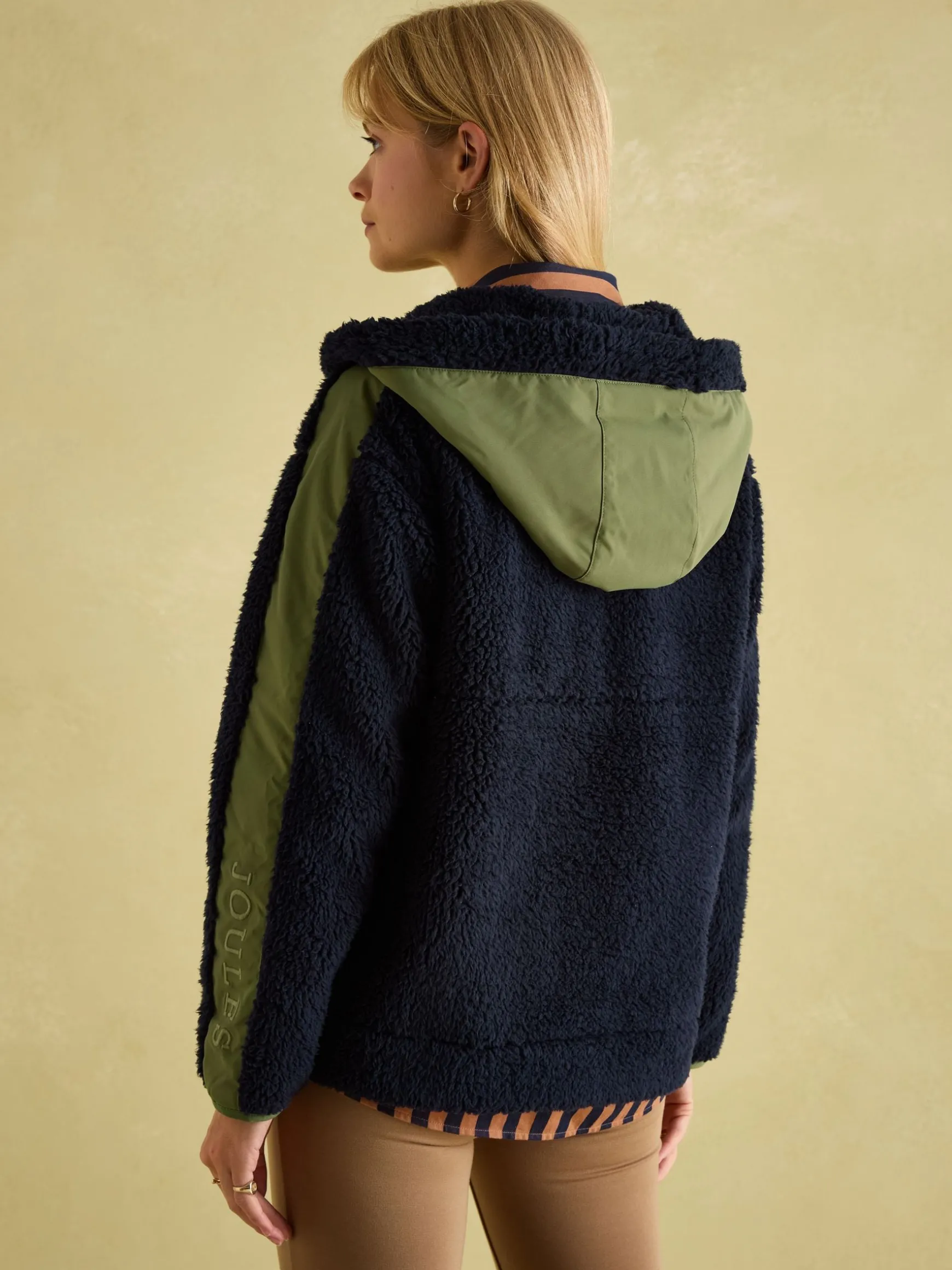The Tilly fleece is back and this time it’s been given a hood lined with more fleece for an extra element of cosiness. If you’ve been a wearer of our Tillys for a while, you’ll be happy to see returning features too such as the cloud-like borg fleece fabric, dropped shoulders, relaxed fit and contrasting woven panels to the sleeves and hood. Zipped vents to each side allow for freer movement, while a quarter zip fastening contributes to its casual feel. It’s finished with side pockets and tonal Joules branded embroidery to the sleeve. In the fairer months of autumn, this makes a great last layer but can just as easily be worn under gilets or coats too.nnBorg fleecenRelaxed fitnHood with borg fleece liningnDropped shouldersnQuarter zip fasteningnWoven panels to the sleeves, pockets and hoodnZipped side ventsnSide pocketsnTonal Joules woven detail under the collar