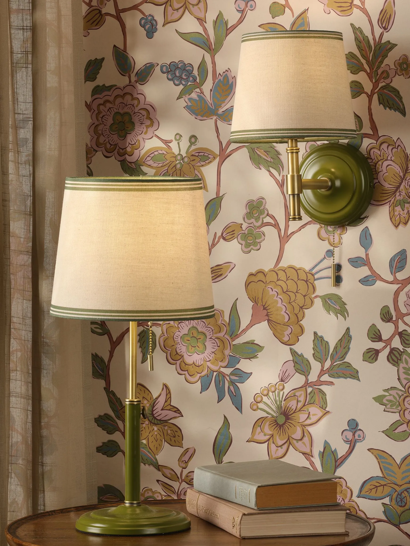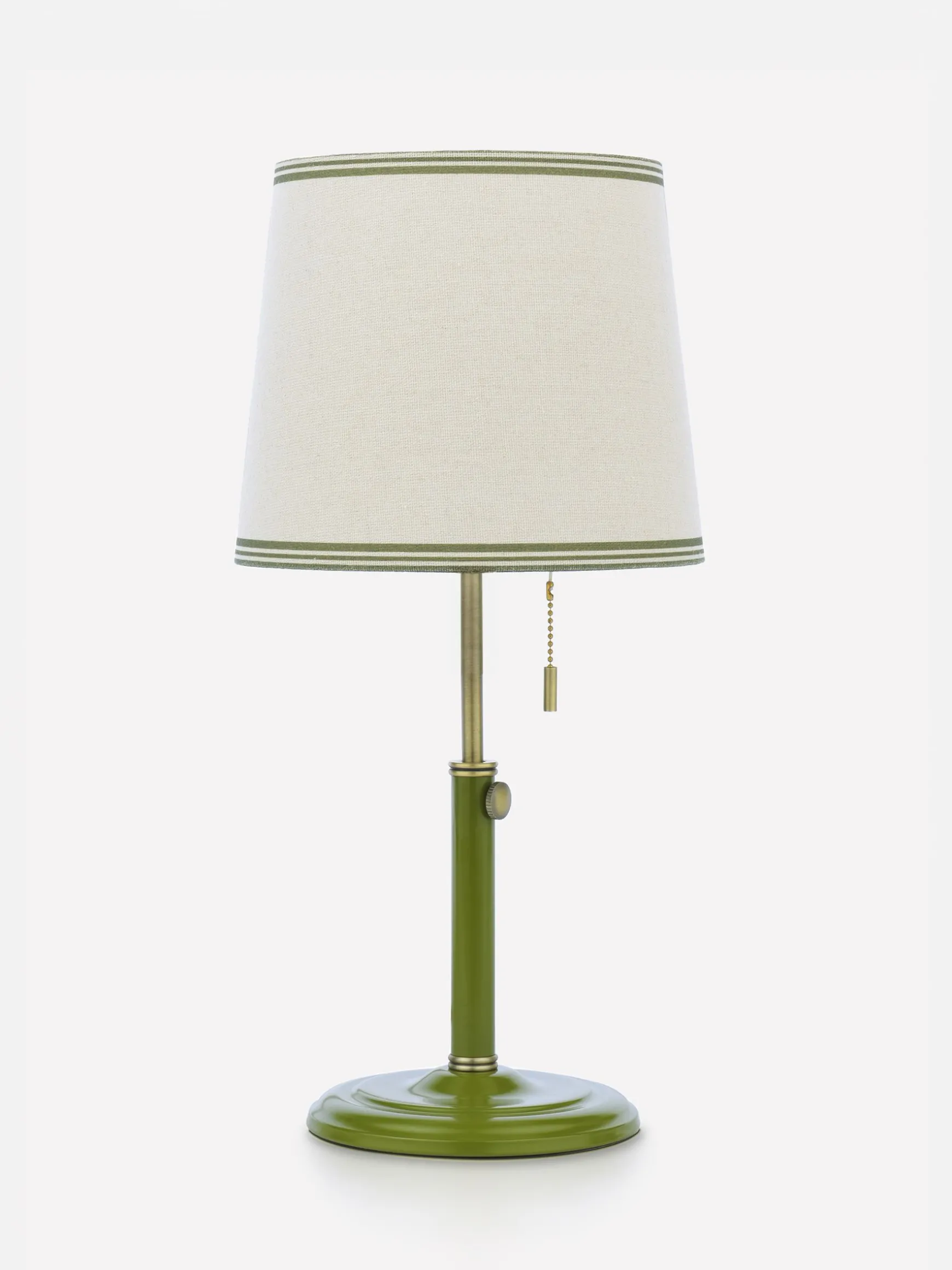 When the urge to refresh your interior strikes, the simple addition of new lighting can give a room a new lease of life. The Upton table lamp has a green matte painted antique brass base for a hint of colour and an adjustable ‘rise and fall’ stand – perfect for spaces of all sizes. It features a linen tapered lamp shade with a coloured border and a pull cord switch which offers a functional detail while also giving a nod to retro style. Create a cohesive space with the matching Upton wall light. nnRise and fall table lampnAdjustable standnPainted matte antique brass basenTapered linen light shade with green bordernPull cord functionnMatching wall light available separately nDi:200mm x H.425 – 355mm