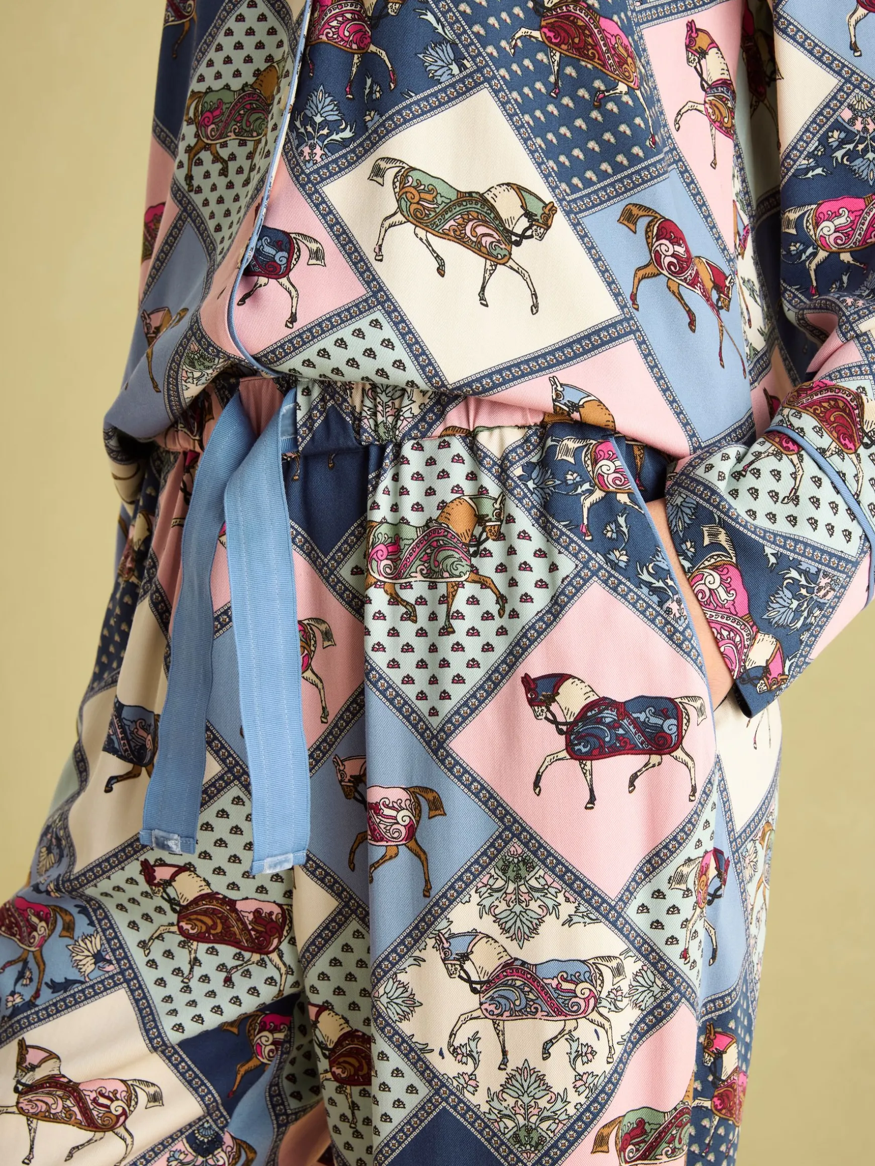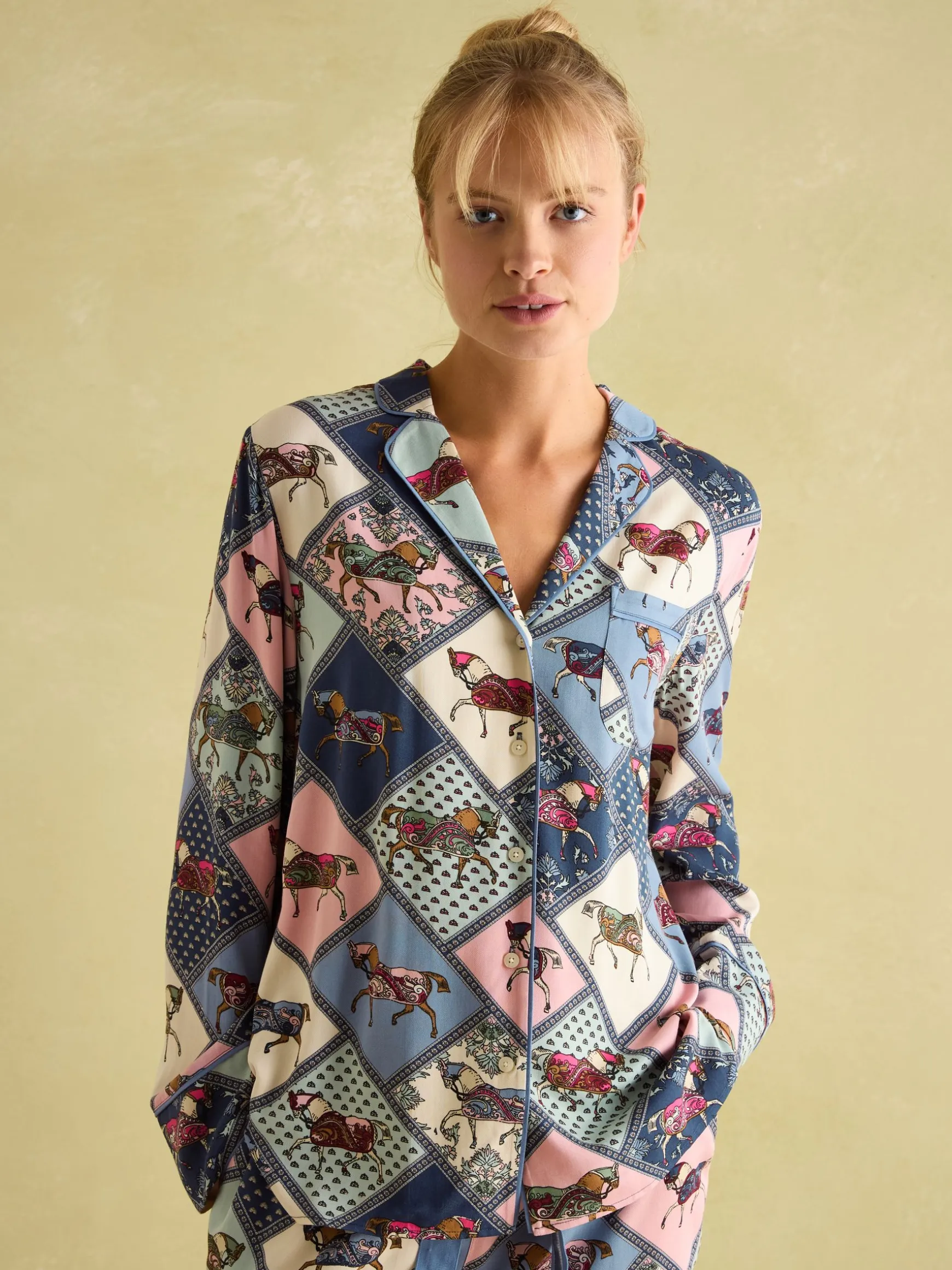 Drift off to dreamland with our Alma pyjama set. The set is crafted from lightweight and breathable viscose and comes with a long-sleeved button-up shirt, complete with a patch pocket and contrasting piped trims. The matching bottoms have a straight fit through the leg, an elasticated waist, luxurious velvet-topped drawcords and slanted side pockets. With a collection of heritage-inspired hand-drawn prints available, you’ll be truly spoilt for choice.nnViscosenLong sleevesnButton-down fasteningnPatch pocket to the chestnPiped trimsnVelvet topped drawcordsnElasticated waistnSlanted side pocketsnHeritage print