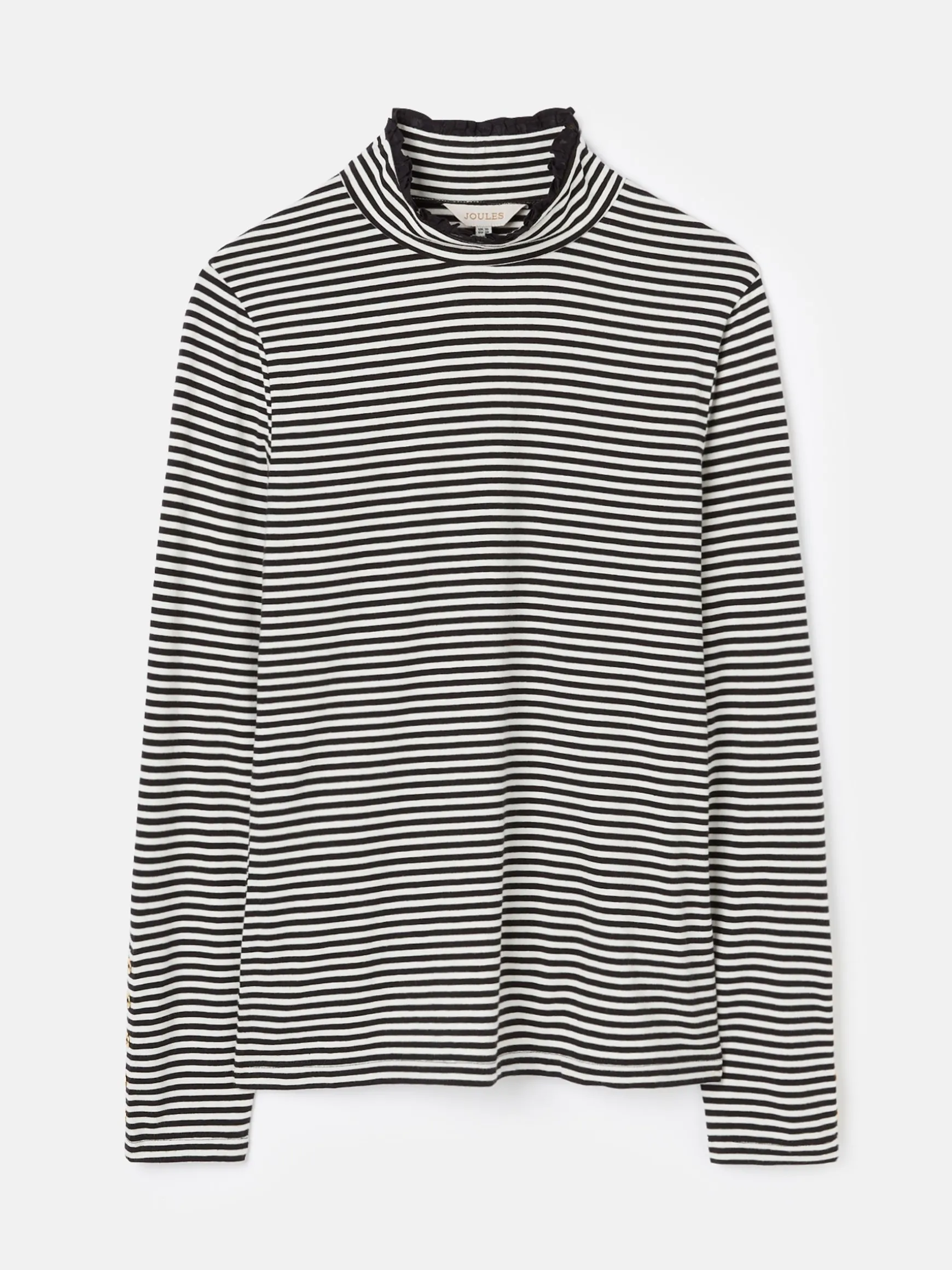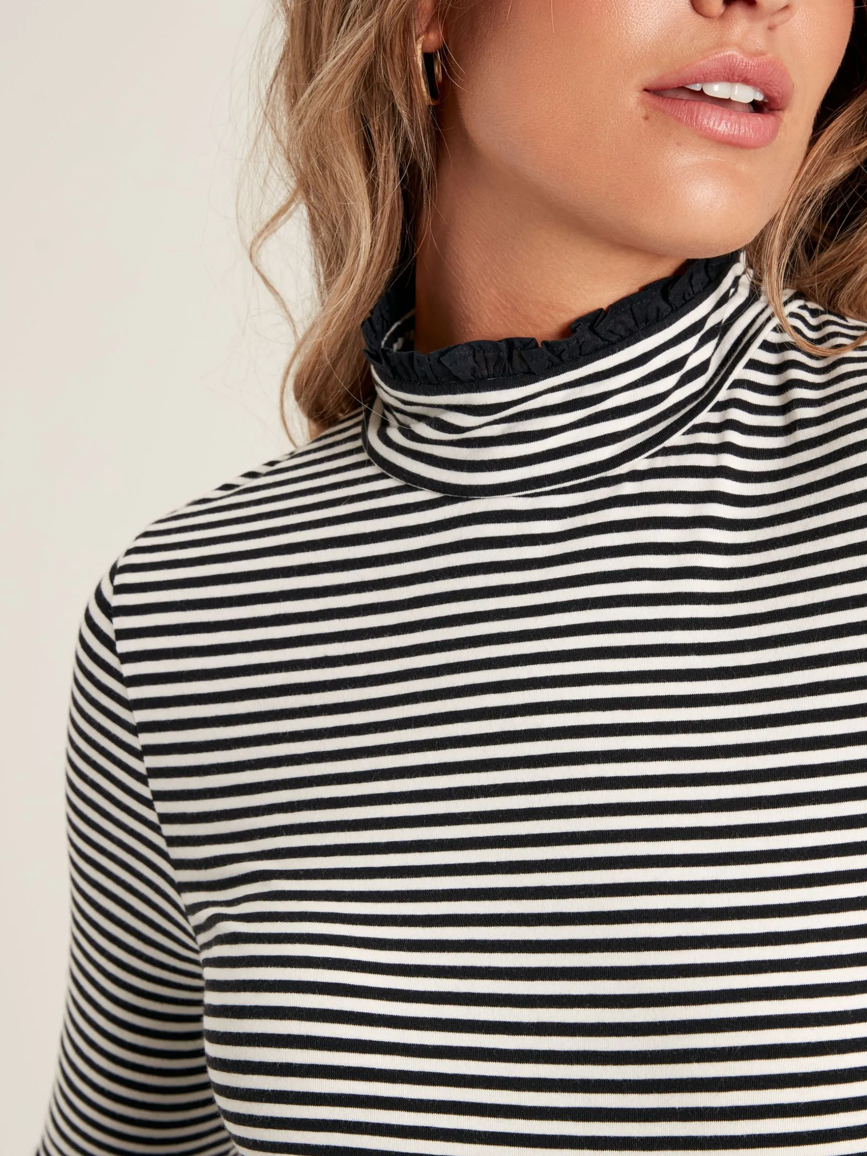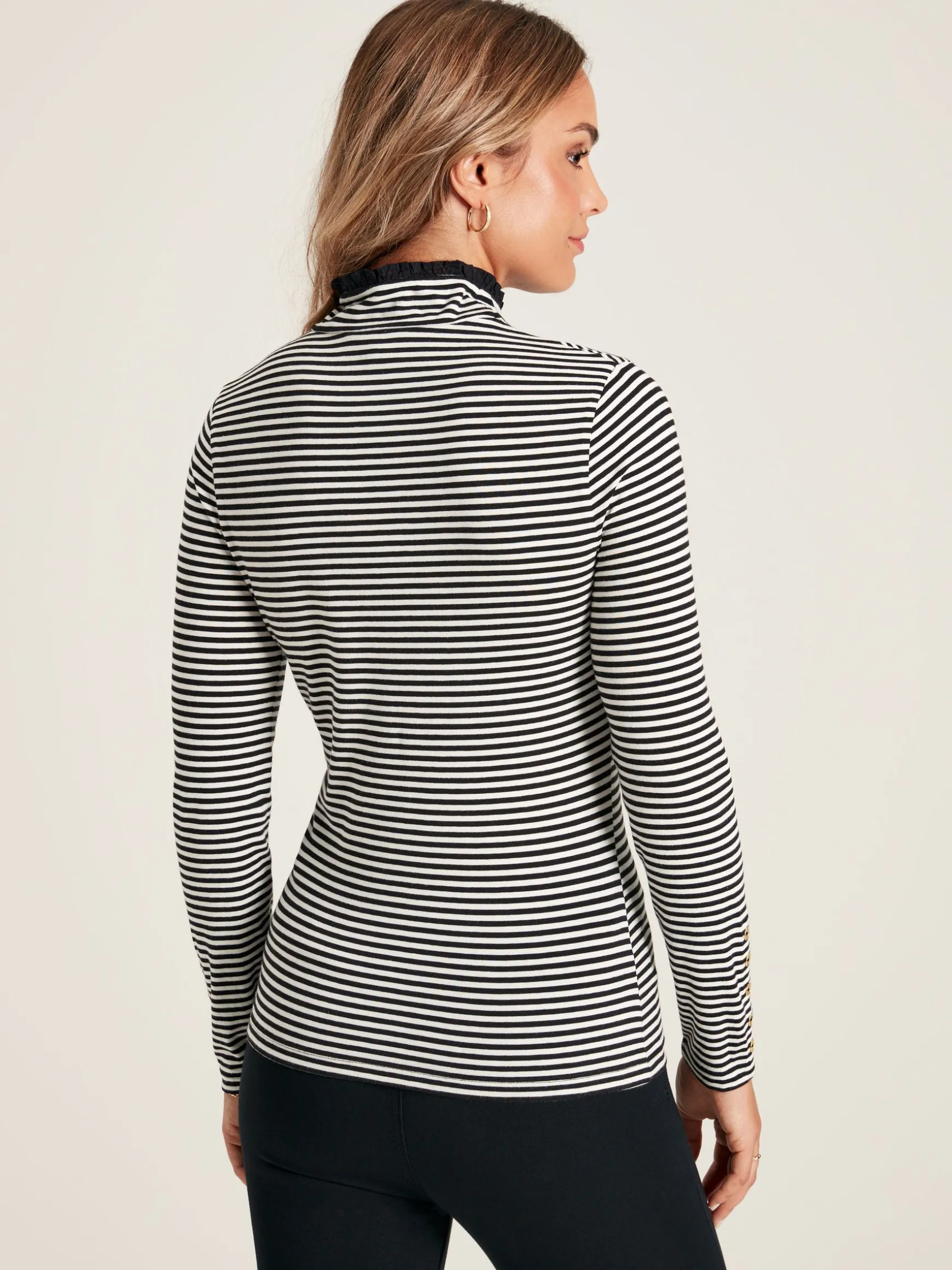 With a slim fit that hugs the body, the Amy jersey roll neck is the perfect base layer to build your outfits around. But it’s certainly not without its details. The long sleeves feature five gold metal accent buttons and the neck is trimmed with a woven frill – we think it’ll look quite the part popped out of a knit. Add one (or a few) of these ‘beyond basics’ to your wardrobe and you’ll forever have a favourite. Jersey. Slim fit. Long sleeves. Roll neck. Woven frill neck. Five gold metal buttons to the cuffs.