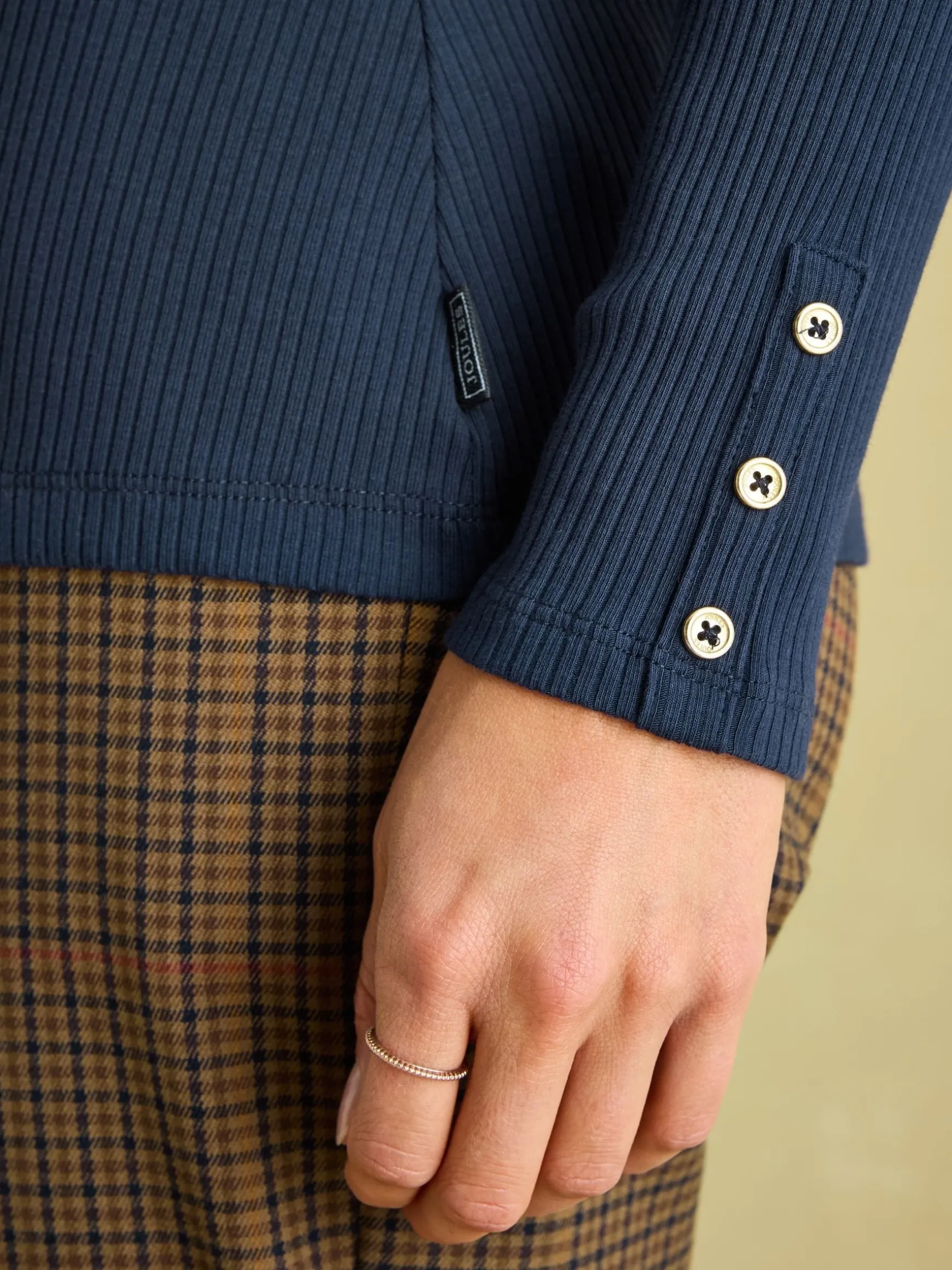 Crafted from cotton that includes a little stretch for a lot of comfort, this top will be the perfect starting point for a lot of outfits. With it’s ribbed texture, high-neck frill collar and button detail to the cuffs, it can sit effortlessly under dresses and shirts for a elegant yet understated look.nnRibbednFrill necknLong sleevesnButton cuff detail