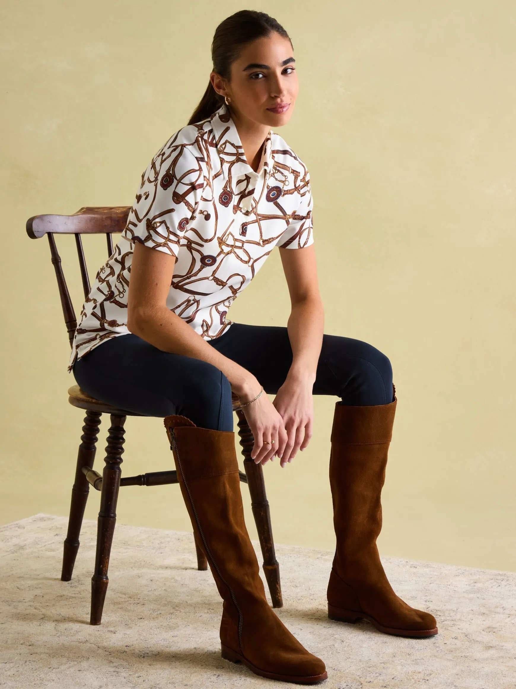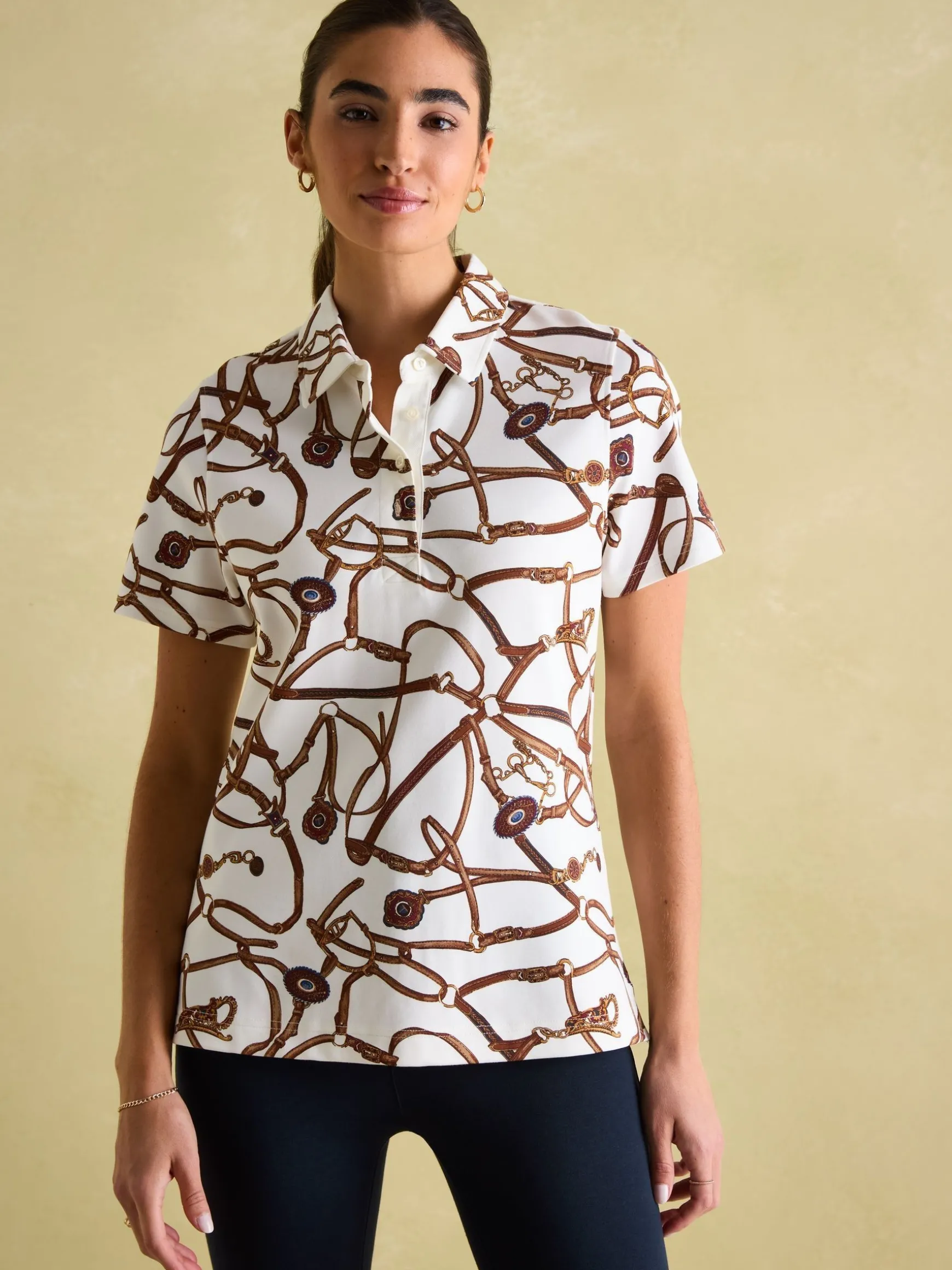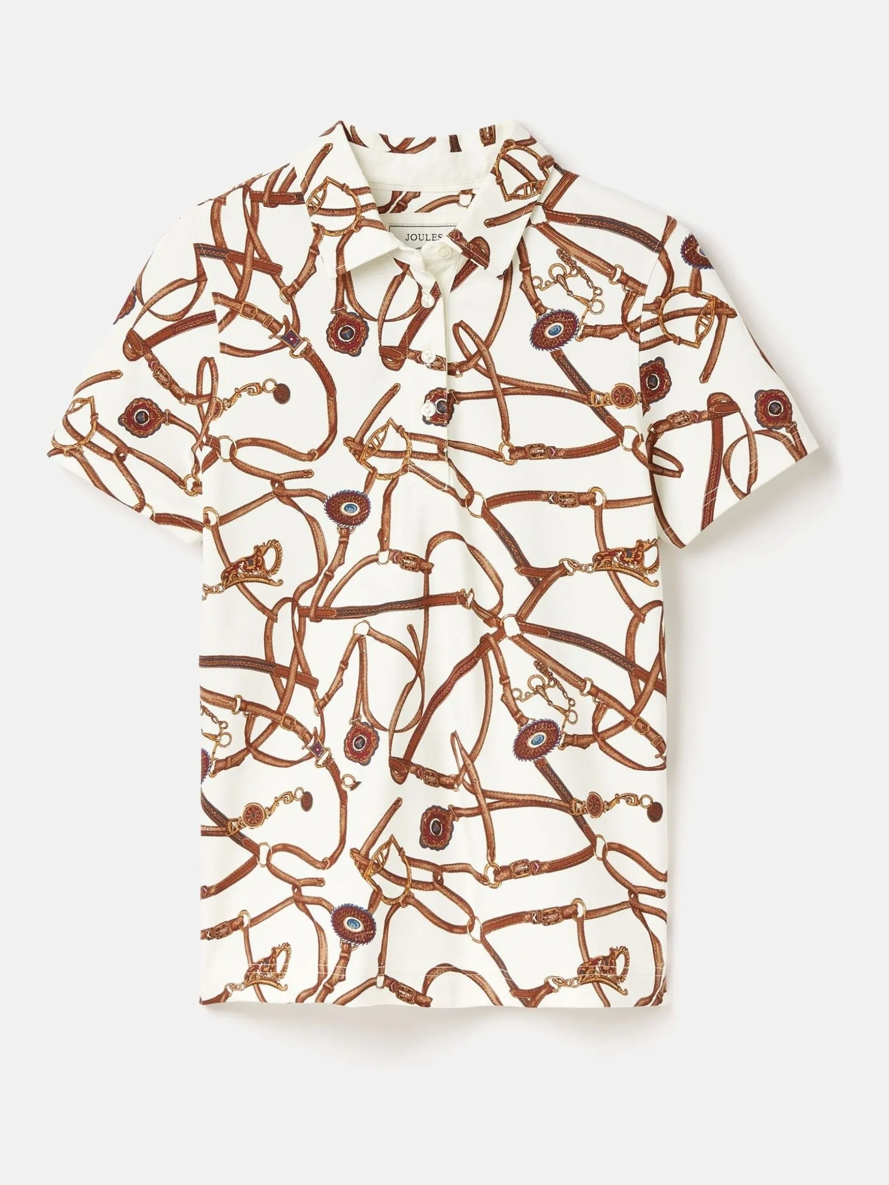 Adorned with intricate embroidery and a stunning hand-drawn bridle print, this is a polo shirt made for those who are keen to show their love of the equestrian world. Crafted from a moisture wicking and breathable material that will keep you cool and comfortable whatever you’re up to. A truly head turning piece that can be worn with jeans and pumps, or dressed up when worn under a blazer. The trims demonstrate a level of attention to detail and quality you won’t find anywhere else.nnMoisture wickingnBreathable nButton fasteningnBridle printnUnder collar embroidery nSide vents