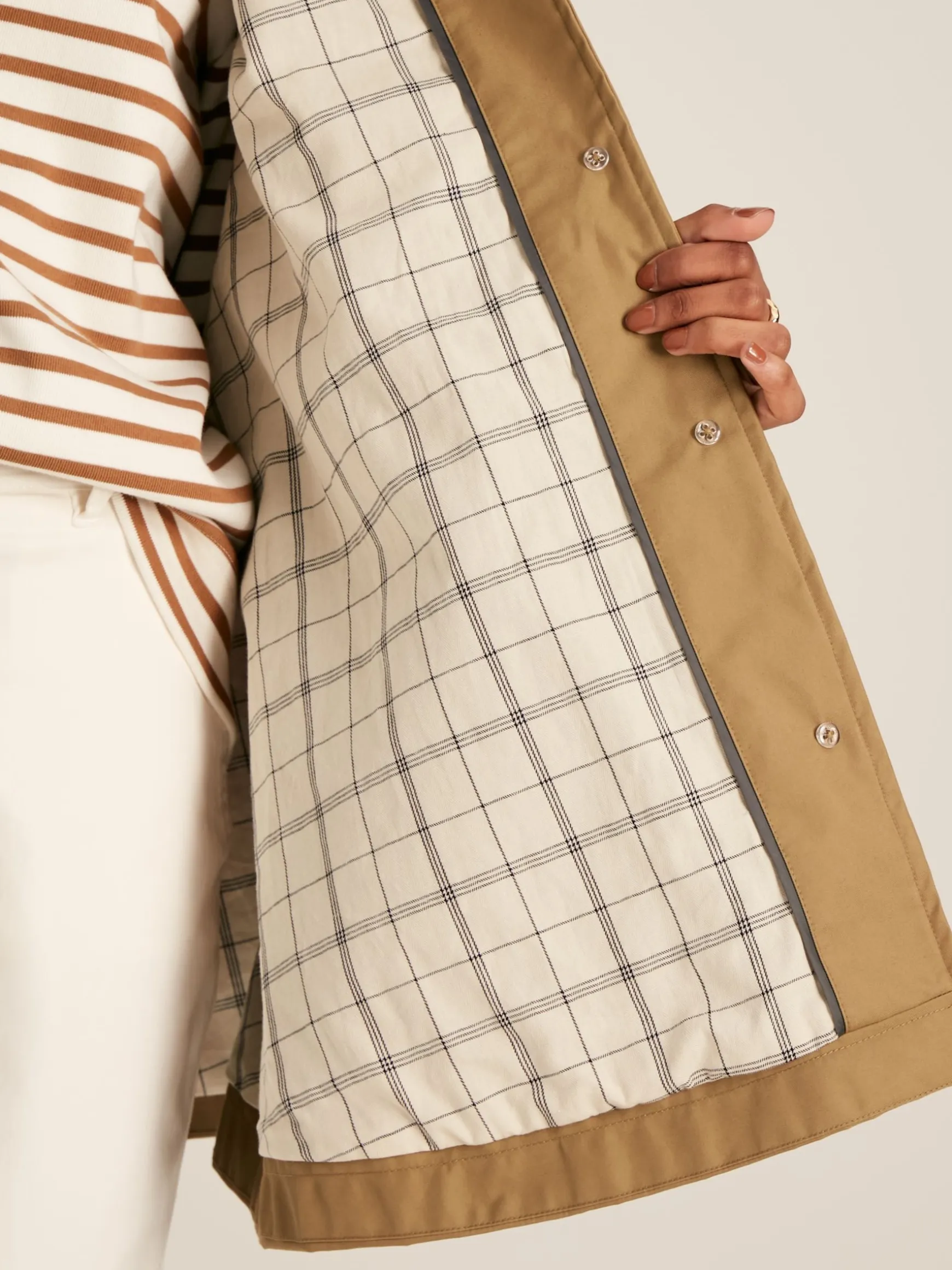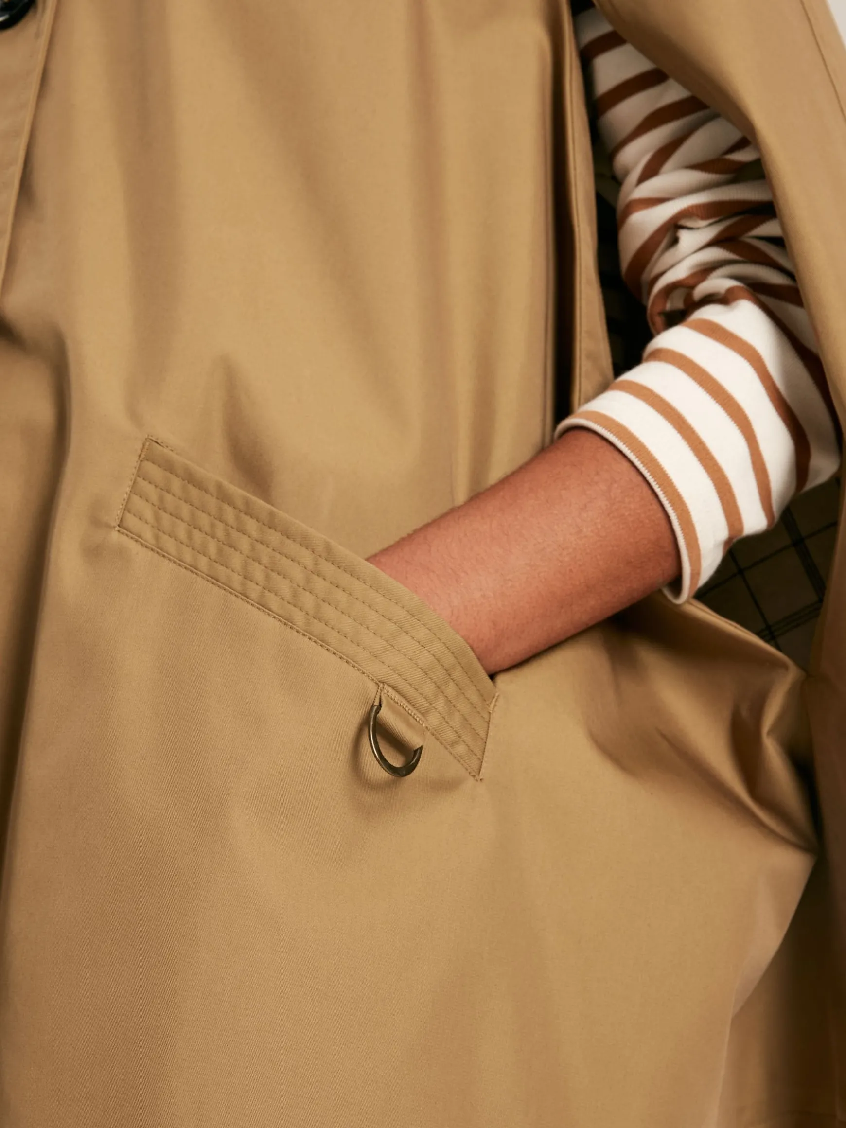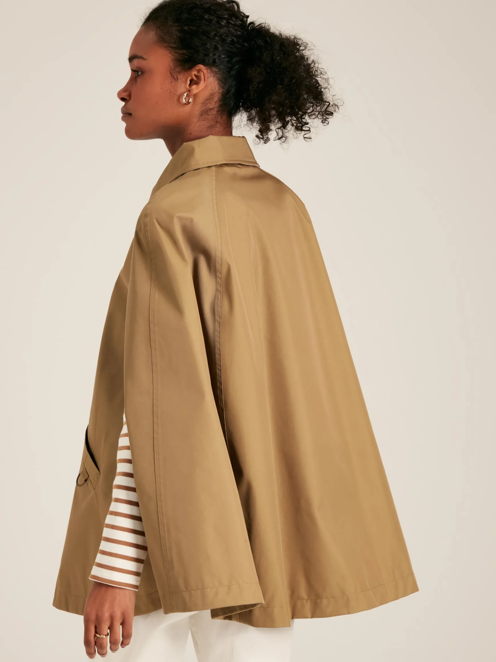 Elevate every outing with the Bibury cape. This investment-worthy piece is waterproof making it a practical piece as well as stylish and fastens at the front with beautiful faux horn buttons which complement the tan colour of the cape. Its relaxed fit leaves room for layers beneath making it a wardrobe wonder for those transitional seasons. Much attention has been paid to the details, from the country-inspired throat latch and D-ring to the pocket, to the hidden branded embroidery under the collar. This is a cape that will take you from town to country in an effortless style. Cotton blend. Waterproof. Faux horn button fastening to the front. Collar with fixed throat latch. Two front pockets with D-ring detail to the left. Opening at the armholes. Hidden Joules embroidery under the collar.