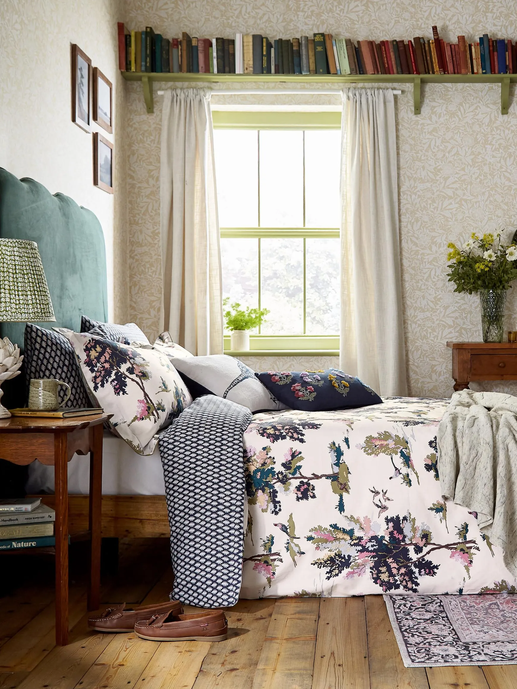 Escape to a countryside retreat with our Woodland Scene bedding set. Charming ducks and pheasants make their home amongst the sun-dappled trees in this enchanting hand-drawn print, designed with an uplifting colour palette of mossy greens, natural blues and floral pinks. The reverse of this set features a traditional block print of oak leaves upon a base of deep navy. This set comes with two matching Oxford pillowcases (single beds come with one) and can be complemented by additional standard pillowcases sold separately.