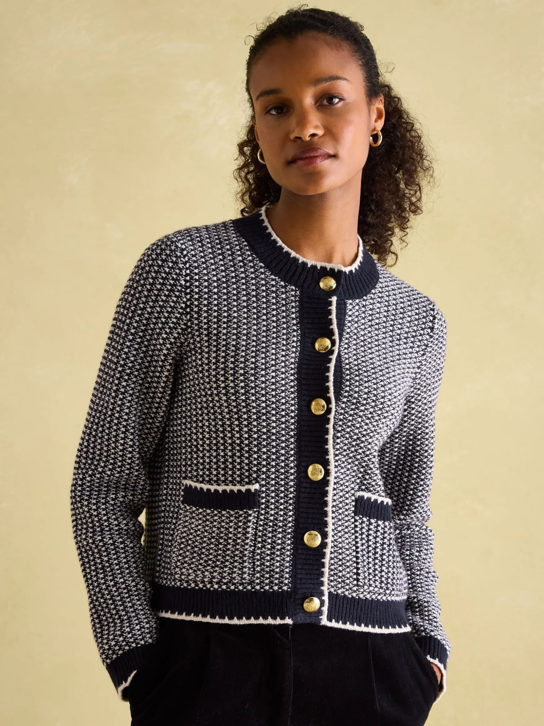Introducing Bridget – the sophisticated cardigan you’ll reach for all autumn and winter. It has a structured, boxy fit, five metal shank buttons to the front and a round neck. Crafted from an enduring cotton blend and using a textured tweed stitch it’s a true love forever piece. Details such as front pockets and a contrasting cream trim only enhance its appearance. Wear it open over a long-sleeve top for a casual, layered look, or button it up for a more formal finish. Cotton blend. Textured tweed stitch. Structured, boxy fit. Round neck. Metal shank buttons. Two front pockets. Cream coloured hem, cuffs and placket trim.