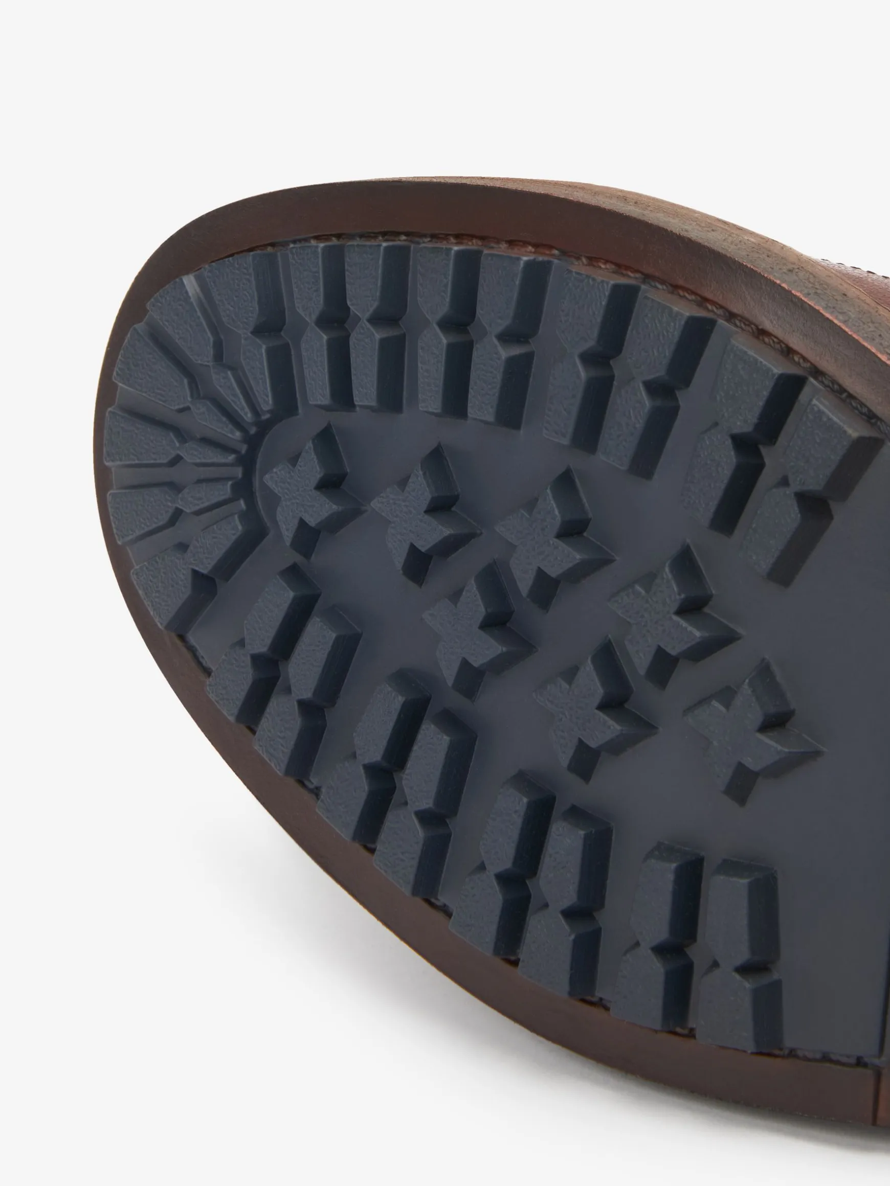 The Joules brogue boot is a fantastic option for a classic look with added support and durability, in a formal yet rugged design to see you through the seasons all year long.nnThe brogue boot has a soft and smooth leather upper in a versatile brown hue, boasting a perforated pattern to the toe cap, heel and 7-eyelet lace-up fastening. A textile and leather lining promotes a great foot feel, with an added Ortholite footbed for underfoot padding. A durable rubber outsole with a shaped tread resides underneath for added slip resistance.