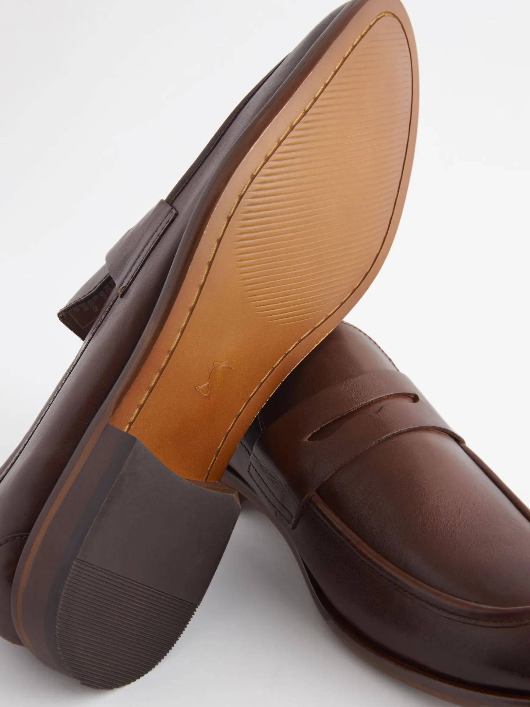 Leather loafers are a classic footwear choice that never fail to deliver on style and practicality. This pair uses a buttery-soft rich brown leather which has been hand-finished and polished for a sleek look. The outside carries a classic loafer design with apron detailing and a rounded toe. On the inside a leather lining is yet another mark of the craftmanship, while an Ortholite insock cushions the foot for supreme comfort. Introduce these into your smart casual wardrobe and they’ll become your failsafe options for years to come.nn- Hand finished leather uppersn- Rich deep brown colourn- Leather liningn- Apron detailingn- Rounded toen- Ortholite comfort insock