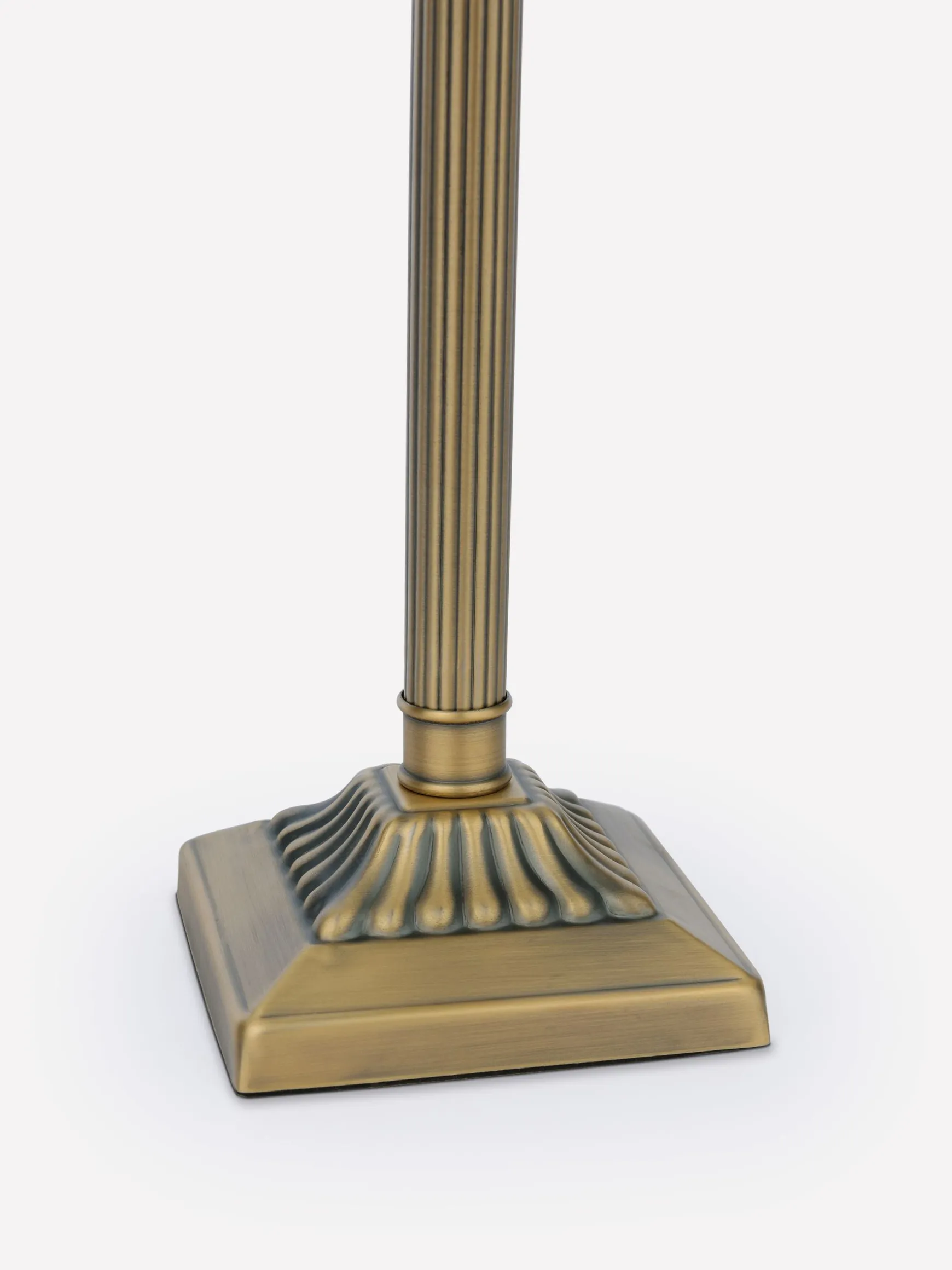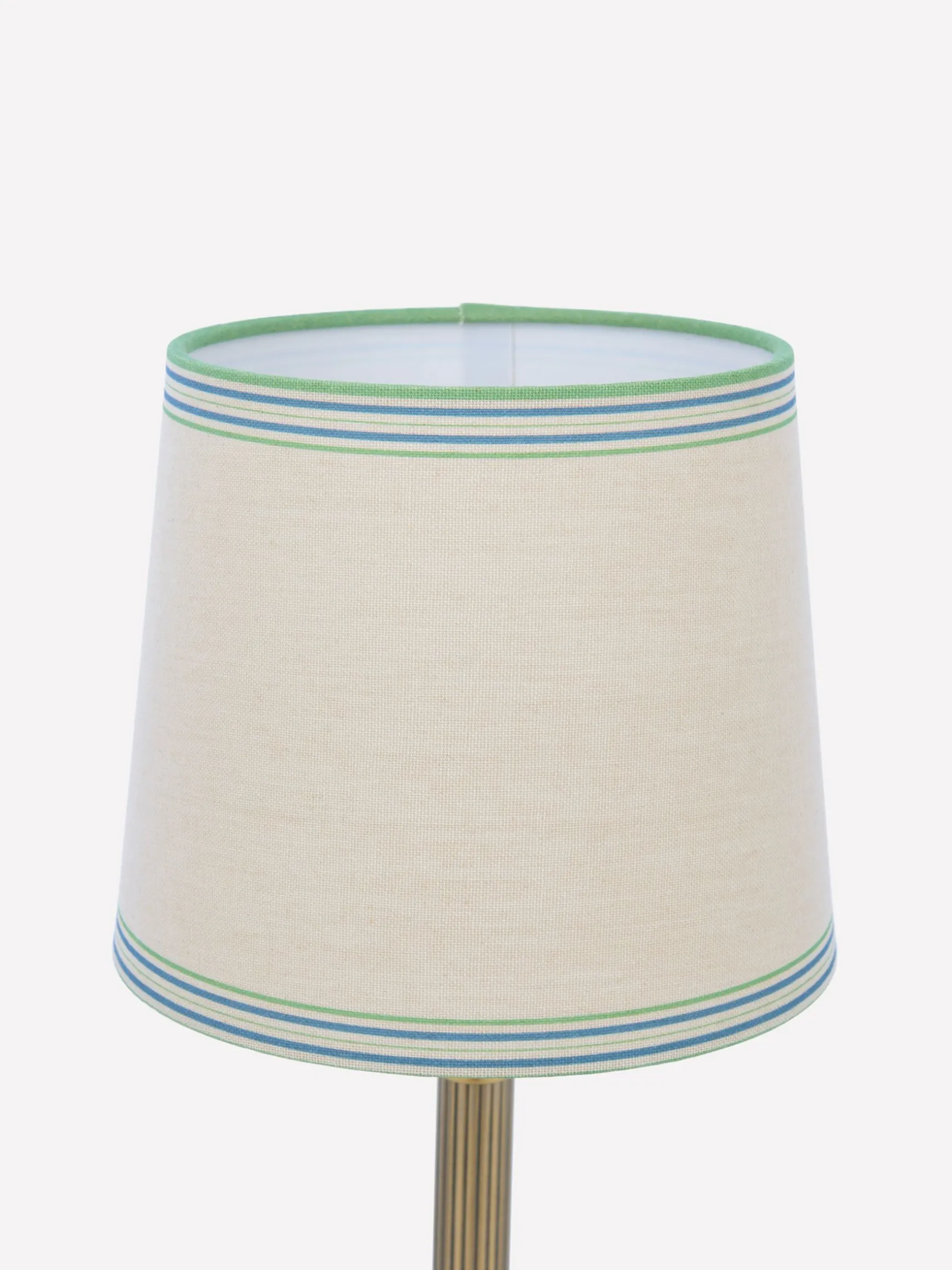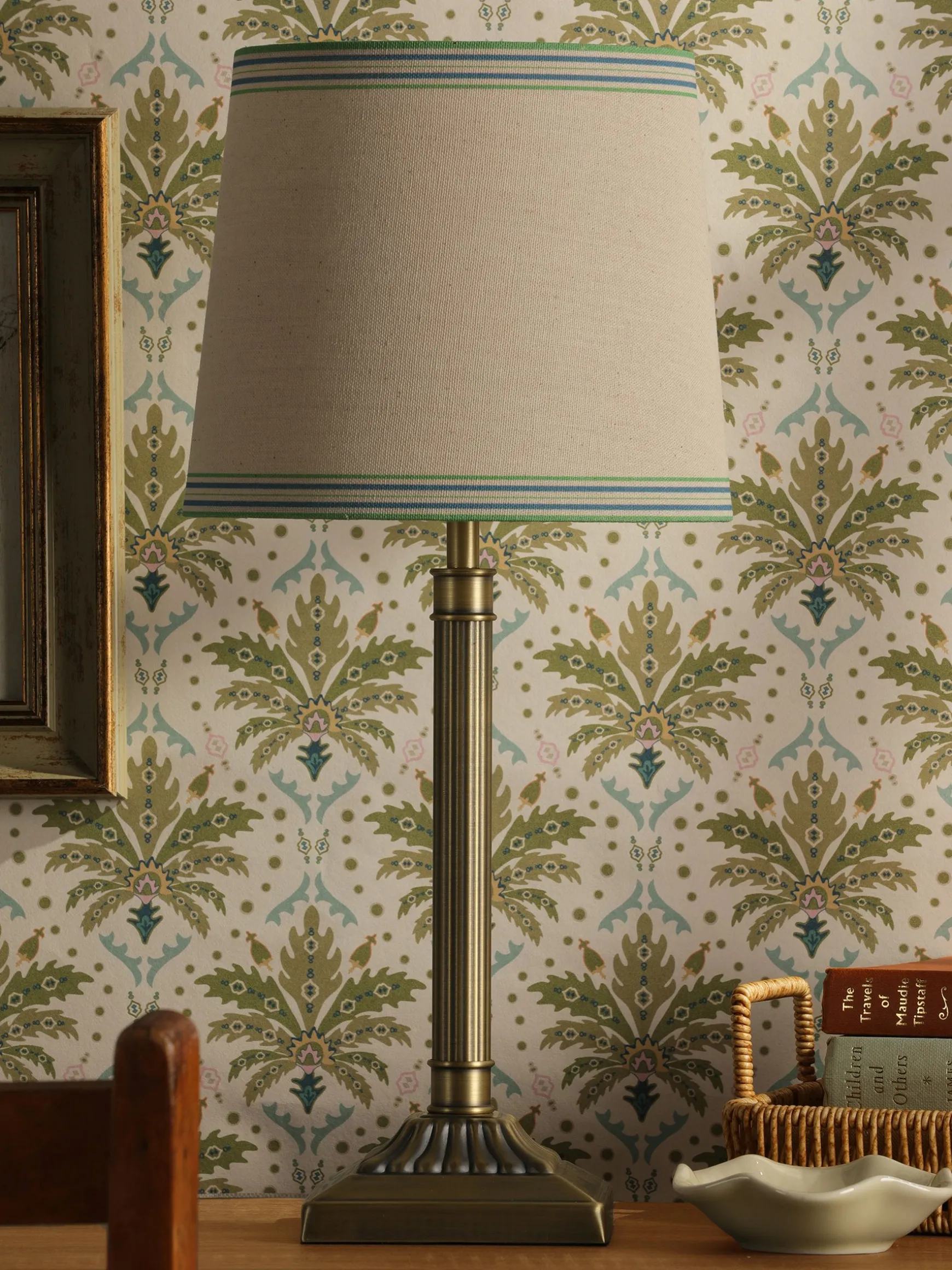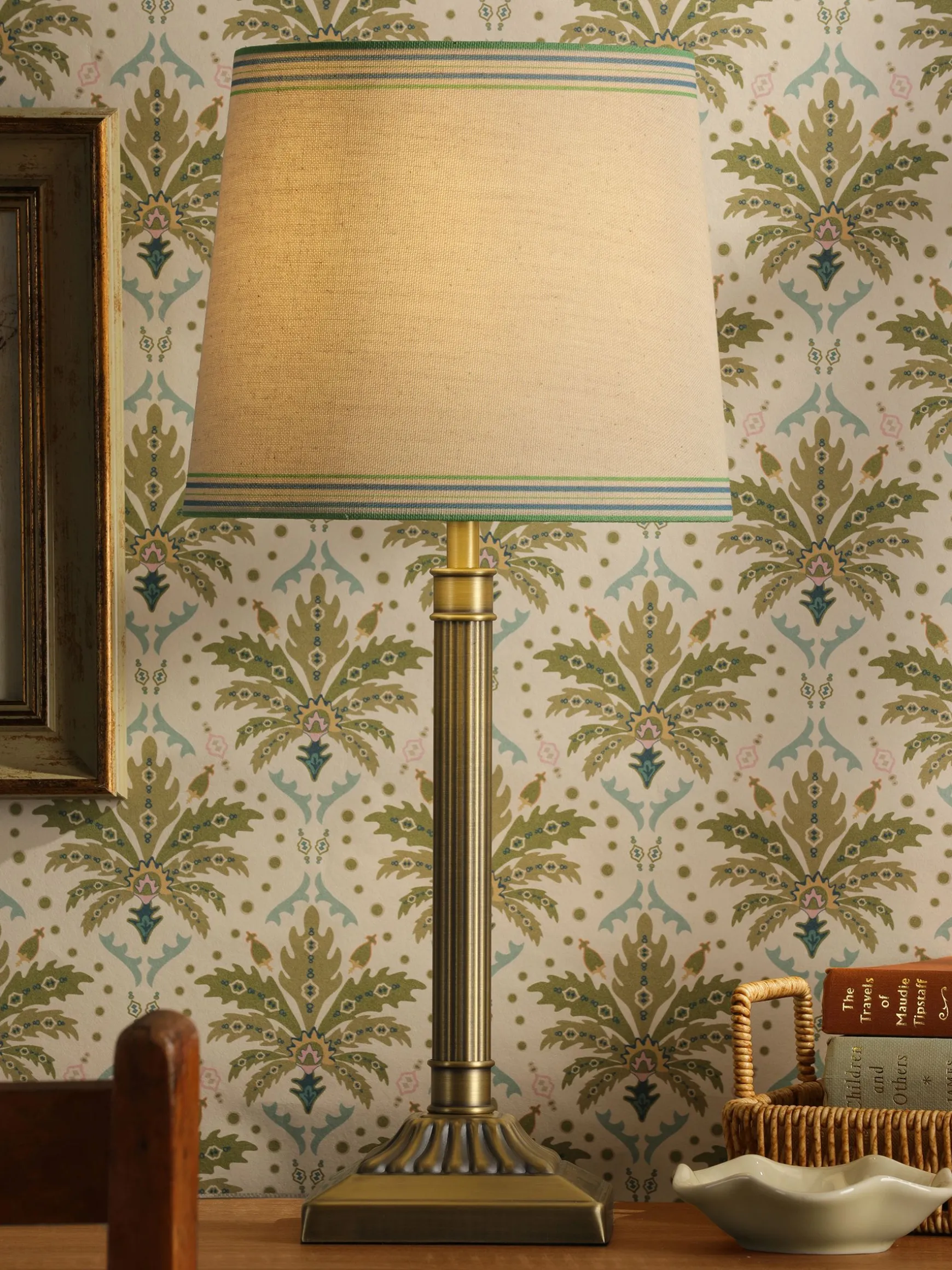 From bedside to bookcase, the Buscot table lamp will enhance any space in your home. Combining timeless style and functionality, it’s a piece that will look just as good in years to come as it does today. A decorated long column stand and square base crafted from matte antique brass creates a chic appearance. The neutral coloured linen lamp shade carries a classic tapered shape, creates a cosy glow and is trimmed with a blue striped border. Just add an early night and the latest romance bestseller. nnColumn stand with square basenDecorated matte antique brass basenLinen tapered lamp shade with bordernDi: 200mm x H.430mm