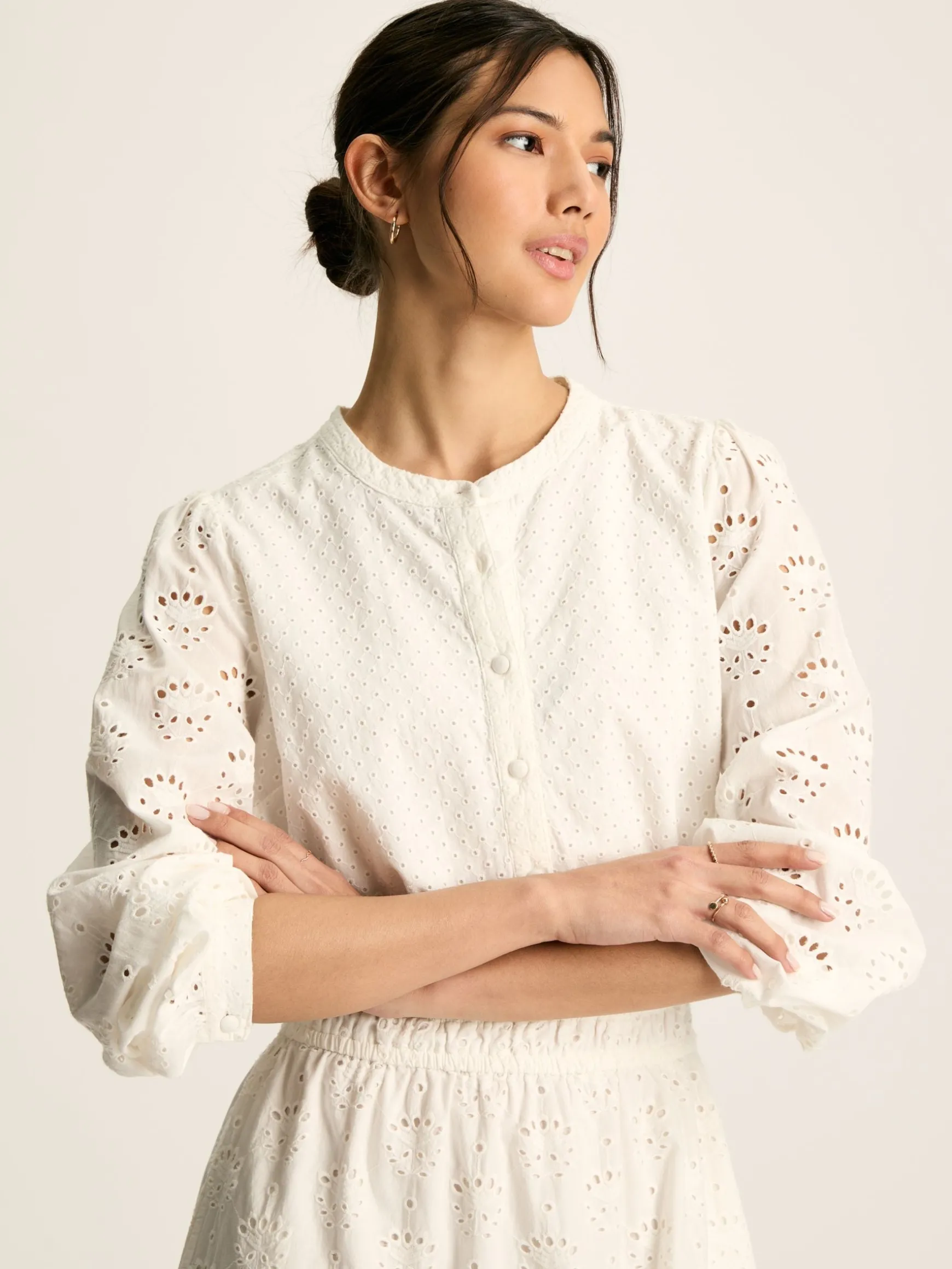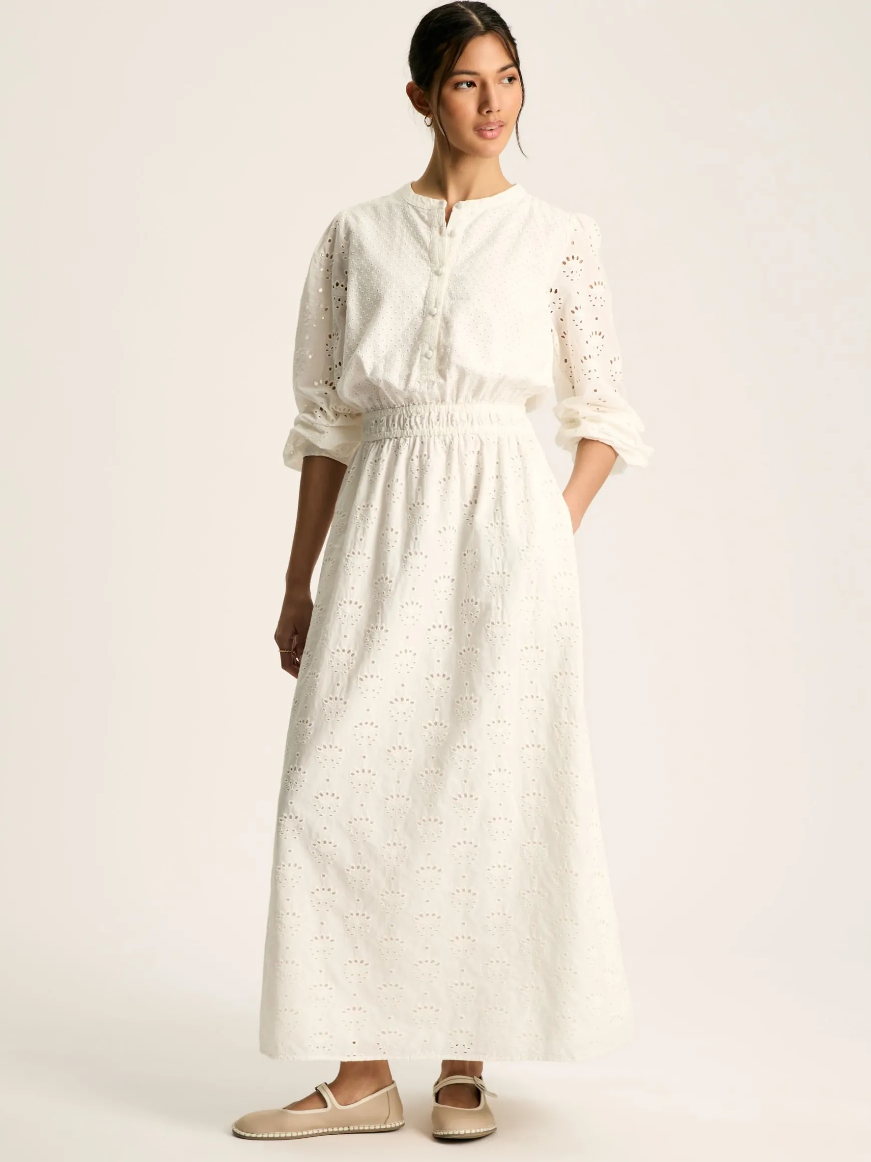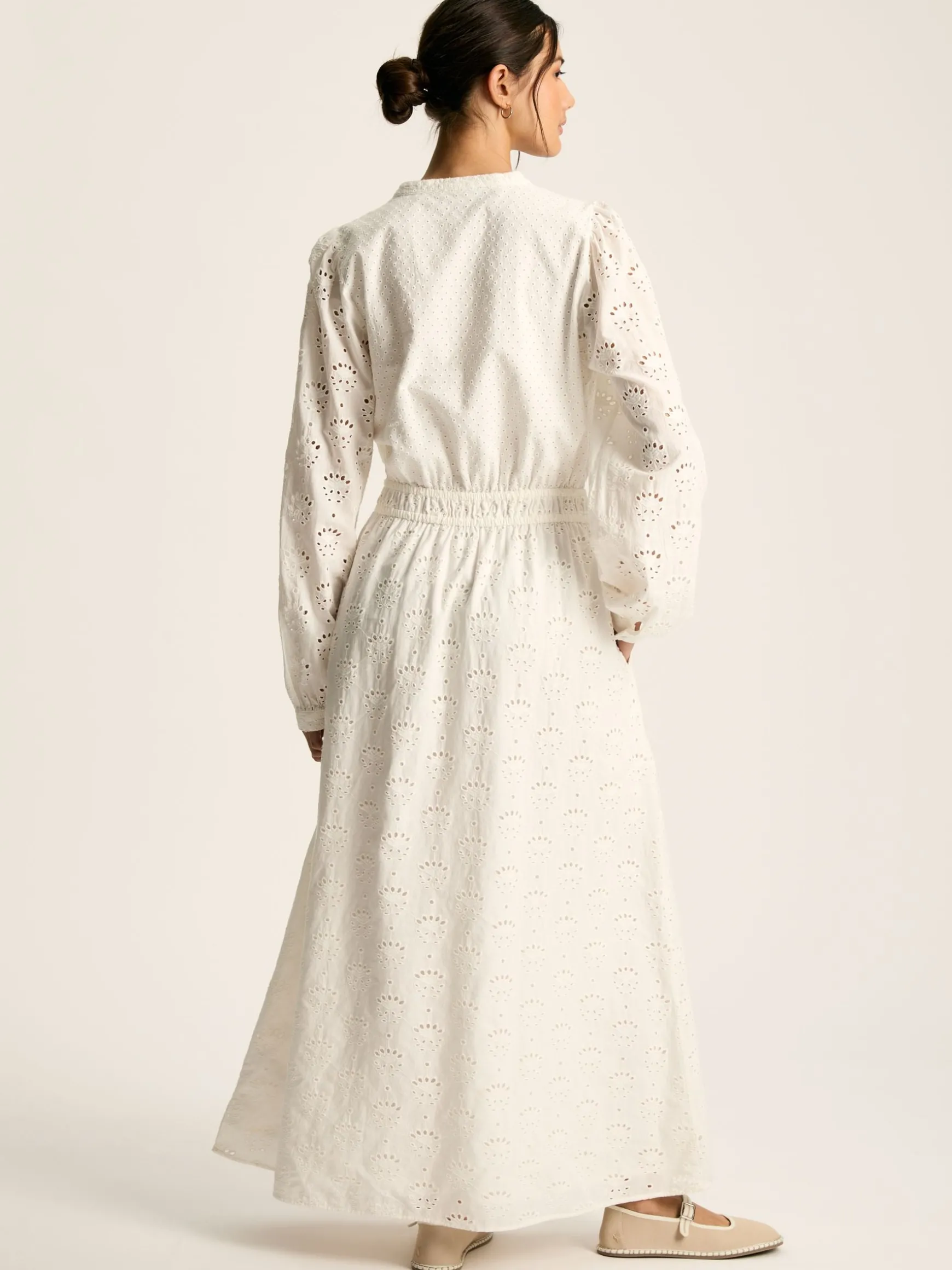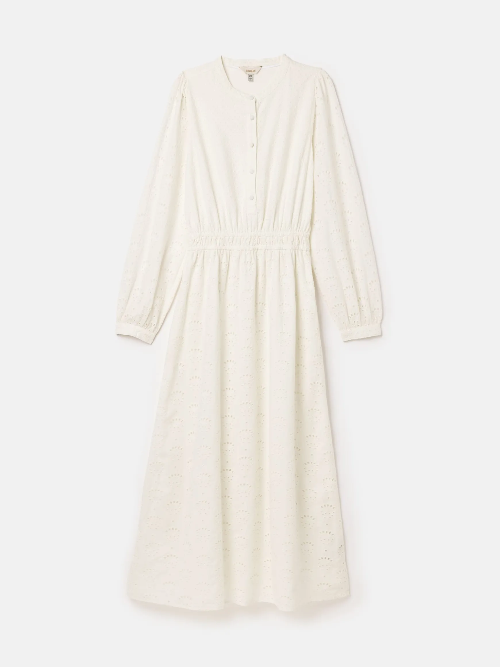 Made from 100% cotton, falling to an elegant maxi length and using a beautiful broderie anglaise cutwork technique, Cassie is the summer dress of your dreams. It has a flattering a-line shape which cinches at the waist via an elasticated panel and has a button placket to the front. The long sleeves are gathered at the shoulders and fasten with button cuffs. The body of the dress is lined for peace of mind, while the sleeves remain unlined to show-off the broderie detailing. Cotton. Maxi length. Broderie anglaise detailing. A-line shape. Elasticated waist panel. Button placket to the front. Round neck. Long sleeves with button cuffs. Lined body.