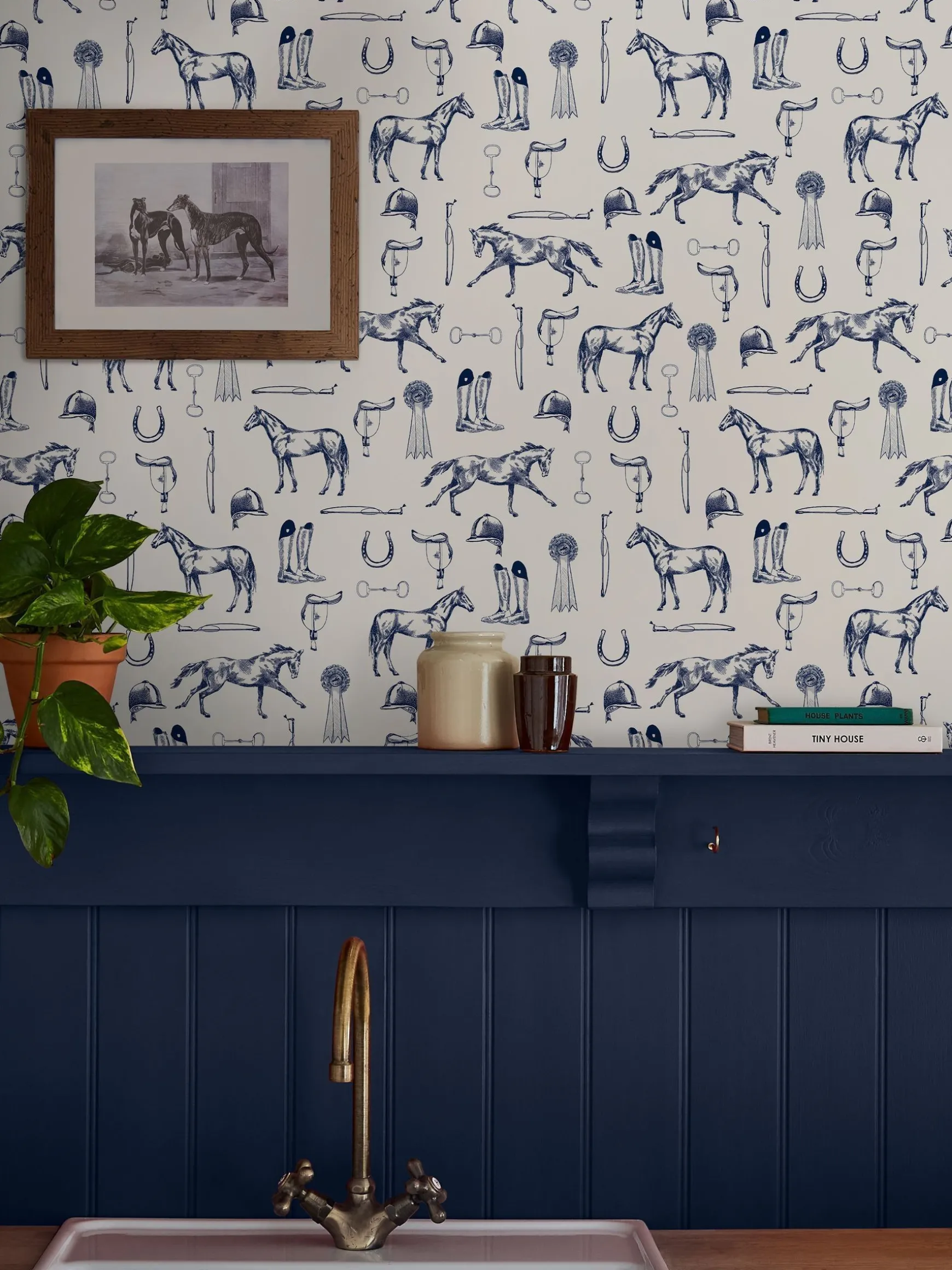 One for the equestrian lovers, this wallpaper is sure to add charm to the home. It s adorned with horses, rosettes, horseshoes, bridles and an array of riding equipment, all of which have been lovingly hand-sketched by the Joules in-house print team. The inky blue colour of the sketches sits boldly against a fresh cream background for a look that is sophisticated yet full of character. Designed to make refreshing your walls a breeze, this is an easy-hang, paste the wall wallpaper, so you can elevate your space quickly and simply. From boot rooms and bedrooms, to the downstairs loo, this is a versatile choice that will look great anywhere.