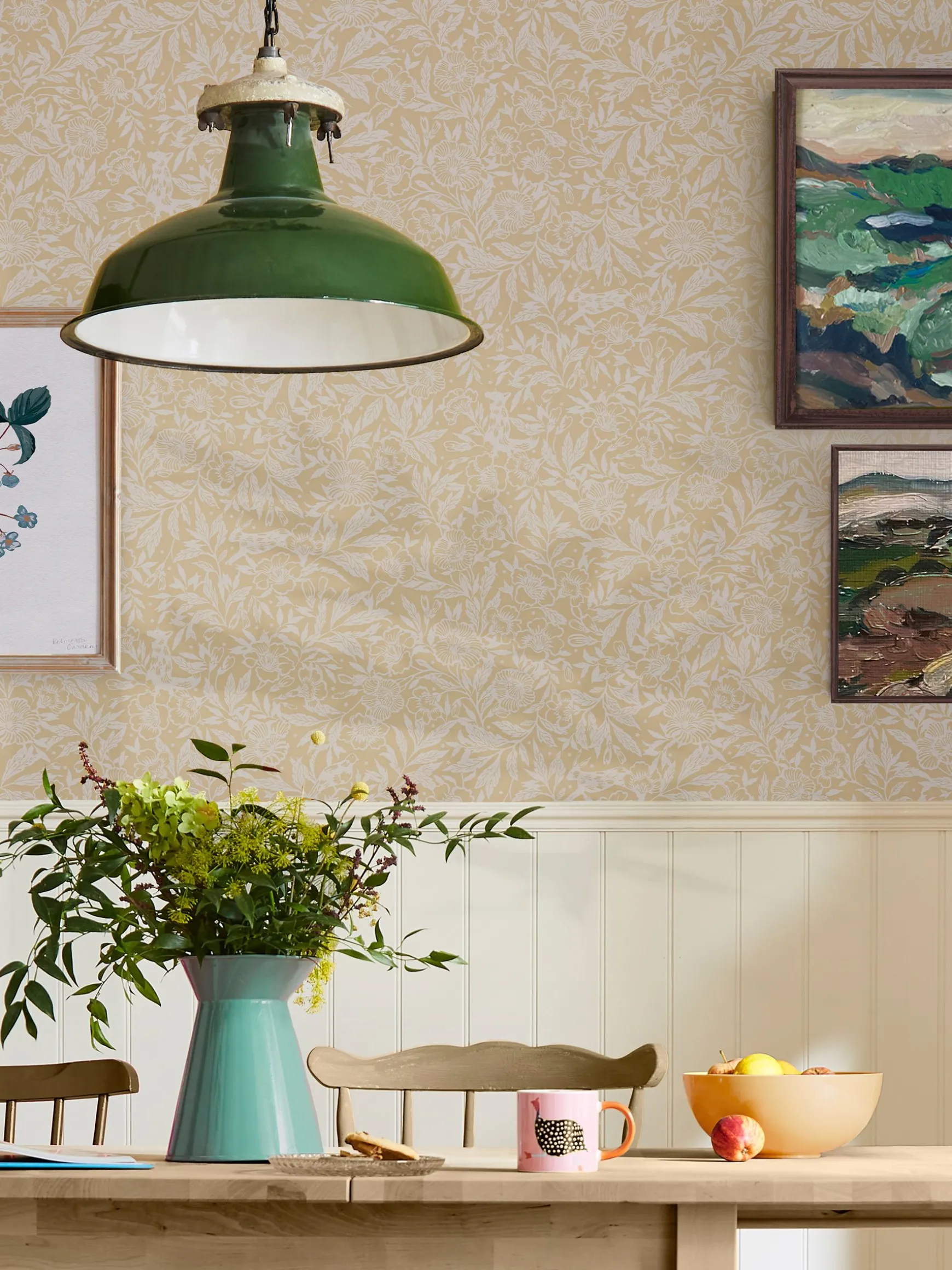 Bring classic arts and crafts style to your home, along with a touch of the British countryside. This wallpaper teams floral blooms and foliage with hidden birds perched upon branches, leaping hares and foxes surrounded by delicate stars. The more you look, the more you’ll see. This beautiful design has a large repeat for impactful scale and is printed on a matt substrate for a contemporary look and feel. This wallpaper is also paste-the-wall, making it easy to hang.